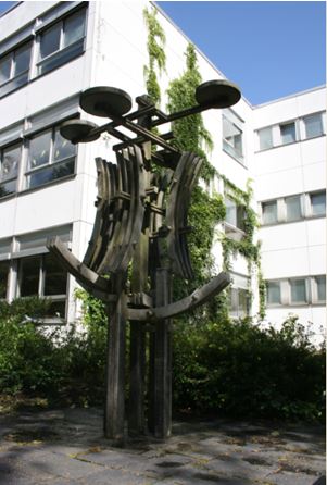 Auf einem mit schwarzen Schieferplatten belegtem Unterbau steht die abstrakte, technizistisch anmutende Metallskulptur aus Aluminium (Materialfrage nicht abschließend geklärt) auf fünf unterschiedlich hohen Vierkantstützen, deren mittlere die gesamte Skulptur zu tragen scheint. Abstrakte, mal tellerförmige, mal bogenförmige Elemente sind waagerecht oder senkrecht angeordnet. Der Titel der Skulptur deutet auf eine Nutzung als Brunnenfigur. Eine Brunnenfunktion ist heute nicht mehr vorhanden (Jörg Kuhn).