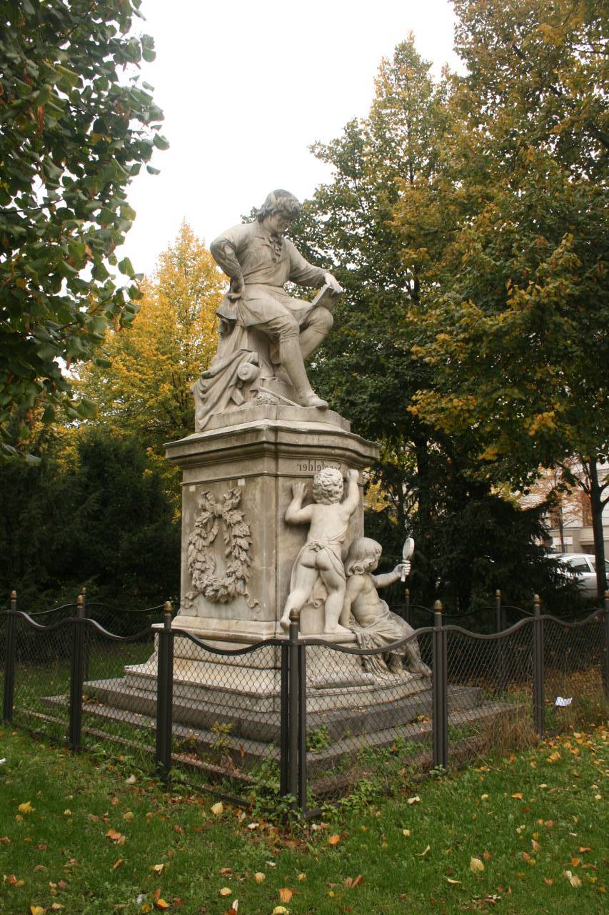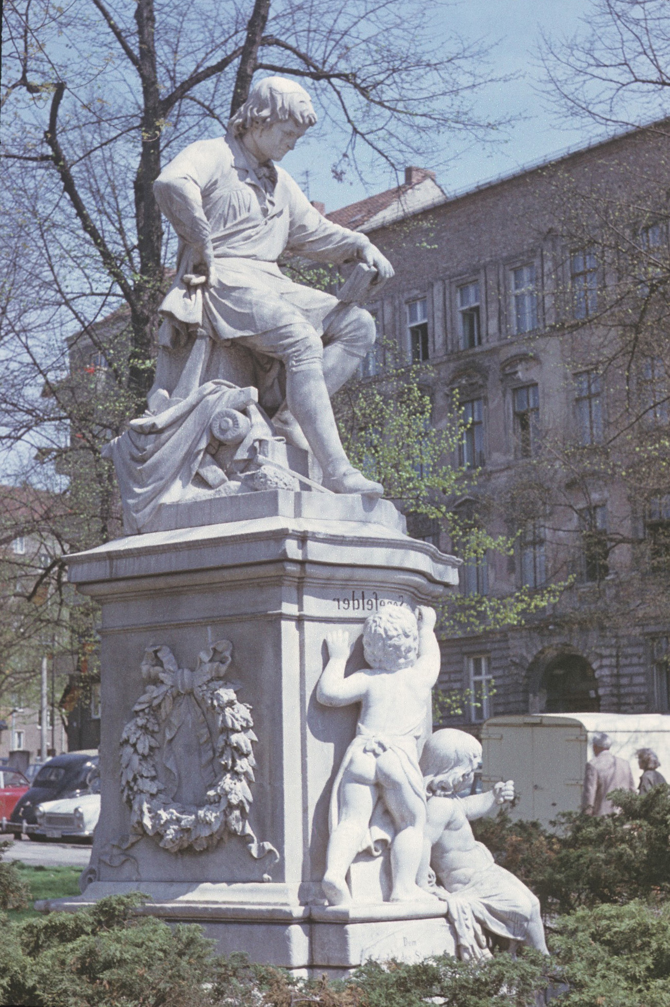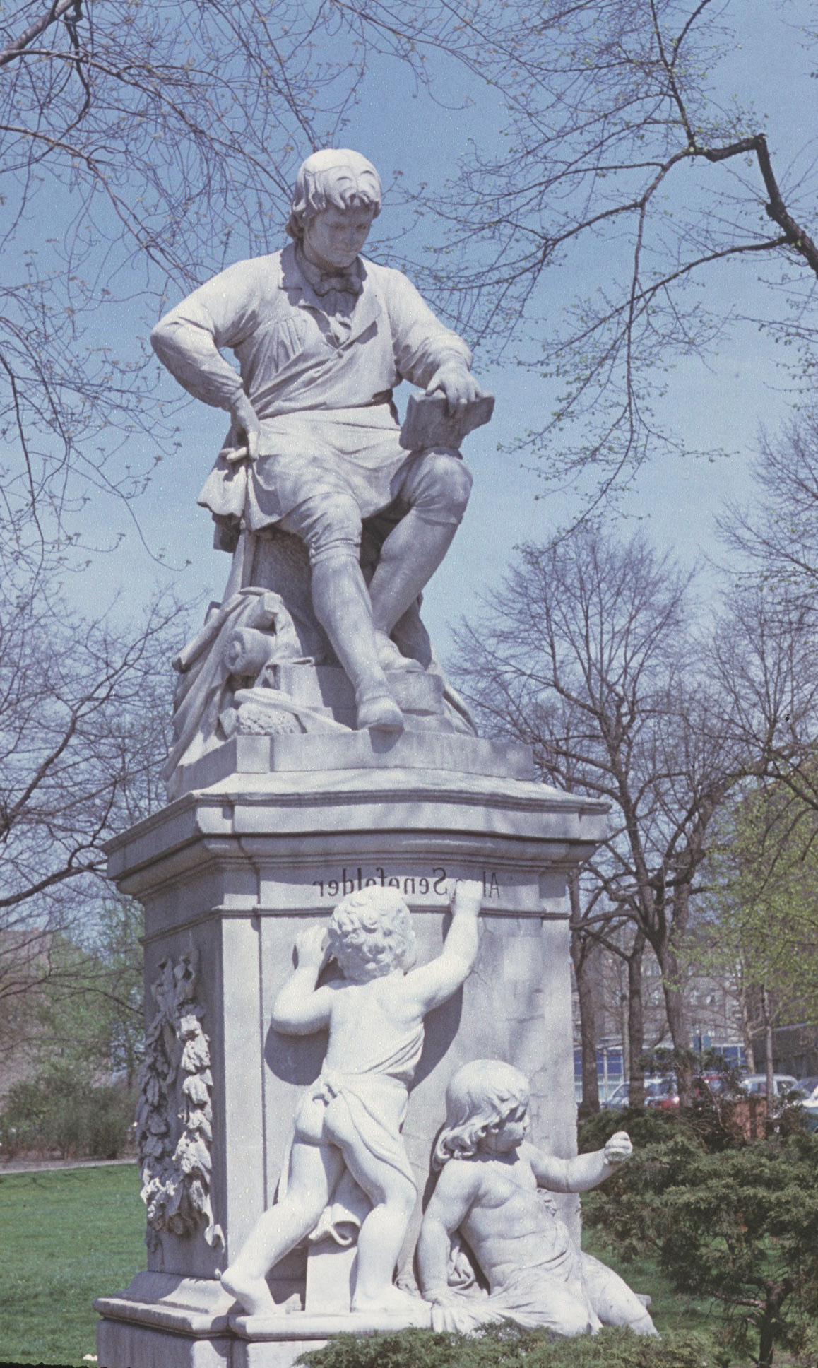 „Das Denkmal Senefelders, des verdienstvollen Erfinders der Lithographie (gest. 1834), an der Ecke der Schönhauser Allee und Weißenburger Straße. Der Künstler (R. Pohle) hat den Gefeierten bei der Arbeit sitzend dargestellt. In die schlichte Arbeitstracht gekleidet, betrachtet er eifrig eine lithographische Platte. Das zu seinen Füßen liegende Stück Zeug soll auf Senefelders Verdienste um die Kattundruckerei hindeuten. Die bei der Schriftlithographie zur Verwendung gelangende umgekehrte Schrift (Spiegelschrift, weil im Spiegel lesbar) deutet ein Knabe an, der den Namen des Erfinders in umgekehrter Schrift auf den Fries des Sockels schreibt; ein kleines Mädchen versucht, die Schrift im Spiegel zu lesen. Das Denkmal Pohles ist eine der schönsten Arbeiten der modern-realistischen Schule. Aufgestellt 1892“ (Müller-Bohn, 1905).