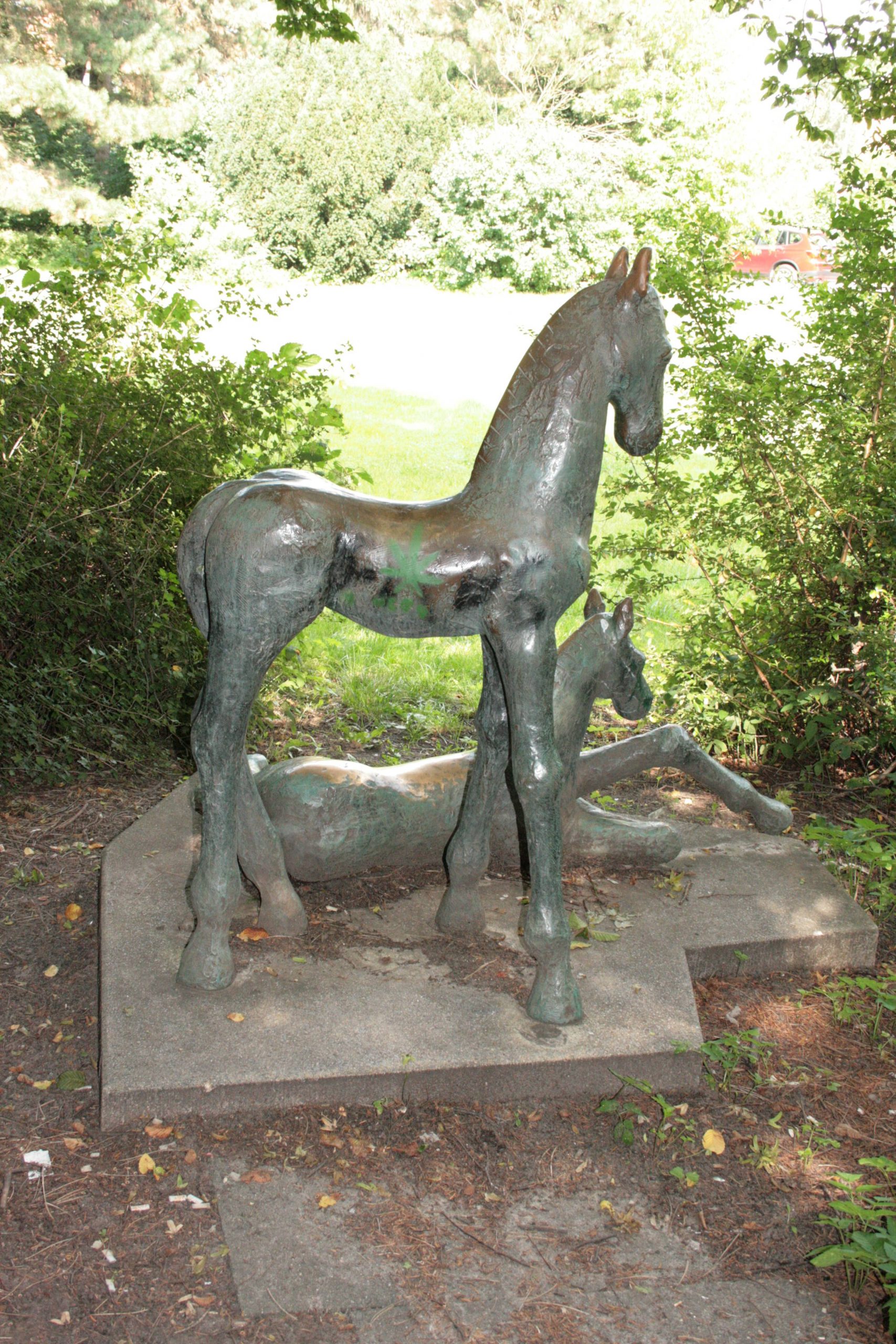 In einer Grünanlage rechts vor dem Gebäude der vor der Fritz-Karsen-Schule im Gebüsch liegt eine irregulär geformte Betonplatte. Auf ihr wurde die plinthenlose Gruppe zweier unterlebensgroßer Fohlen montiert, eines ist liegend dargestellt, eines stehend mit erhobenem Kopf. Die Gruppe trägt am rechten Hinterhuf des stehenden Fohlens eine Bezeichnung (Susanne Kähler).