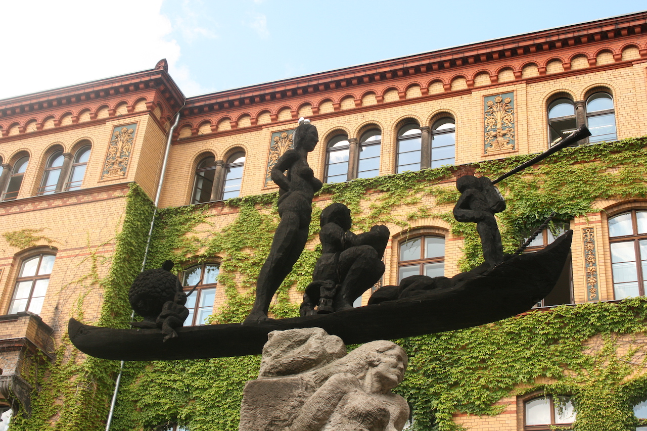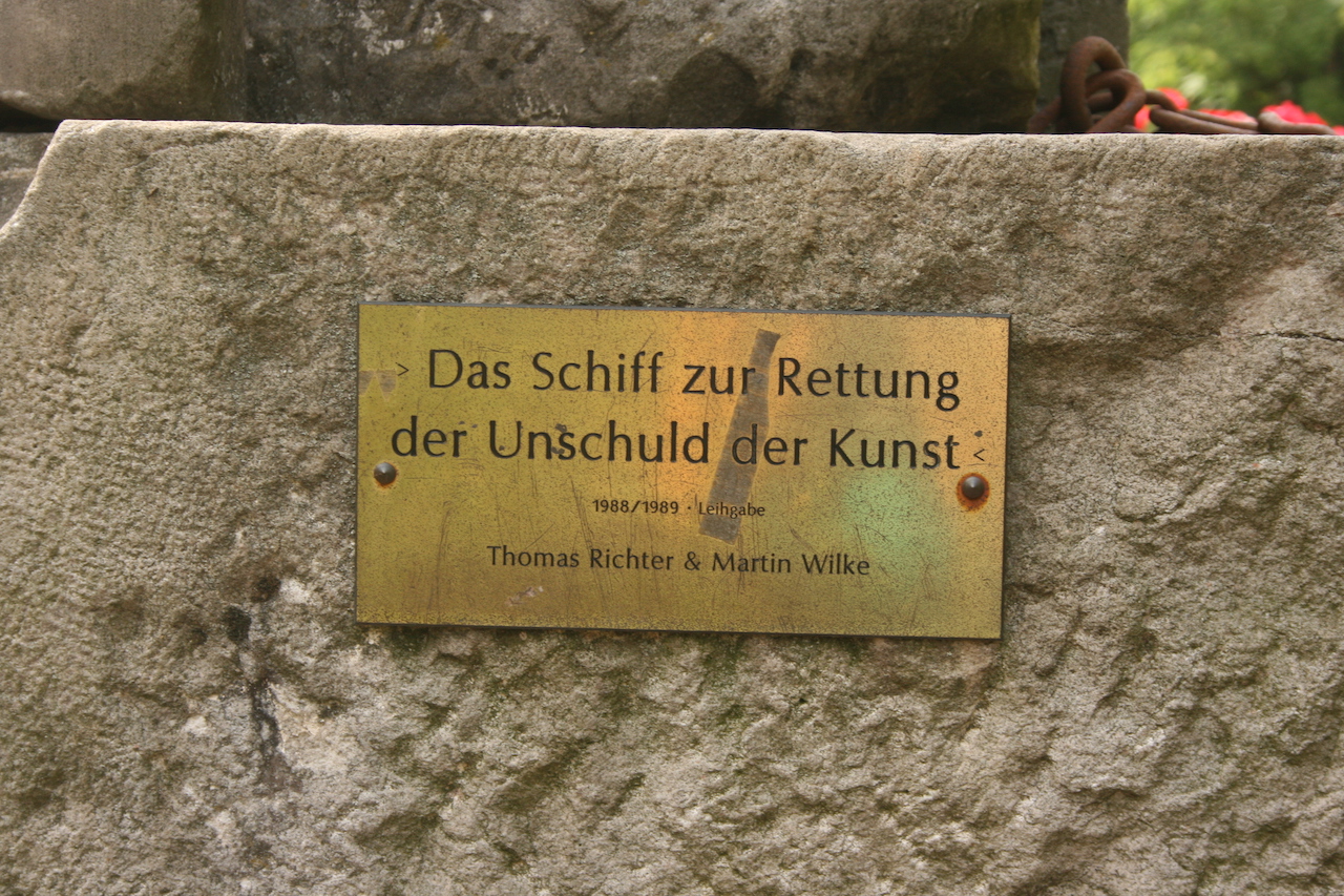 Den Sockel bildet eine Spolie in Gestalt eines Säulenschaftes aus Sandstein mit Basis und Maueranschluss). Darauf wurde die Sandsteinfigur, der Oberkörper einer abstrahierten, unbekleideten weiblichen Figur gesetzt, die wie eine Galionsfigur wirkt und im Zusammenhang mit der Schiffsthematik auch diese Funktion einnimmt. Darauf ruht ein schmales Schiff aus dunkel gefasstem Holz mit Edelstahlelementen. Sechs sehr unterschiedliche Figuren fungieren als Besatzung des Schiffes, darunter ein Trompeter am Bug, eine stehende und eine sitzende Frau in der Mitte und ein kleiner unter einem Baum sitzender Teufel im Heck. Ein rechteckiges, im Bereich der Säulenbasis angeschraubtes Messingschild mit schwarz hinterlegter Schrift benennt Künstler und Werk (Jörg Kuhn, Susanne Kähler).