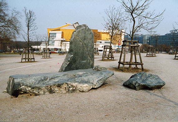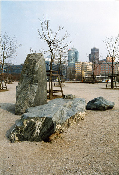 Das plastische Objekt besteht aus drei aus dem gleichen Material (grüner Marmor) gearbeiteten Teilstücken, die in Form und Größe erheblich differieren. Das Marmormaterial ist teilweise in unbearbeitetem, teilweise in geglättetem, polierten Zustand zu finden. Die Höhendominante wird von einem stehenden massigen, stelenartigen Block vorgegeben, dessen größere Seitenflächen poliert sind. Quer vorgelagert liegt ein ähnlicher Block von irregulärer Kontur. Besonders auffällig ist im östlichen Bereich der Oberseite ein nicht wegpoliertes, stehen gelassenes Materialstück, das die sonst nach Westen hin leicht abfallende Oberfläche überragt. Den beiden genannten Blöcken ist ein bedeutend kleinerer, findlingsartiger Stein zugeordnet, der die beiden anderen Teile der Plastik durch sein geringes Volumen noch mächtiger erscheinen lässt (Jörg Kuhn, Susanne Kähler).