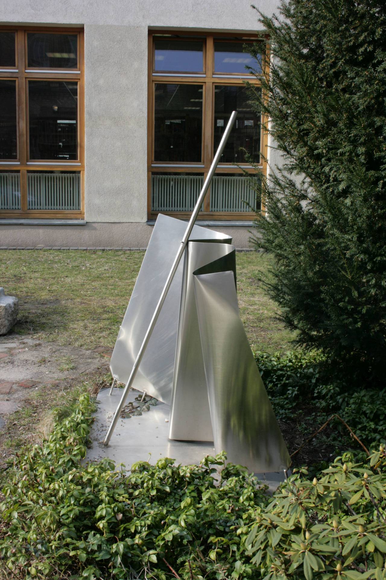 Auf rechteckiger Platte aus Edelstahl steht die Plastik „Welle mit Stab“, bestehend aus einem wellenförmig geformten, auf einer Kante aufgeständerten Stahlblech. Diagonal an die „Welle“ angelehnt und am oberen Ende verschraubt ist ein Stab, d. h. ein ebenfalls aus Edelstahl bestehendes Rohr. Die Deutung des abstrakten Objekts ist offen, Klangwellen, die aus dem Schlagen des Stabes gegen das stählerne Blech erzeugt werden könnten, werden assoziiert (Susanne Kähler, Jörg Kuhn).