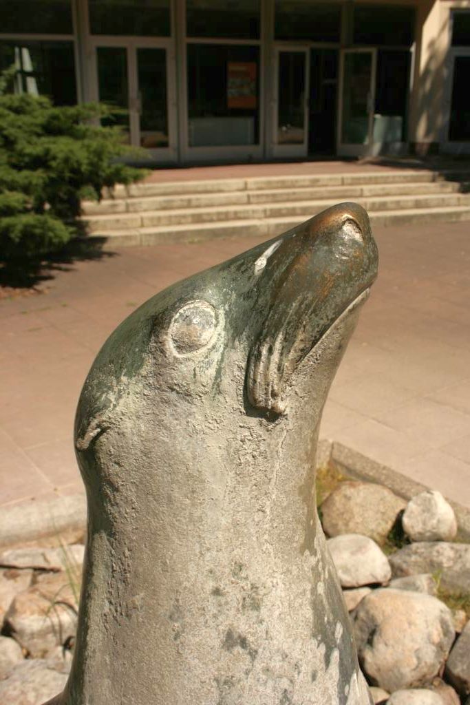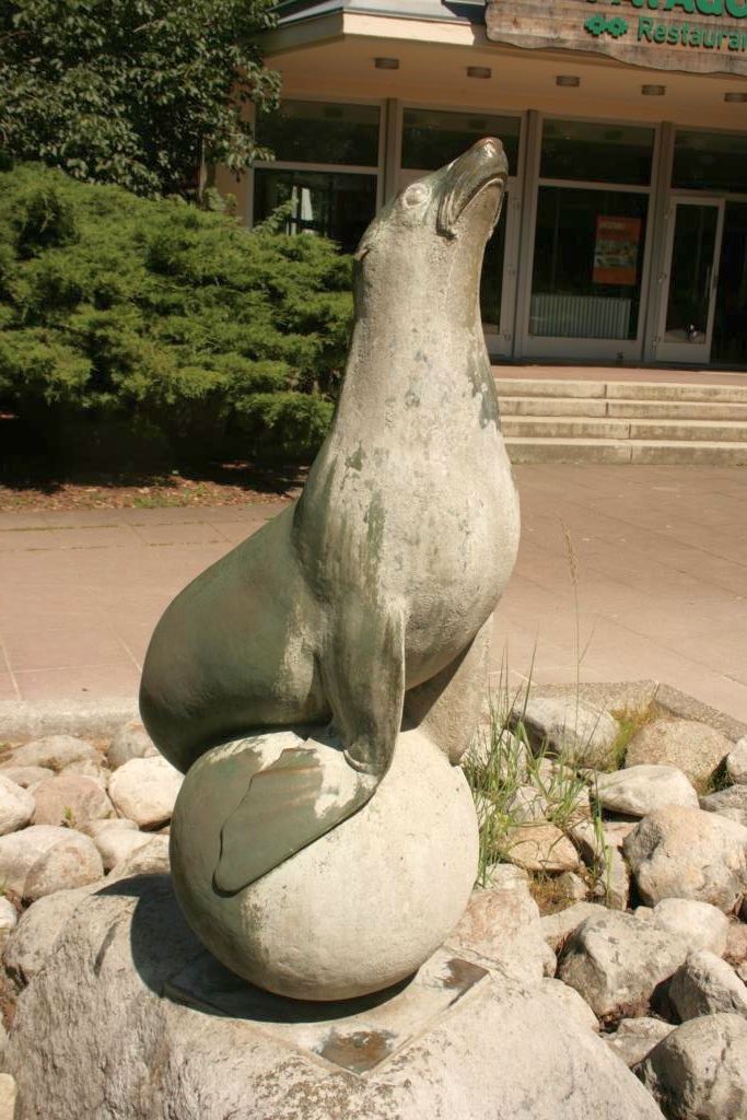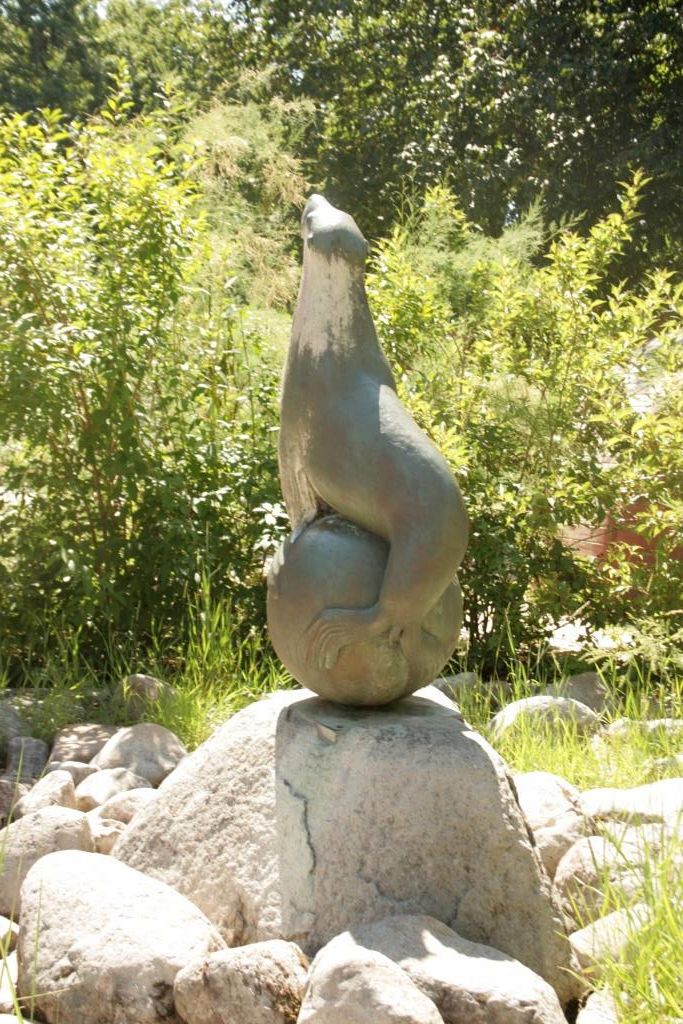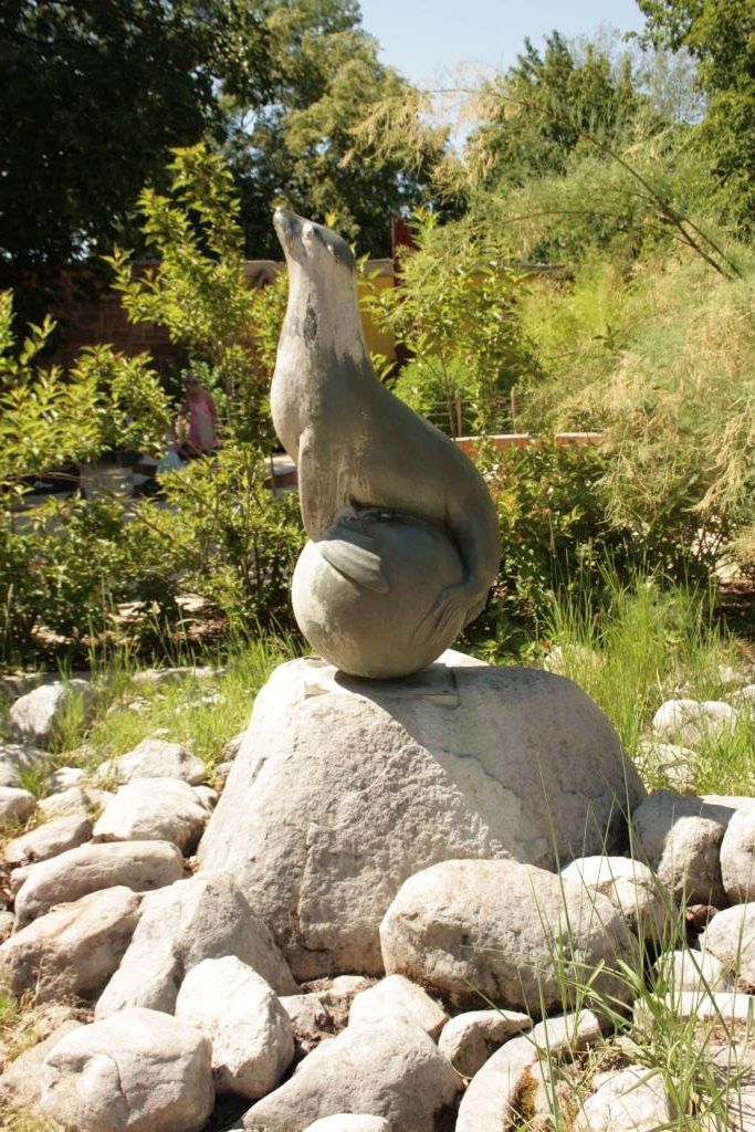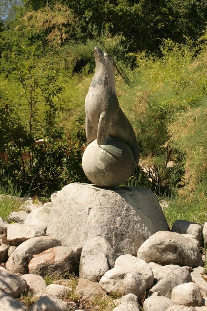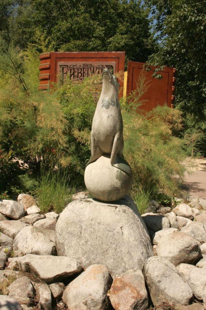 Innerhalb eines durch weiße Natursteinbrocken belegtes flaches „Brunnenbecken“ steht auf einem Natursteinbrocken die Figur eines auf einer Kugel sitzenden, naturnah gestalteten Seelöwen. Die Plastik selbst ist nicht als Träger einer inneren Wasserleitung konzipiert. Vielmehr steht die Plastik inmitten von Wasserstrahlen, die durch im Boden vertiefte Düsen ihren Strahl nach oben bzw. auf die Figur hin ausrichten.