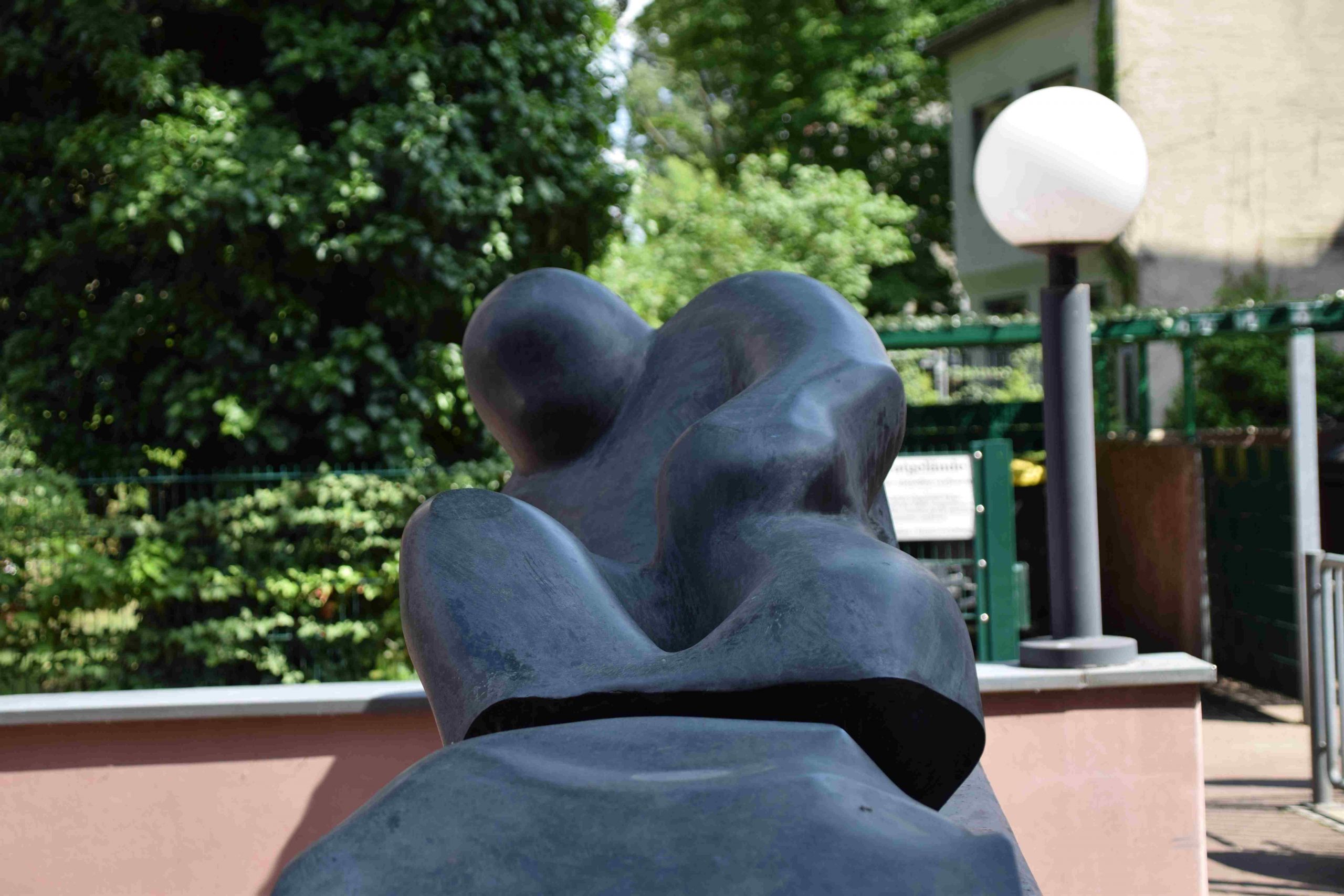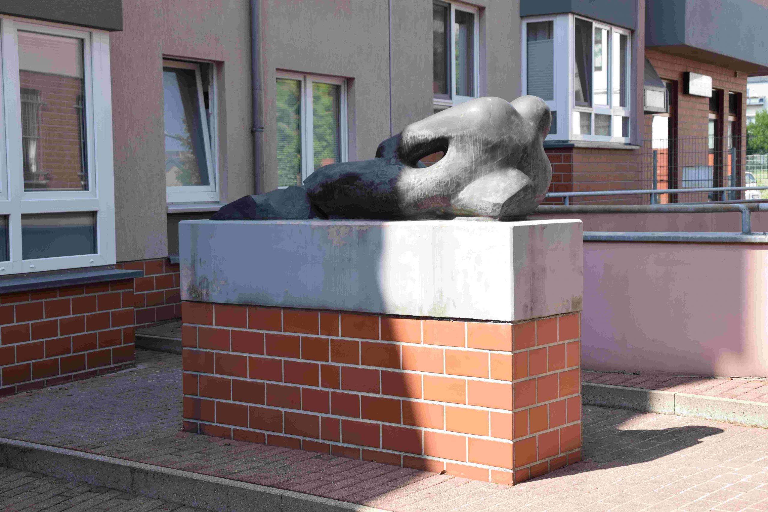 Abstrakt aufgefasste menschliche Liegefigur auf einem längsrechteckigen Sockel. Der Sockel ist in zwei Zonen unterteilt, davon die obere betonsichtig beziehungsweise betongrau gefasst, die untere mit Klinkermauerwerk verkleidet (Max Braun).