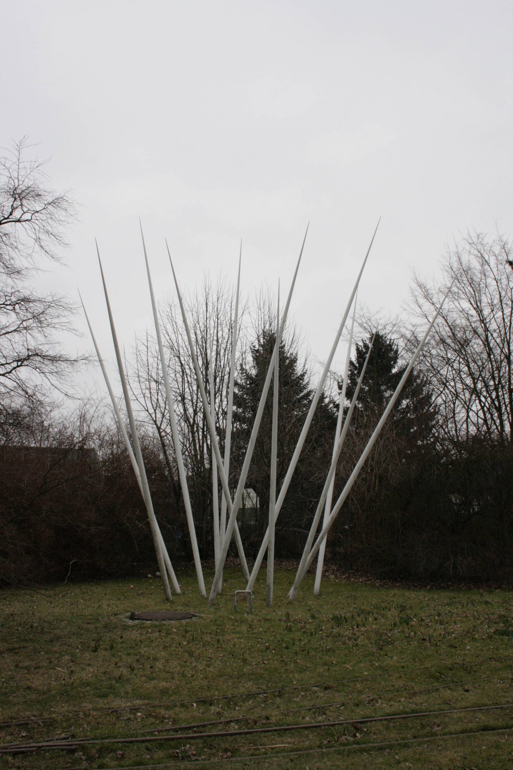 Die Skulptur besteht aus zwei Gruppen von je 12 „Speeren“. Der Titel lautet „12 Speere der Sonne entgegen geworfen – 12 Speere der Sonne hinterhergeworfen“. Die östliche Gruppe zeigt weiß gefasste „Speere“, die westliche Gruppe schwarz gefasste „Speere“. Die „Speere“ stecken in Metallschuhen im Boden. Es sind oben spitz zulaufende, lackierte Stahlstangen, die in unterschiedlicher Dichte zueinander und unterschiedlicher Neigung ausgerichtet stehen. Sie sind alle etwa 8 Meter lang und haben einen Durchmesser von etwa 10 cm an der stärksten Stelle (Susanne Kähler).
