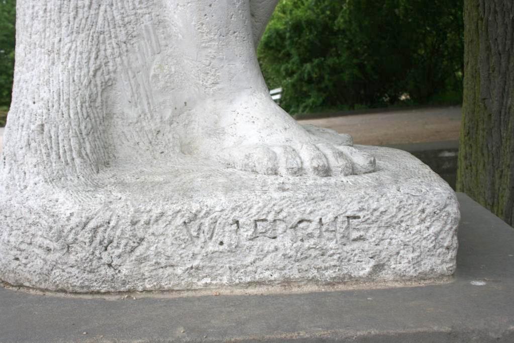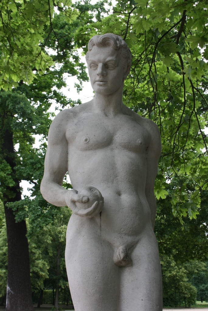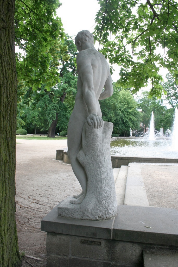 Männliche unbekleidete Figur im leichten Kontrapost. Der linke Arm stützt sich mit der Hand auf einem Baumstumpf ab. Der rechte Arm ist leicht angewinkelt nach vorne geführt, die Hand geöffnet.