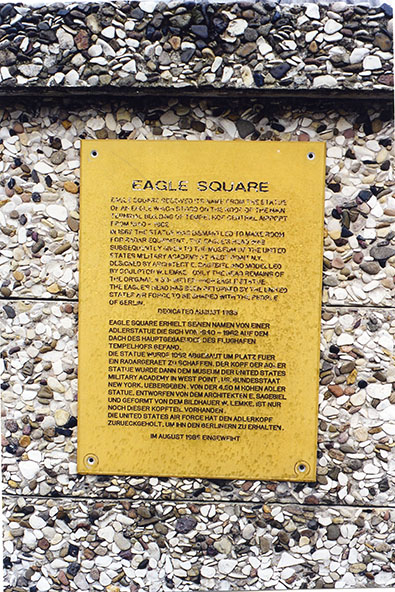 »EAGLE SQUARE / EAGLE SQARE RECEIVED ITS NAME FROM THE STATUE / OF AN EAGLE WHICH STOOD ON THE ROOF OF THE MAIN / BUILDING OF TEMPELHOF CENTRAL AIRPORT / FROM 1940-1962 / IN 1962 THE STATUE WAS DISMANTLED TO MAKE ROOM / FOR RADAR EQUIPMENT. THE EAGLE HEAD WAS / SUBSEQUENTLEY GIVEN TO THE MUSEUM OF THE UNITED / STATES MILITARY ACADEMY AT WEST POINT N.Y. / DESIGNED BY ARCHITECT E. SAGEBIEL AND MODELLED / BY SCULPTOR W. LEMKE. ONLY THE HEAD REMAINS OF / THE ORIGINAL 4,50-METER-HIGH EAGLESTATUE. THE EAGLES HEAD BEEN RETOURNED BY THE UNITED / STATES AIR FORCE TO BE SHARED WITH THE PEOPLE / OF BERLIN. / DEDICATED AUGUST 1985 / EAGLE SQUARE ERHIELT SEINEN NAMEN VON EINER / ADLERSTATUE DIE SICH VON 1940 - 1962 AUF DEM / DACH DES HAUPTGEBAEUDES DES FLUGHAFEN / TEMPELHOFS BEFAND. / DIE STAUE WURDE 1962 ABGEBAUT UM PLATZ FUER / EIN RADARGERAET ZU SCHAFFEN. DER KOPF DER ADLER / STATUE WURDE DANN DEM MUSEUM DER UNITED STATES / MILITARY ACADEMY IN WEST POINT, US. BUNDESSTAAT / NEW YORK, UEBERGEBEN. VON DER 4,50M HOHEN ADLER / STATUE, ENTWORFEN VON DEM ARCHITEKTEN SAGEBIEL / UND GEFORMT VON DEM BILDHAUER W. LEMKE, IST NUR / NOCH DIESER KOPF VORHANDEN. DIE UNITED STATES AIRFORCE HAT DEN ADLERKOPF ZURUECKGEHOLT, UM IHN DEN BERLINERN ZU ERHALTEN. / IM AUGUST 1985 EINGEWEIHT«