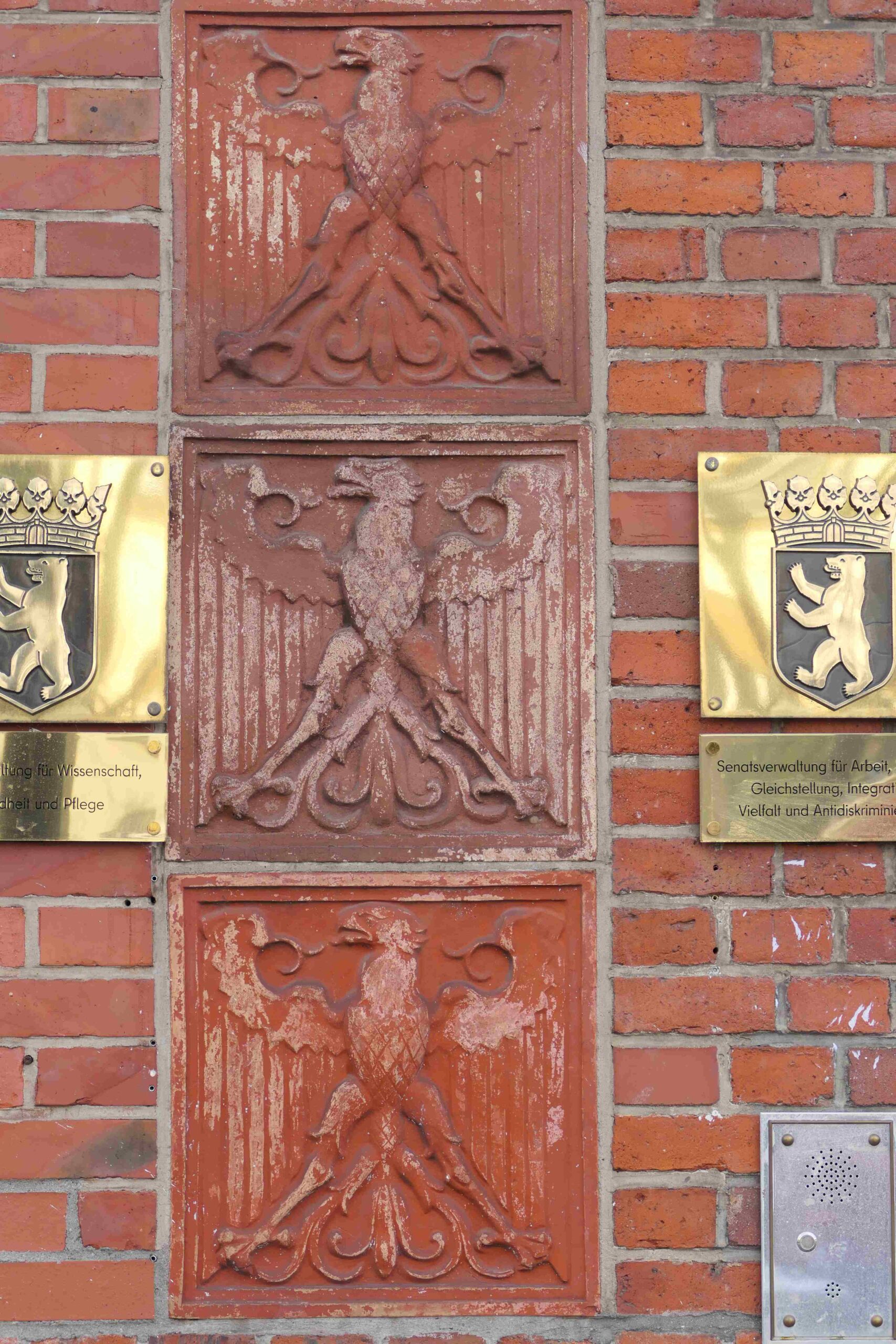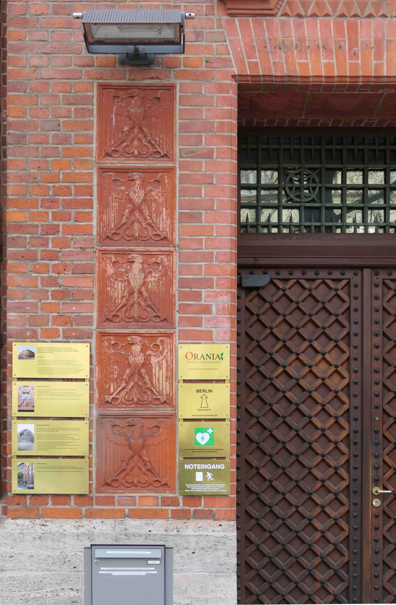 Der Eingang der Reichsschuldenverwaltung in der Oranienstraße ist zu beiden Seiten gerahmt von je fünf identischen Adlerreliefs. Oberhalb des Portal befindet sich ein großes Adlerwappen (Nicola Vösgen).