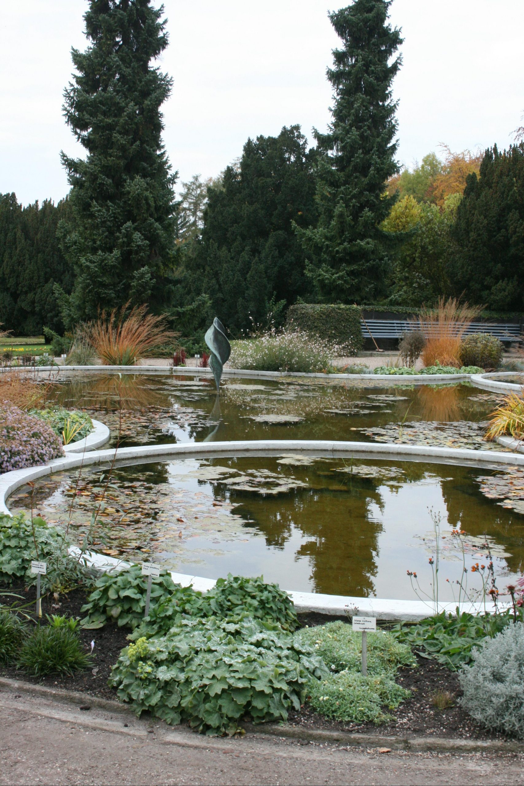 Das um 1900 vermutlich nach Entwurf von Baurat Körner errichtete Brunnenbecken zitiert barocke Brunnenbecken, ist aber eindeutig ein Werk des Jugendstils. Im Zentrum des Beckens steht auf einem Sockel die naturabstrahierende Bronzeplastik der „Euglena tripteris“ oder „Schönalge“, ein Werk der ehemaligen Direktorin des Botanischen Museums im Botanischen Garten, Irma Langhinrichs. (Jörg Kuhn)