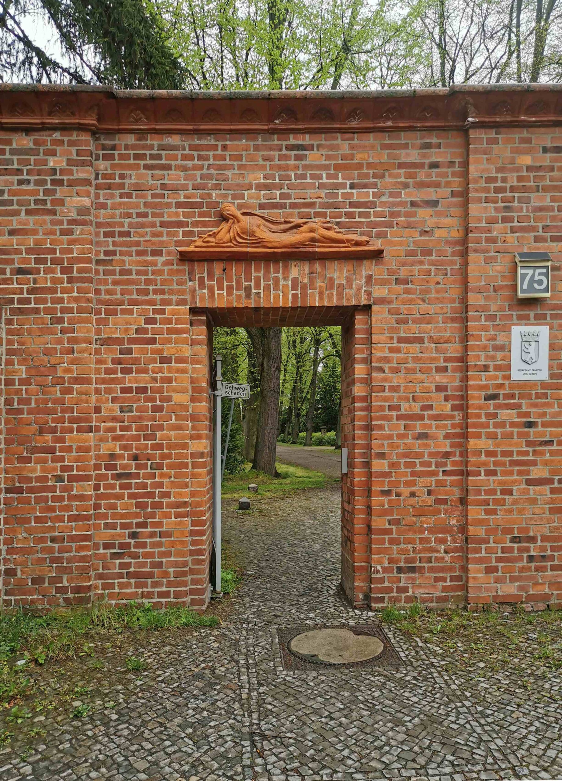 Der südliche Eingang zum Städtischen Friedhof Weißensee befindet sich in der Schönstraße. Er besteht aus zwei seitlichen Durchgängen aus Backsteinpfeilern. Den Bereich oberhalb des Türsturzes zieren Terrakotta-Reliefs mit den Darstellungen liegender Allegorien (Nicola Vösgen).