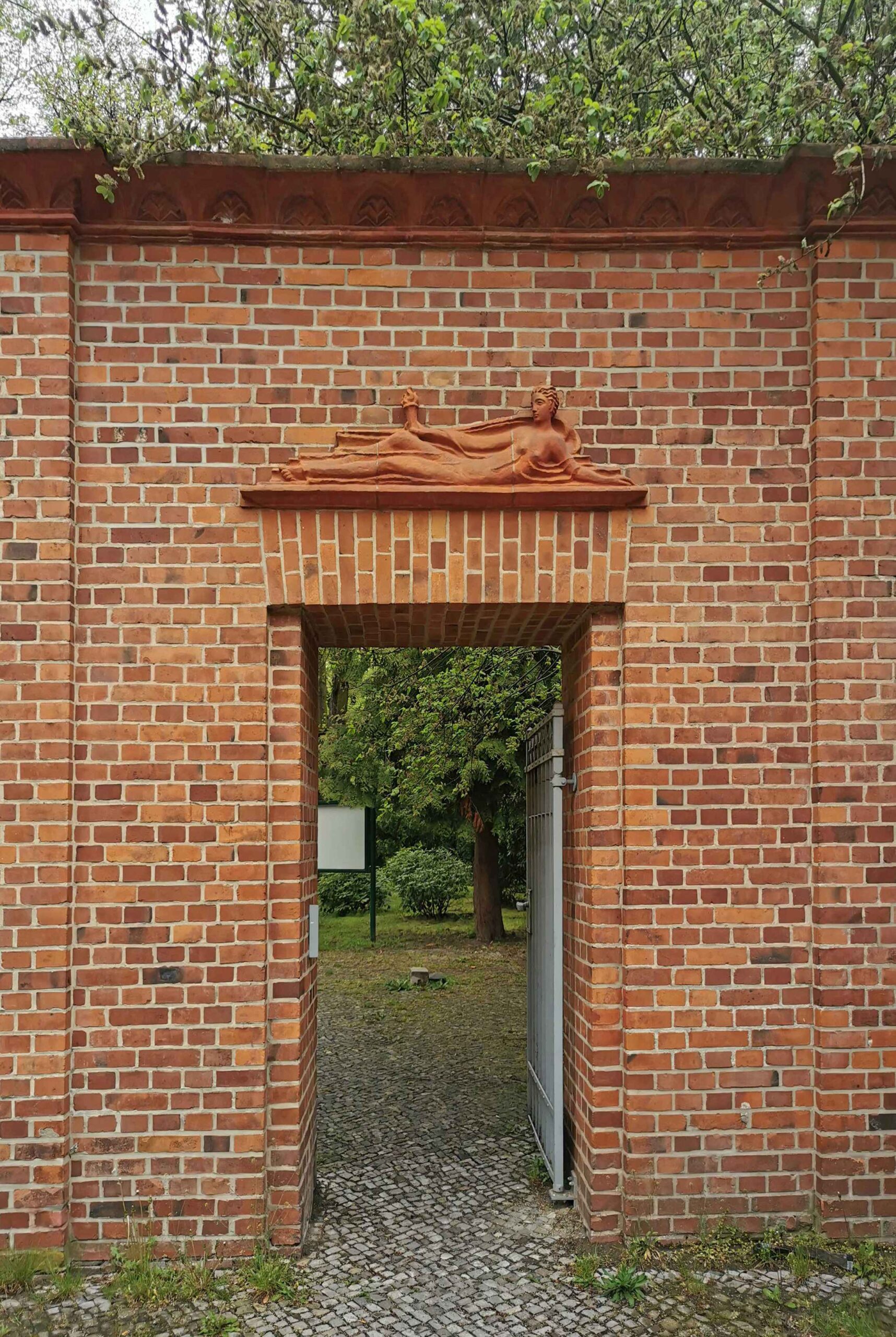 Der südliche Eingang zum Städtischen Friedhof Weißensee befindet sich in der Schönstraße. Er besteht aus zwei seitlichen Durchgängen aus Backsteinpfeilern. Den Bereich oberhalb des Türsturzes zieren Terrakotta-Reliefs mit den Darstellungen liegender Allegorien (Nicola Vösgen).