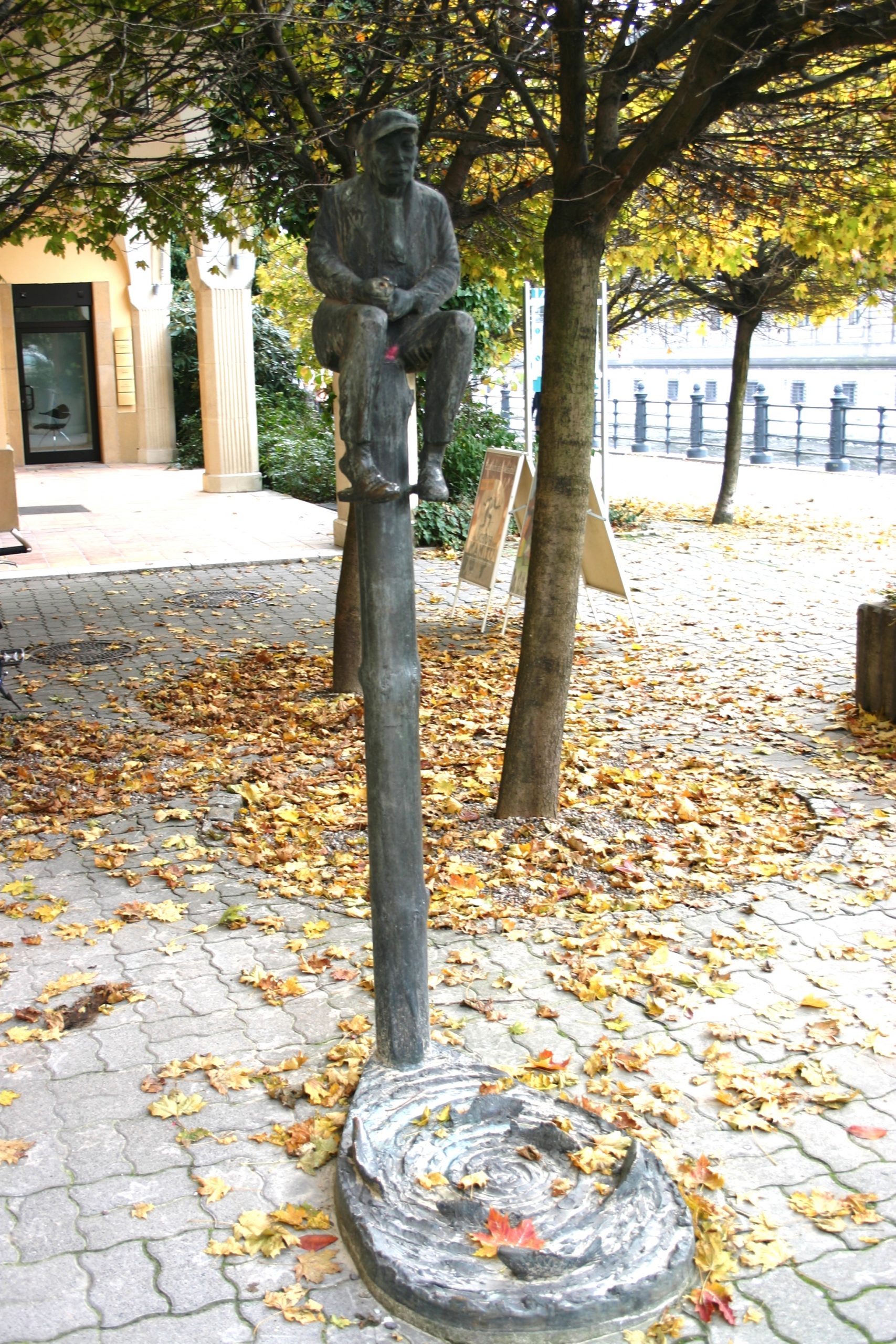 Plastik mit der Darstellung eines auf hohem Pfosten (Duckdalben) sitzenden Mannes, der in dem in etwa tropfenförmig verkürzt formulierten, stilisiert bewegten Gewässer („Phinte“) vor ihm nach den hier in üppiger Zahl sich tummelnden Fischen angelt. Naturnah gestaltete Figur eines schlicht bekleideten Mannes mit Schirmmütze und festem Schuhwerk. Die gestalterische Überhöhung des Motivs durch die hohe Aufständerung der Figur und die liebevoll und fantasievoll gestalteten Details tragen zu einer gelungenen Formulierung des Themas bei (Jörg Kuhn).