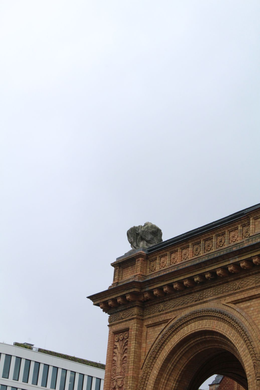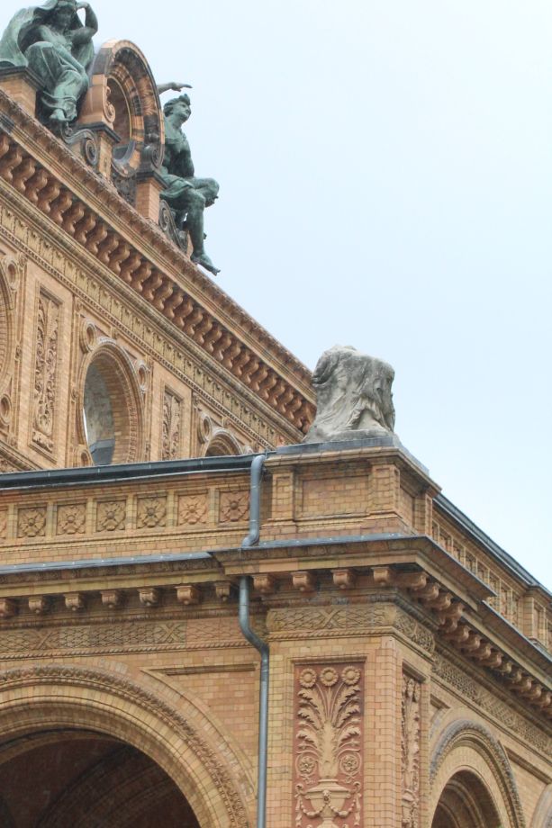 Auf den Ecken der Vorhalle des Empfangsgebäudes des Anhalter Bahnhofes befinden sich zwei überlebensgroße, nur als Torsen erhaltene weibliche Statuen. Die sitzenden Figuren halten Wappenschilde für Anhalt (links) und Berlin (rechts) als Verkörperung der Eisenbahn-Gesellschaft auf ihren Knien (Nicola Vösgen).
