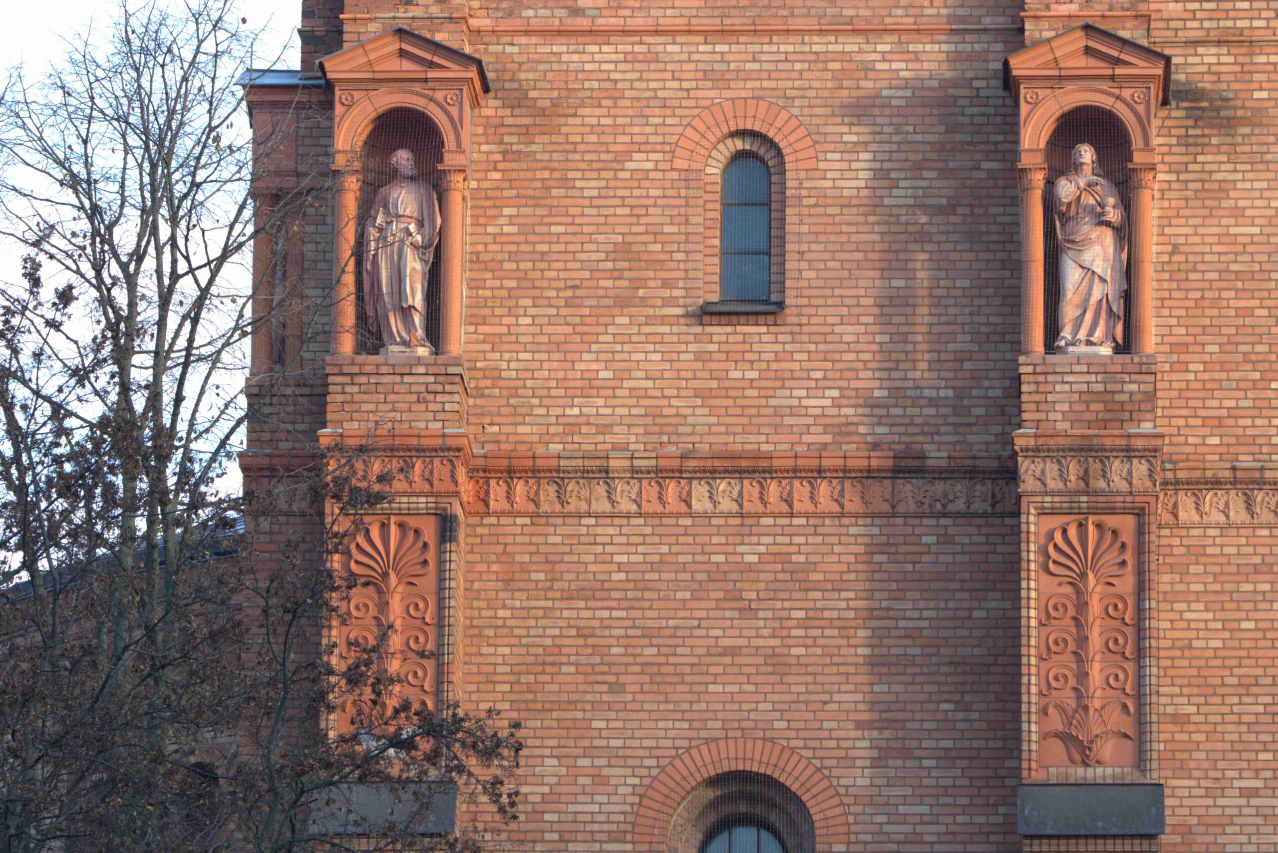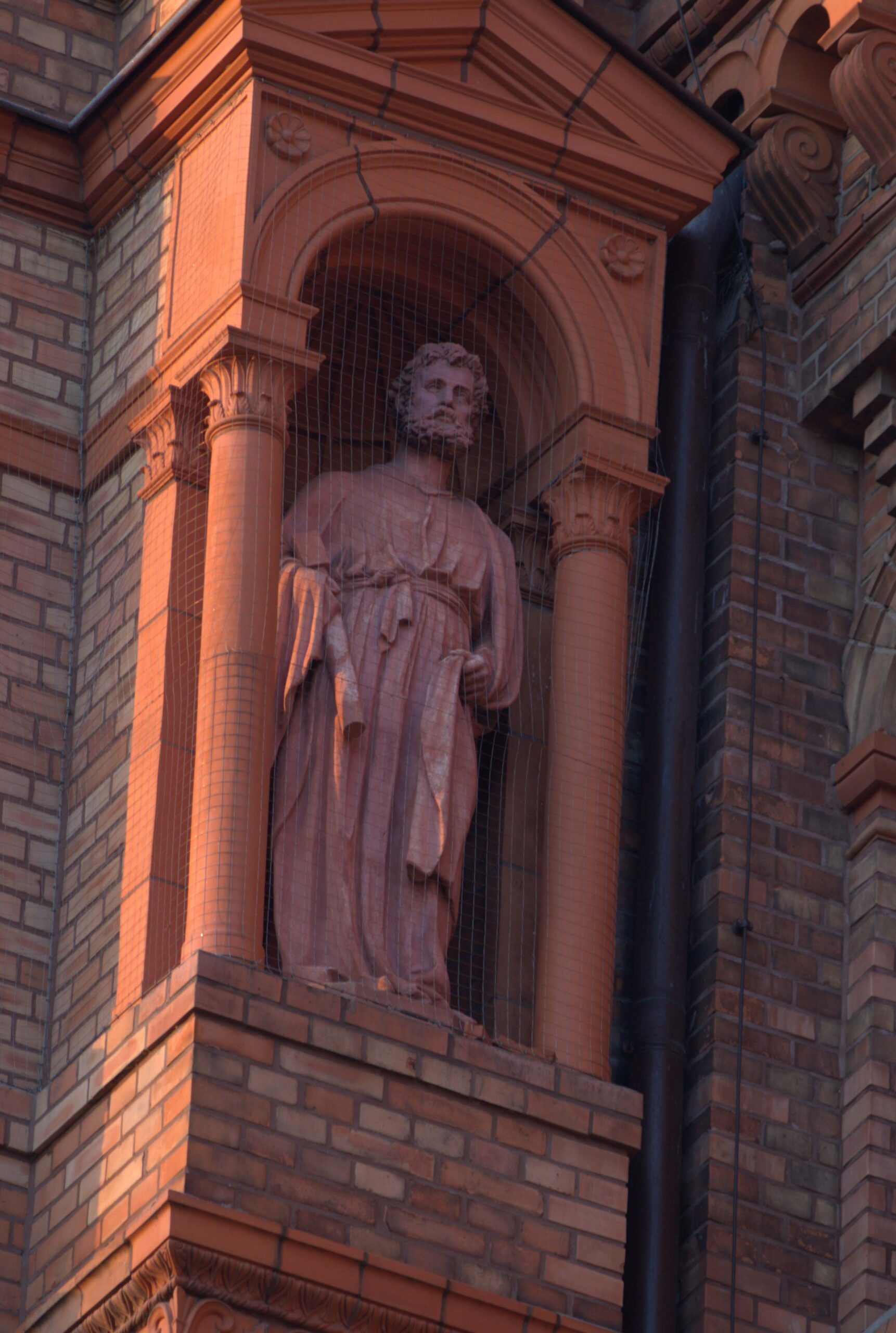 An den beiden Türmen an der Westfront der St. Thomaskirche stehen unter den von kleinen Säulen getragenen Baldachinen an den Nord-, West- und Ostseiten zehn ca. lebensgroße Apostelstatuen (Nicola Vösgen).