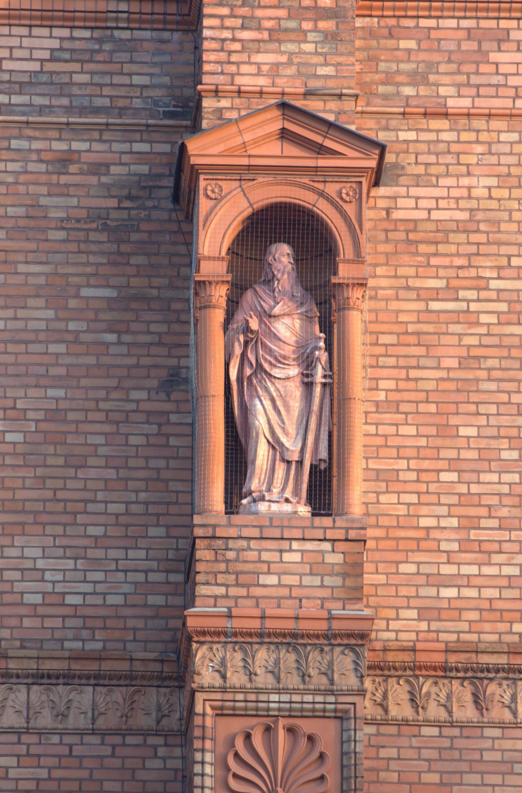 Die Modelle für die zehn Apostel stammen von dem eher unbekannten Berliner Bildhauer Robert Sternecker. Die Ausführung in Terrakotta erfolgte in der Tonwarenfabrik Leopold Lessing in Hermsdorf bei Berlin. Die Aufstellung fand vermutlich mit Fertigstellung des Außenbaus um 1867 statt (Nicola Vösgen).