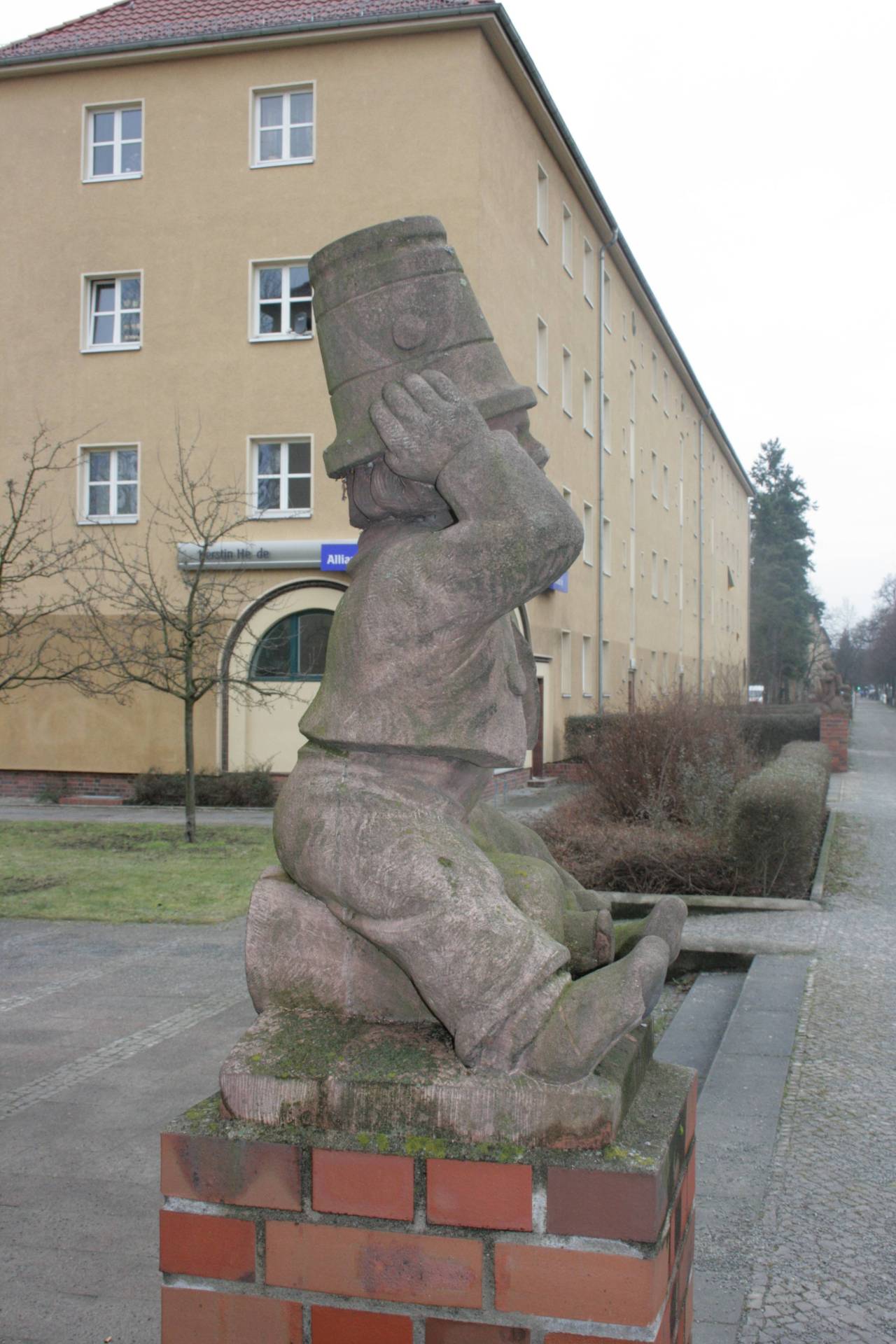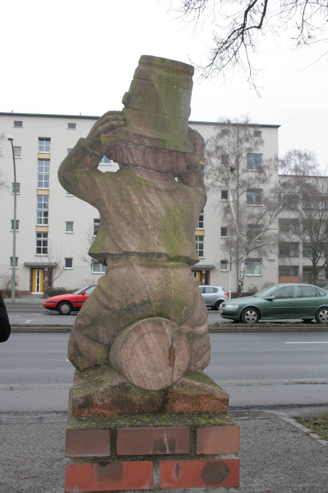 Auf dem Klinkerpfeiler sitzt über quadratischer Plinthe die aus rotem Sandstein gearbeitete Figur eines noch recht kindlichen Apothekers auf einer gewaltigen verstöpselten Medizinflasche. Ein Mörser dient dem Pillendreher als Hut. Es ist keine Bezeichnung zu erkennen (Jörg Kuhn).