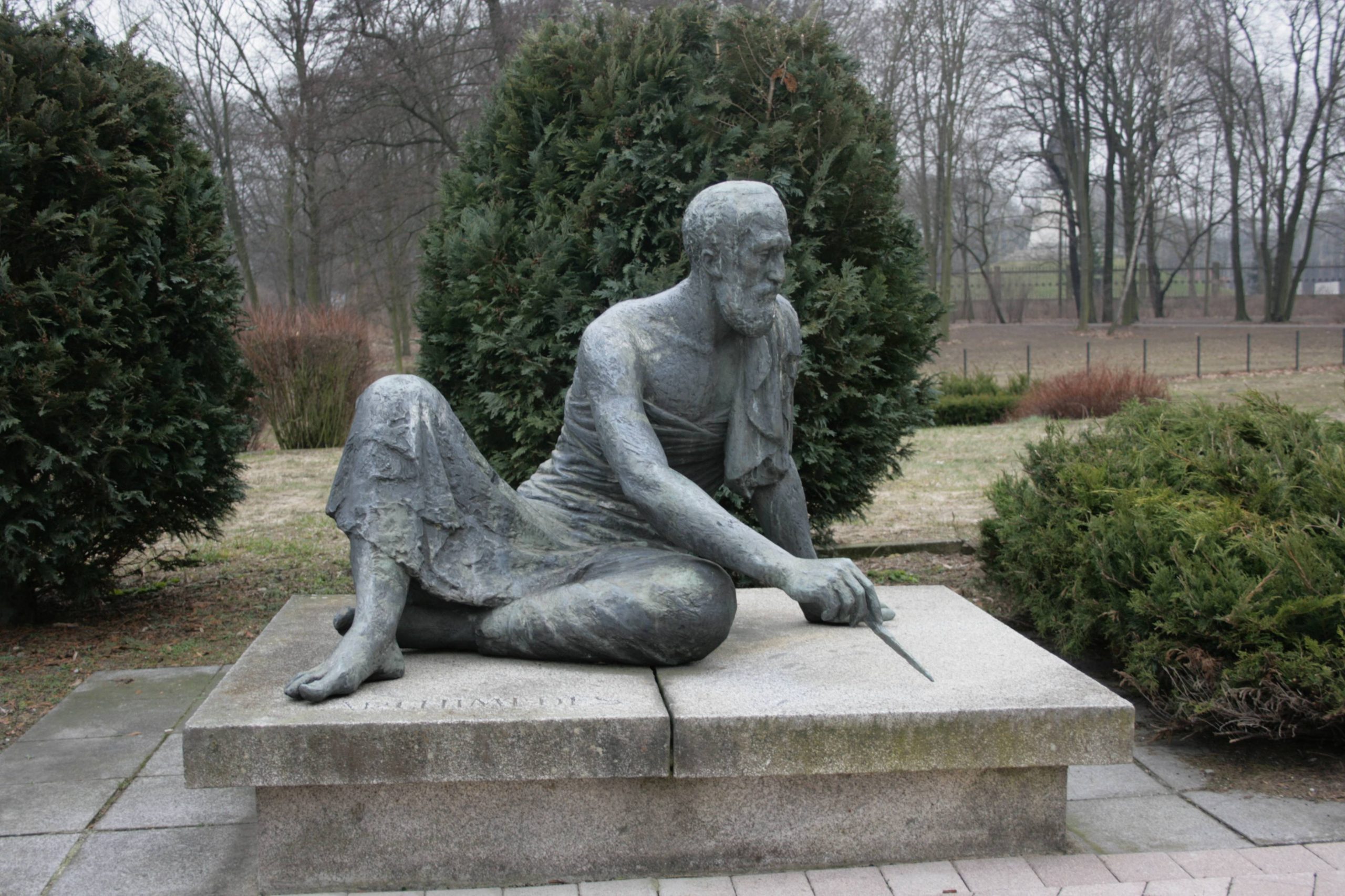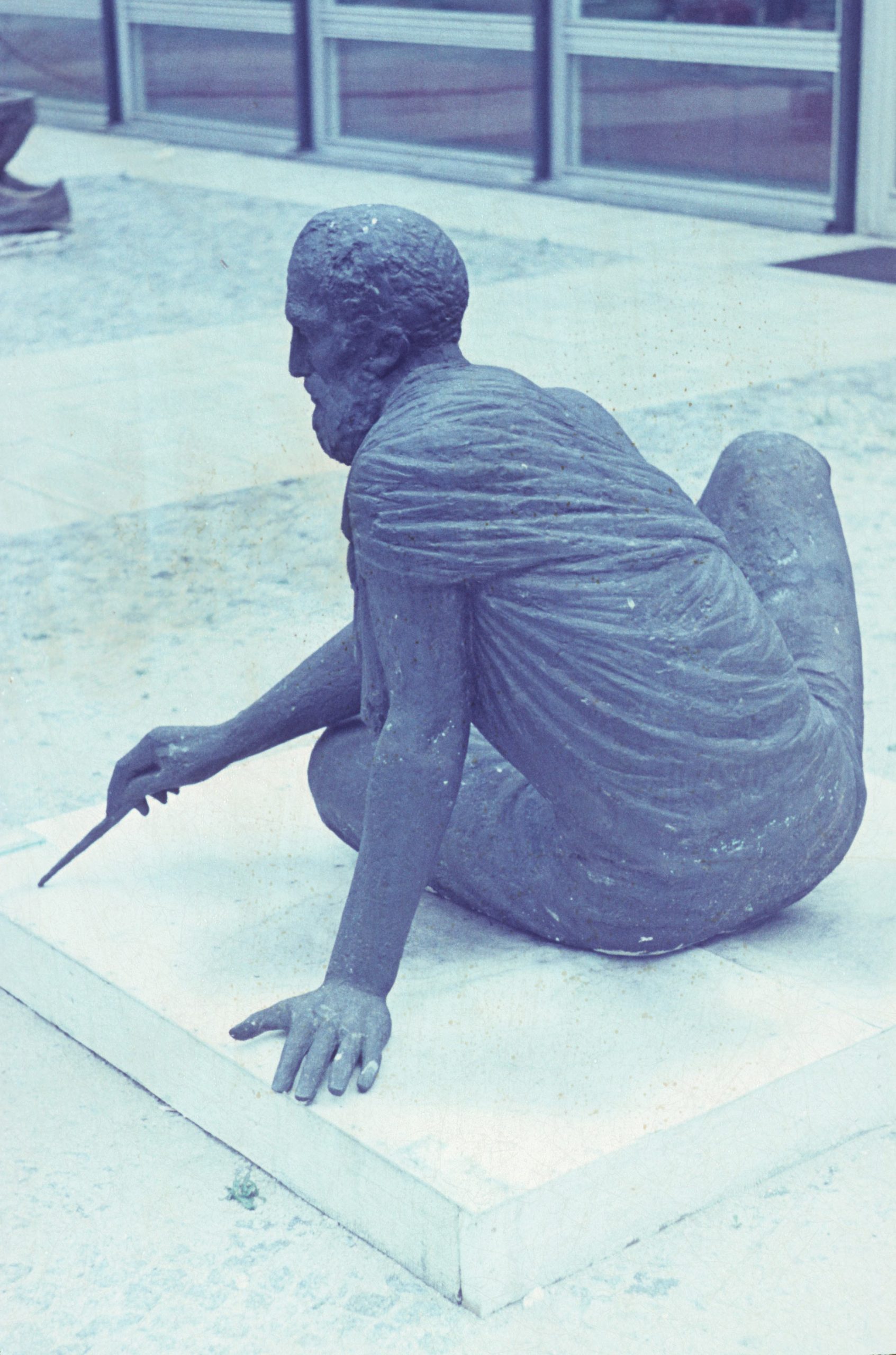 Archimedes hat in seiner Eigenschaft als bedeutender Mathematiker, Physiker und Ingenieur der Antike seinen berechtigten Platz auf dem Gelände der Sternwarte gefunden. Mit der Darstellung des „einen Kreis Zeichnenden“ wird eventuell auf die von Archimedes entdeckte annähernde Berechnung der Kreiszahl Pi angespielt, möglicherweise auch auf die von Archimedes der Legende nach ausgesprochenen letzten Worte „Störe meine Kreise nicht!“, die er gegenüber einem Legionär in der von den Römern besetzten Stadt Syrakus gesagt haben soll, bevor dieser ihn erschlug. Der Archimedes war erstmals 1969 in der Bezirkskunstausstellung „Architektur und bildende Kunst" in der Neuen Berliner Galerie zu sehen (Olbrich, Harald: Neue Wege, Sujets und Formate. Zur Berliner Bezirksausstellung “Bildende Kunst – Architektur” (III), in: Berliner Zeitung, 24.06.1969, S. 12). Zwei Jahre später, 1971, wurde er auf der Ausstellung „Plastik und Blumen im Treptower Park“ präsentiert. Die Archenhold-Sternwarte erwarb die Statue noch im selben Jahr, die Aufstellung erfolgte vermutlich im November 1972. Es sind drei weitere Abgüsse bekannt: Ein Archimedes wurde 1978 anlässlich des 750-jährigen Stadtjubiläums auf dem Güstrower Marktplatz vor der St.-Marien-Kirche aufgestellt, ein weiterer gelangte 1978 als Geschenk an die Technische Hochschule Otto von Guericke in Magdeburg, er befindet sich heute auf dem Uni-Campus in der Pfälzer Straße. Ein dritter Abguss steht vor der 1978 eröffneten Regelschule in Ellrich (Südharz). Weiterhin existiert eine Reduktion in Statuettengröße, die heute noch von der Gießerei Lauchhammer vertrieben wird (Susanne Kähler, Nicola Vösgen).