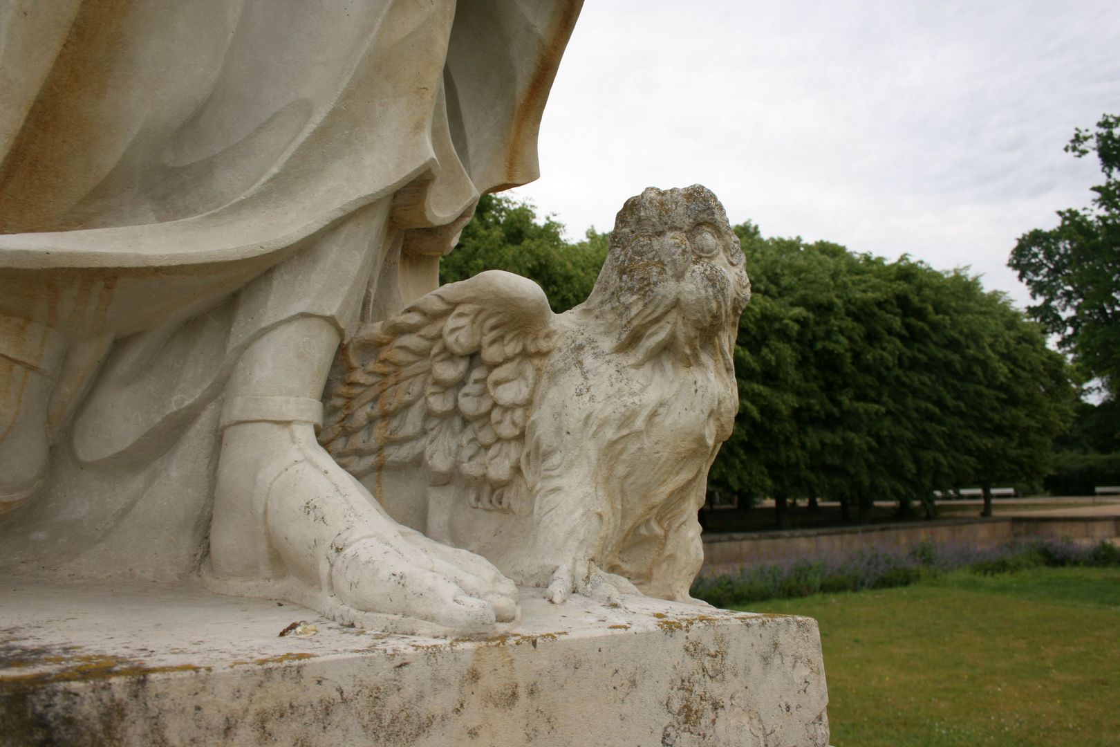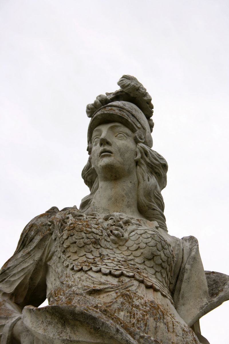 Weibliche Standfigur mit den Attributen der Göttin der Weisheit und der Kriegskunst, Rüstung und Eule, stehend auf einem rechteckigen Sockel nach Vorbildern des 18. Jahrhunderts. Die Skulptur zeigt einen spätbarocken Schwung von fast süddeutscher Beschwingtheit. Die Ausführung der Nachschöpfung irritiert aber durch grobe, schon expressionistisch anmutende Faltenformen des Gewandes (Jörg Kuhn, Susanne Kähler).