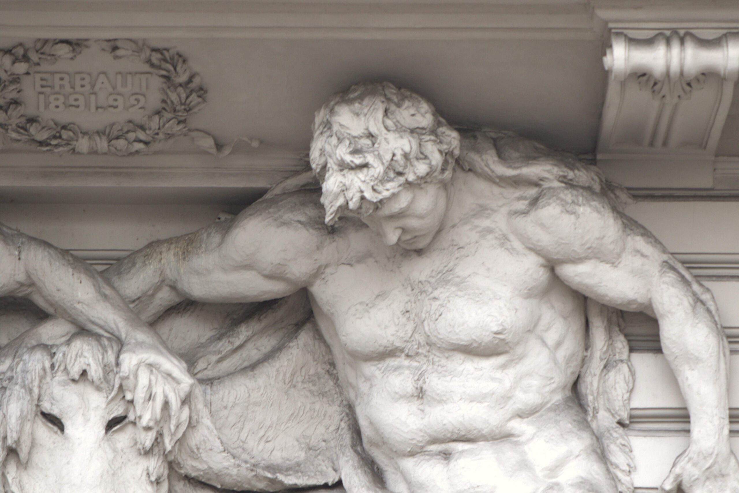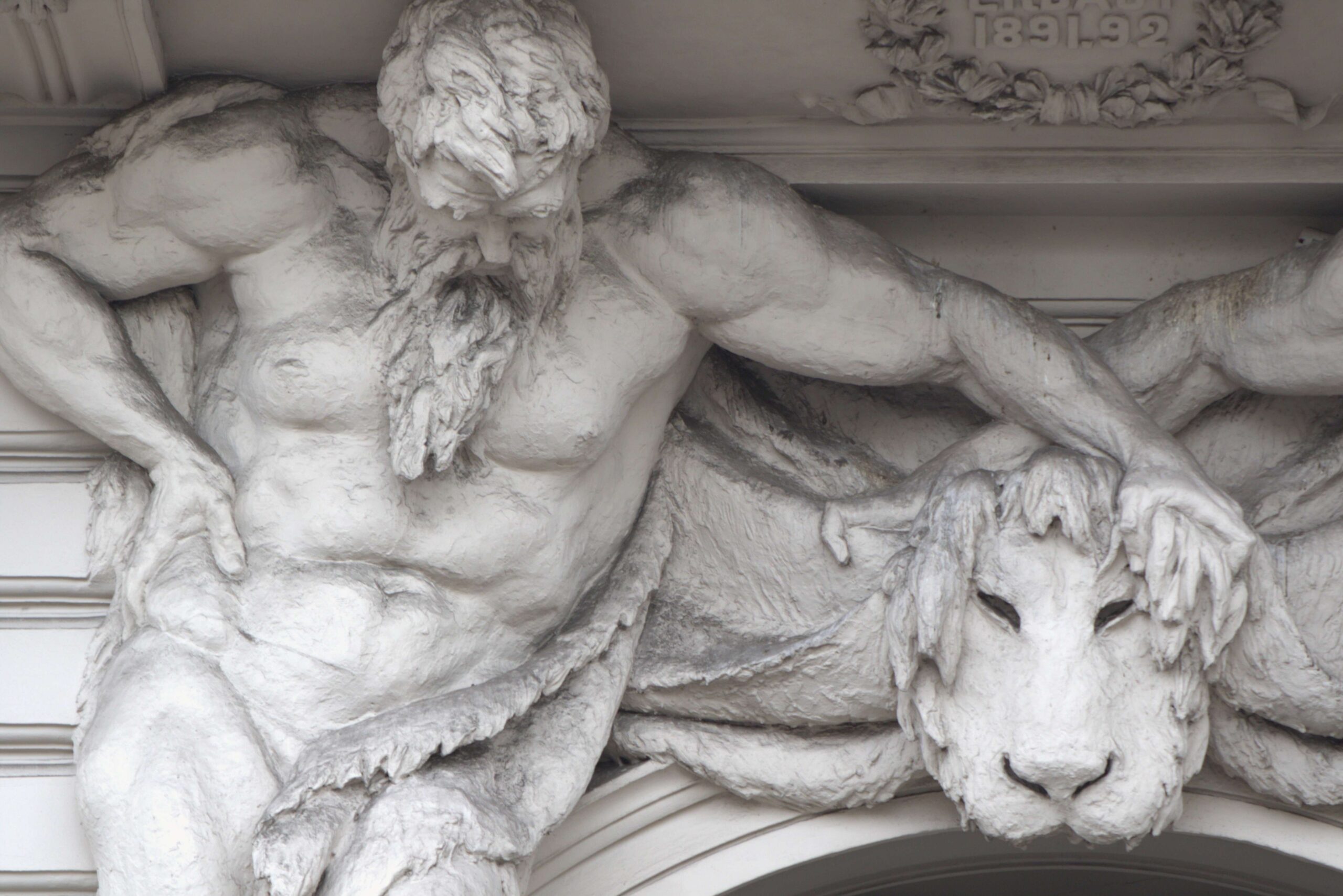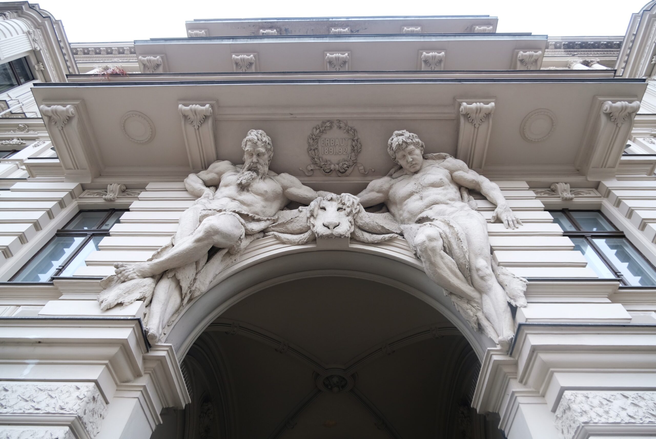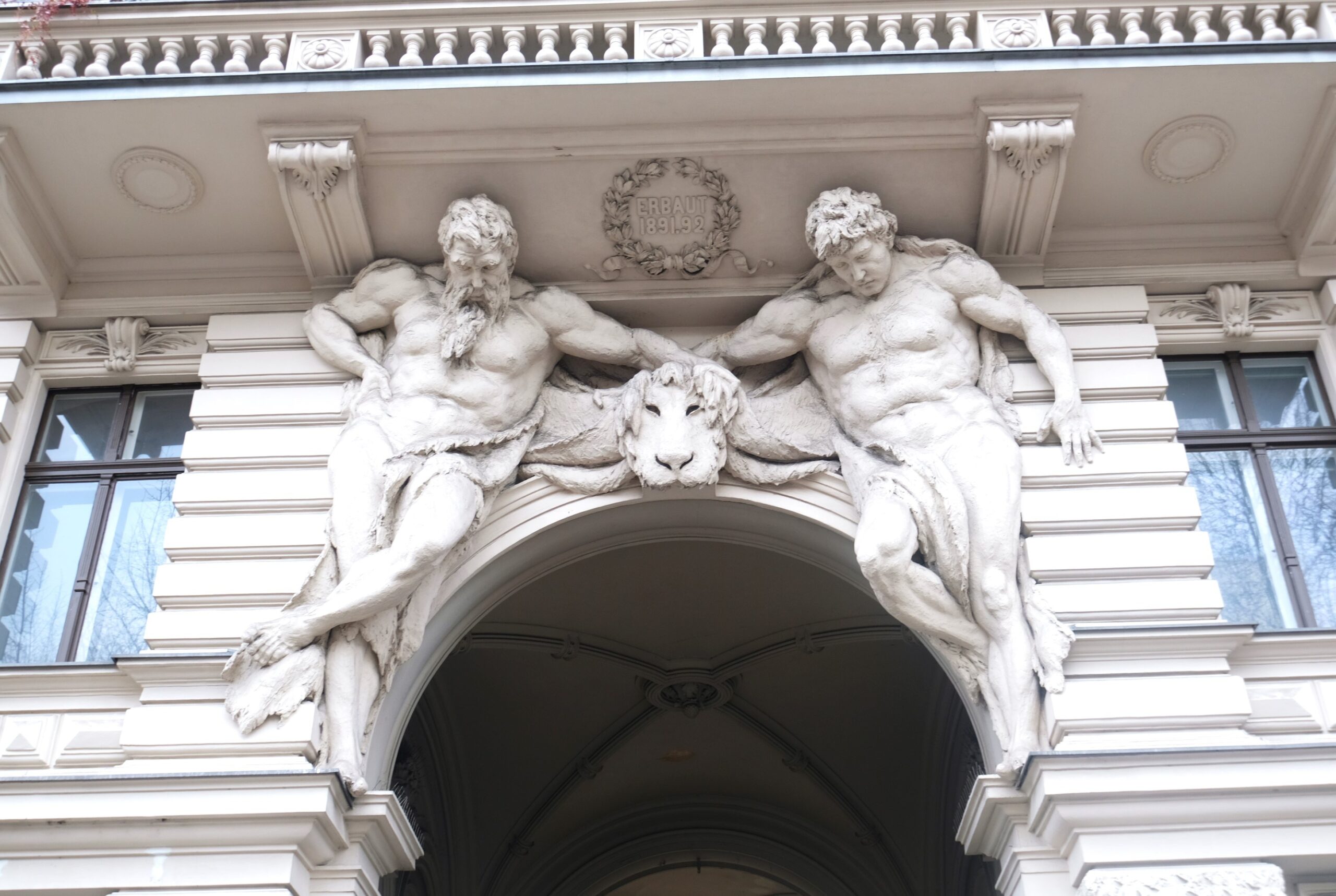 Die Atlanten über der Hofeinfahrt zu Riehmers Hofgarten wurden um 1891/92 im Zuge der Errichtung der Wohnanlage geschaffen.