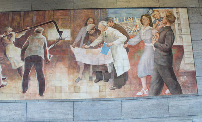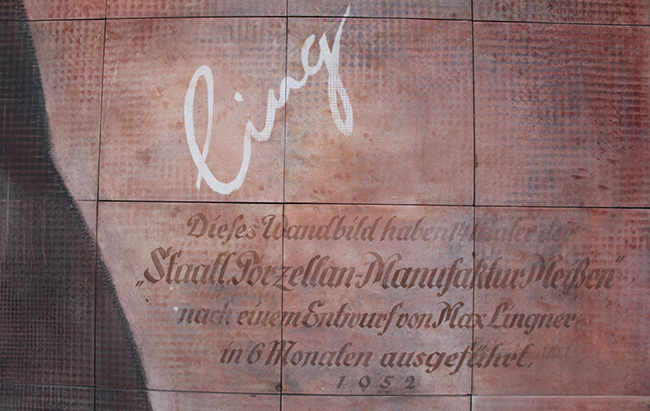 »Dieses Wandbild haben 14 Maler der / "Staatl. Porzellan-Manufaktur Meißen" / nach einem Entwurf von Max Lingner / in 6 Monaten ausgeführt / 1952«