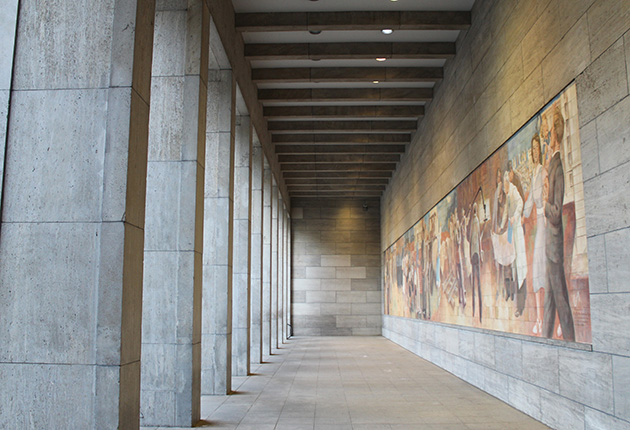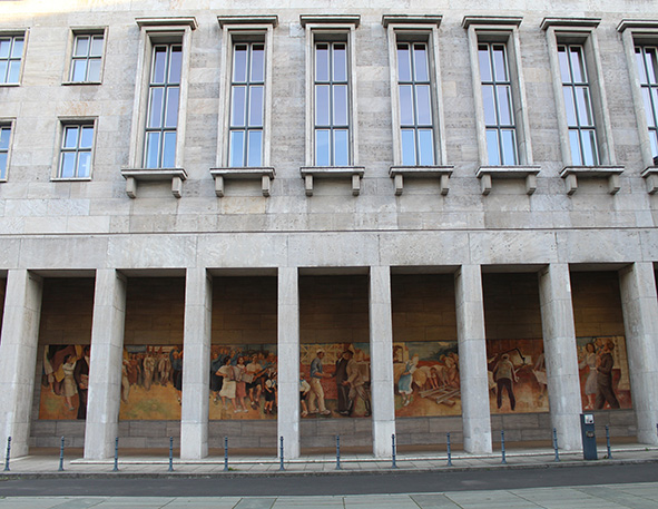 Die Wandgestaltung des Detlev-Rohwedder-Hauses in der Wilhelmstraße in Berlin-Mitte wurde 1952 geschaffen. Zu DDR-Zeiten trug es die Bezeichnung "Haus der Ministerien". 1935 bis 1936 wurde der Verwaltungsbau, der bis 1945 als Reichsluftfahrtministerium fungierte, nach Plänen des Architekten Ernst Sagebiel erbaut. Nach Kriegsende diente er als Sitz der sowjetischen Militäradministration und wurde in der DDR schließlich als Haus der Ministerien und als DDR-Regierungssitz genutzt. Die ideologisch besetzte Nutzung während der Zeit des Nationalsozialismus sollte eine neue Bedeutung erhalten. Aus dieser Motivation entstand das von sozialistischen Motiven geprägte Wandbild Max Lingners (vgl. Maleschka, 2019, S.67ff.). 1950 begannen im Auftrag der DDR-Regierung die ersten Vorbereitungen für ein Wandbild mit dem Titel „Die Bedeutung des Friedens für die kulturelle Entwicklung der Menschheit und die Notwendigkeit des kämpferischen Einsatzes für ihn". Nach mehrfacher Überarbeitung, auf Wunsch von Walter Ulbricht und Otto Grotewohl, wurde das Wandbild schließlich im September 1953 eingeweiht. Von 1990 bis 1994 war in dem Gebäude die Zentrale der Treuhandanstalt untergebracht. Seit einer umfangreichen Renovierung 1999 beherbergt es das Bundesfinanzministerium. Eine erneute Umdeutung erhielt Max Lingners Werk durch das im Jahr 2000 eingeweihte Denkmal zur Erinnerung an den Aufstand vom 17. Juni 1953 von Wolfgang Rüppel. Die im Boden eingelassene Fotointarsie auf dem Vorplatz des Gebäudes zeigt den Ausschnitt eines dokumentarischen Bildes friedlicher Demonstranten. Mittels Form und Platzierung spiegelt Rüppel das sozialistische Wandbild und verweist auf den damaligen Konflikt zwischen politischer Wunschvorstellung und gesellschaftlicher Wirklichkeit (vgl. https://www.museum-der-1000-orte.de/kunstwerke/kunstwerk/aufbau-der-republik).