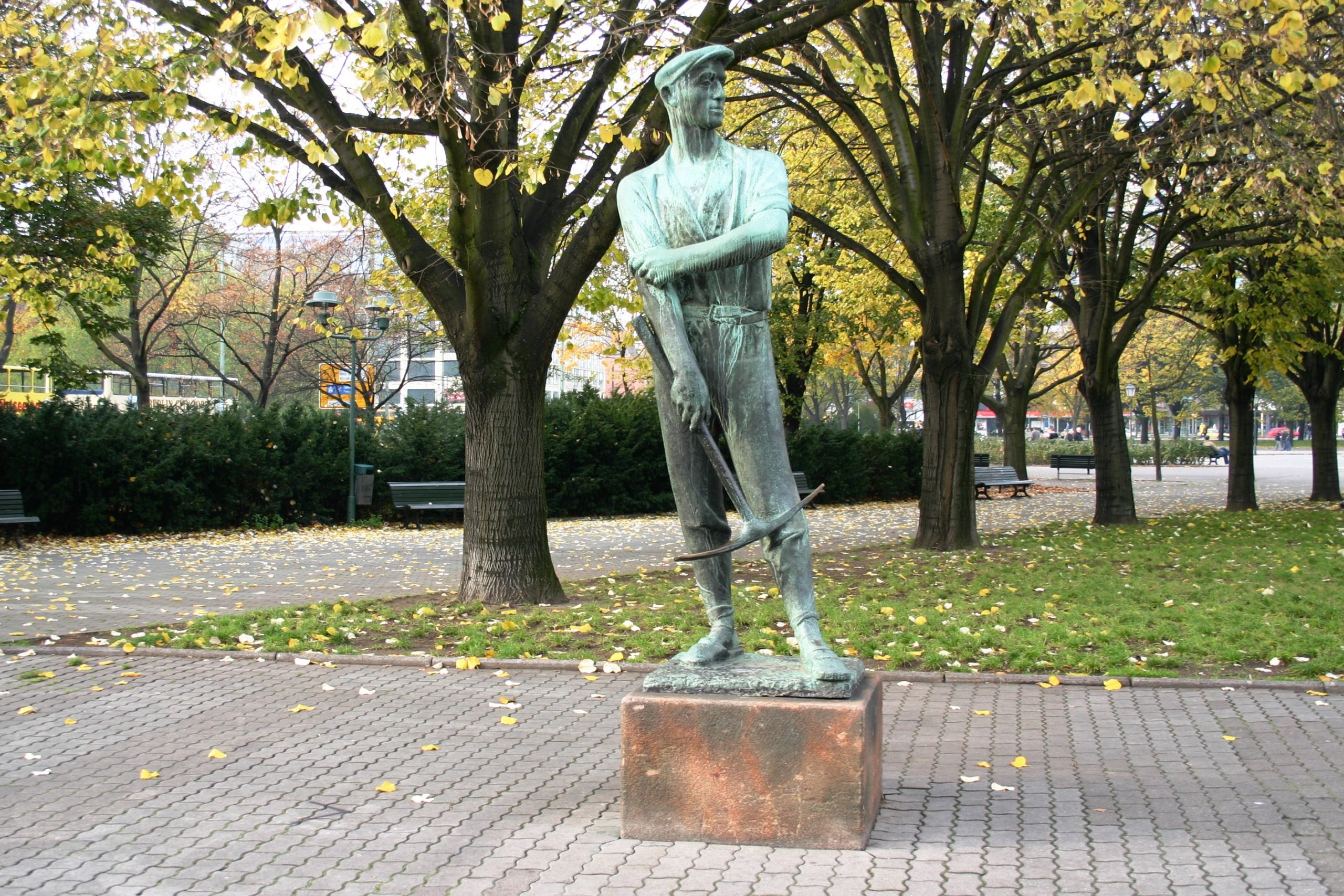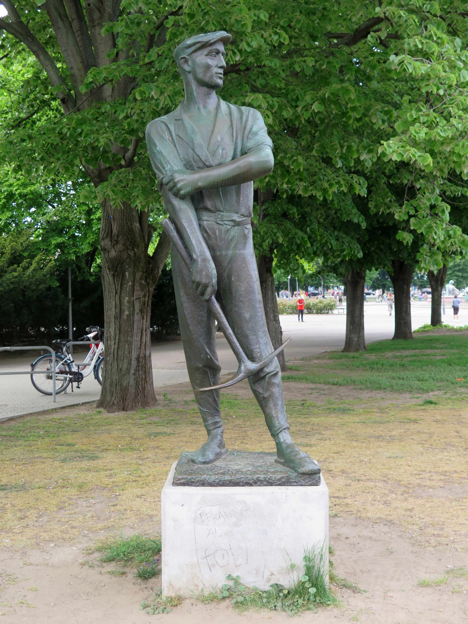 Standbild eines jungen Mannes in Arbeitskleidung mit Spitzhacke in der rechten Hand, sich den rechten Ärmel aufkrempelnd, aufgestellt über flacher rechteckiger Plinthe auf einem Porphyrsockel.