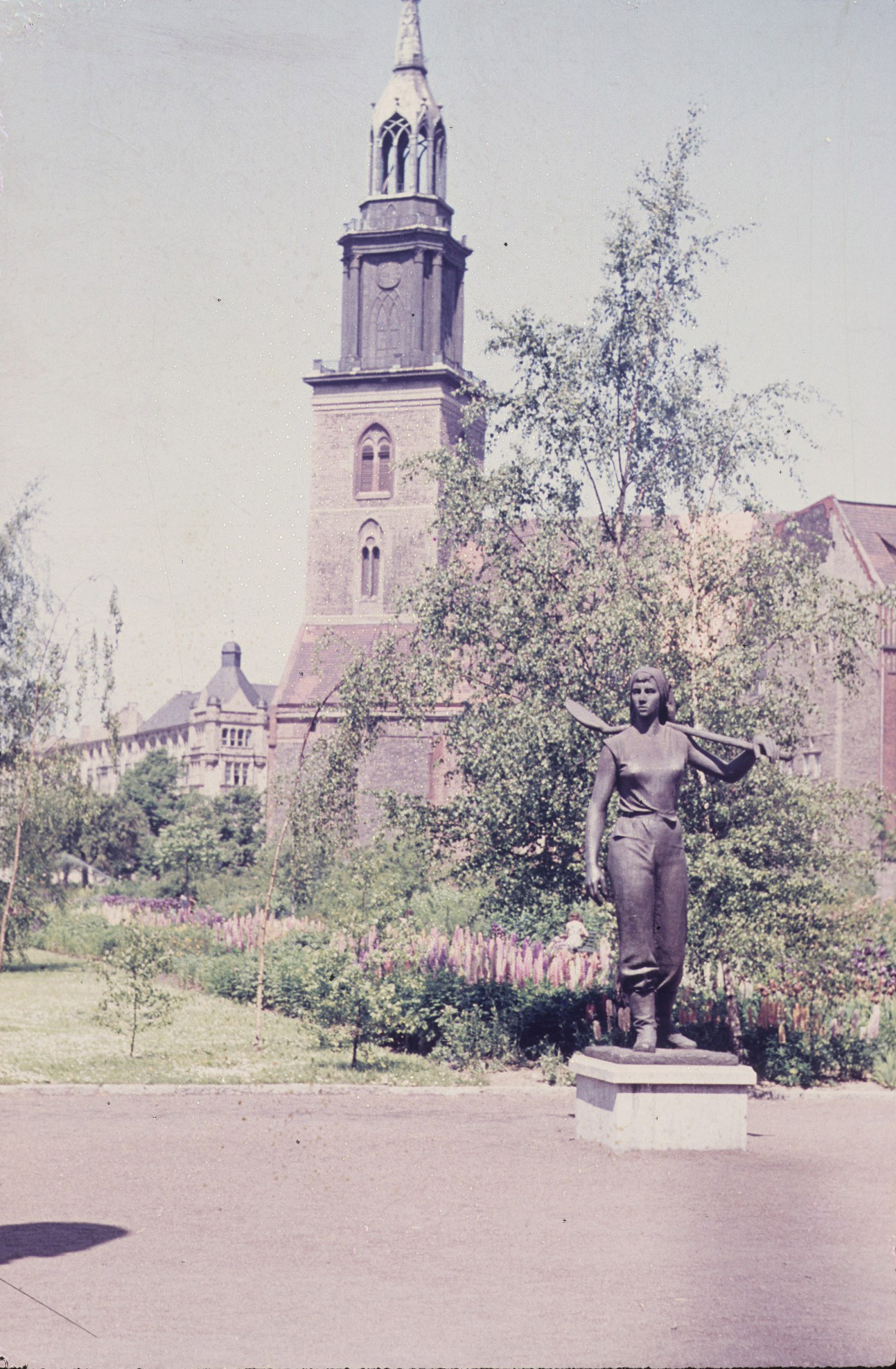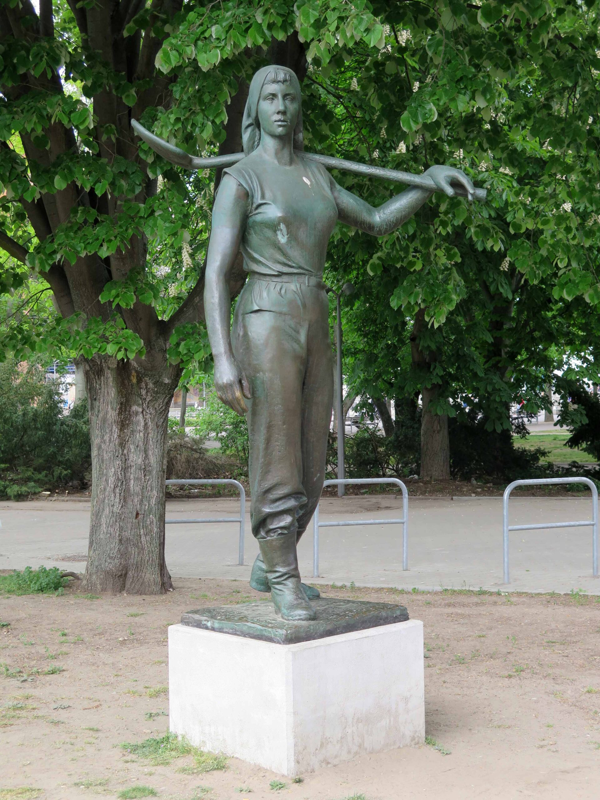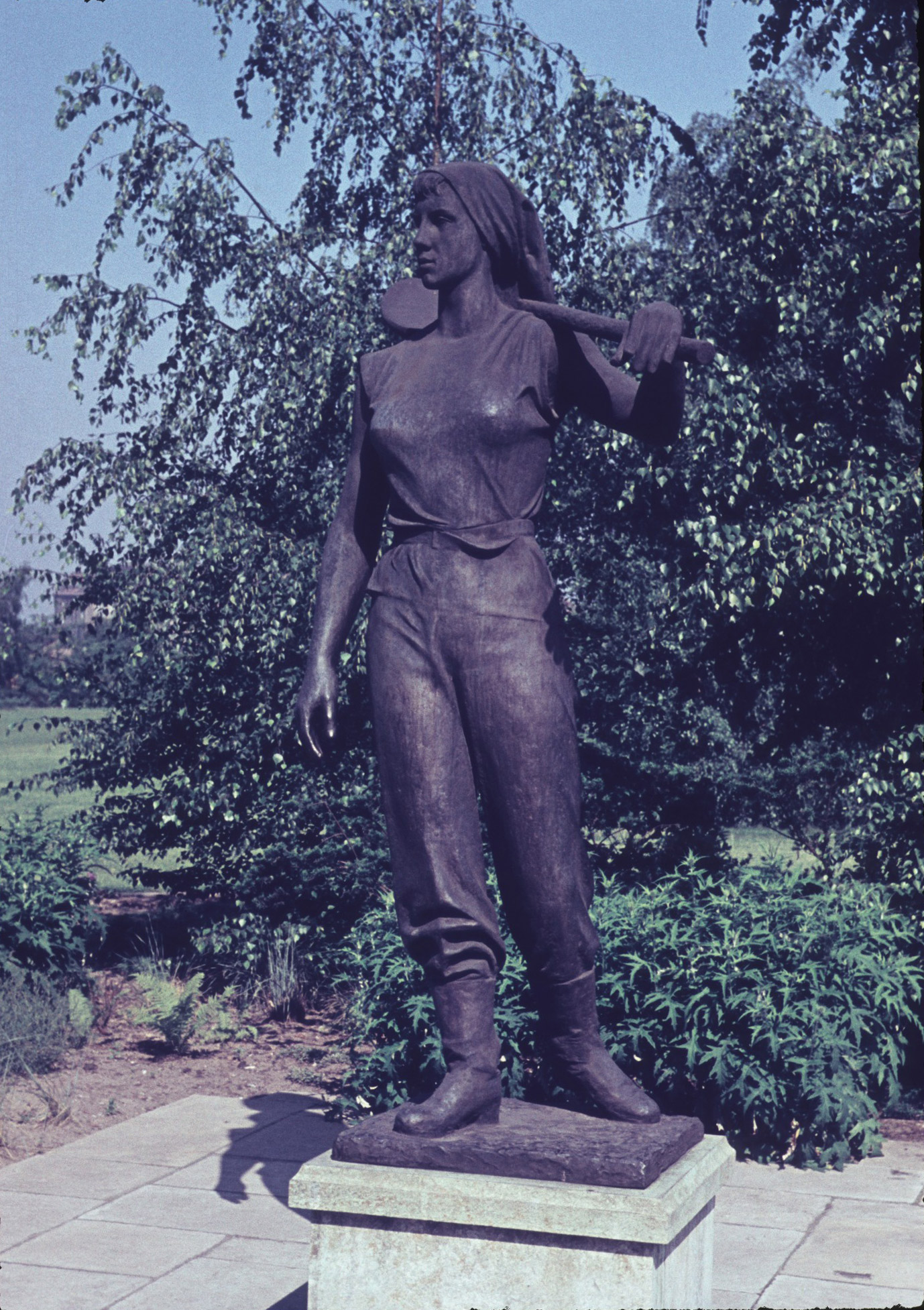 Bronzenes Standbild einer jungen Frau in Arbeitskleidung mit links geschulterter Schaufel, aufgestellt über flacher rechteckiger Plinthe auf einem roten Porphyrsockel. Pendant zum „Aufbauhelfer“.