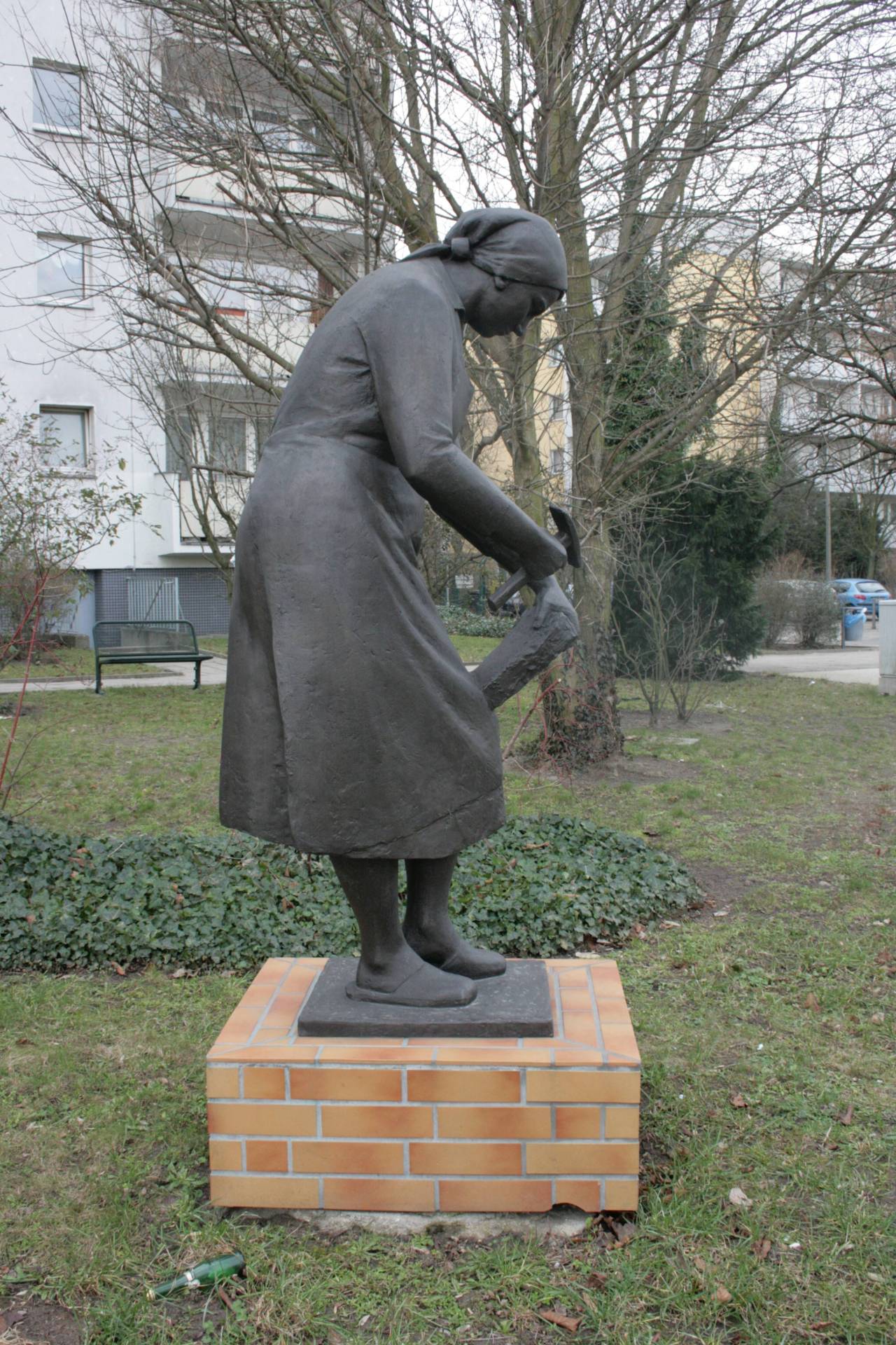 Der Zweite Weltkrieg hinterließ Berlin in Trümmern. Aus den zahllosen Ruinen, die Stück für Stück abgerissen oder gesprengt wurden, wurden die zum Aufbau notwendigen Ziegelsteine geborgen und in mühevoller Handarbeit von den alten Mörtel- und Putzresten befreit. Für die hart arbeitenden Frauen – Männer waren in dieser Tätigkeit aus den unterschiedlichsten Gründen unterrepräsentiert – gab es eine etwas bessere Versorgung auf Lebensmittelkarten oder ein Äquivalent. Obwohl der Aufbau der Stadt ohne die immense Arbeitsleistung der „Trümmerfrauen“ nicht möglich gewesen wäre, wurde erst sehr spät diese Leistung gewürdigt und „denkmalrelevant“. 1963 schuf Gerhard Thieme die Plastik, die 1969 aufgestellt wurde (laut Stefanie Endlich, 1990, S. 344: „Springbornstraße, südlich der Kaufhalle“). Die offenbar vor noch nicht allzu langer Zeit (vor 2011) sanierte Plastik steht heute auf jeden Fall im Vorgarten des Wohnblocks Sterndamm 128 – unweit eines Supermarktgeländes (Susanne Kähler, Jörg Kuhn).