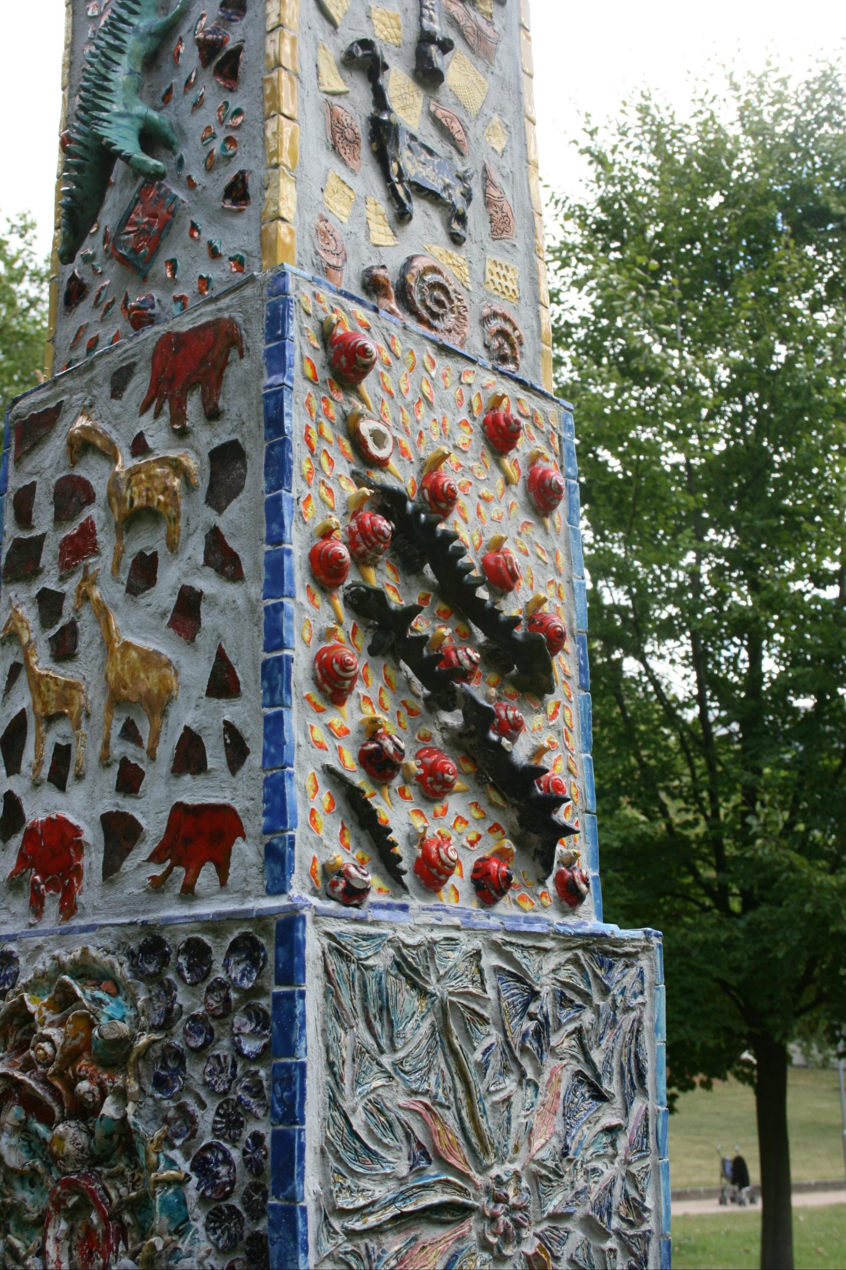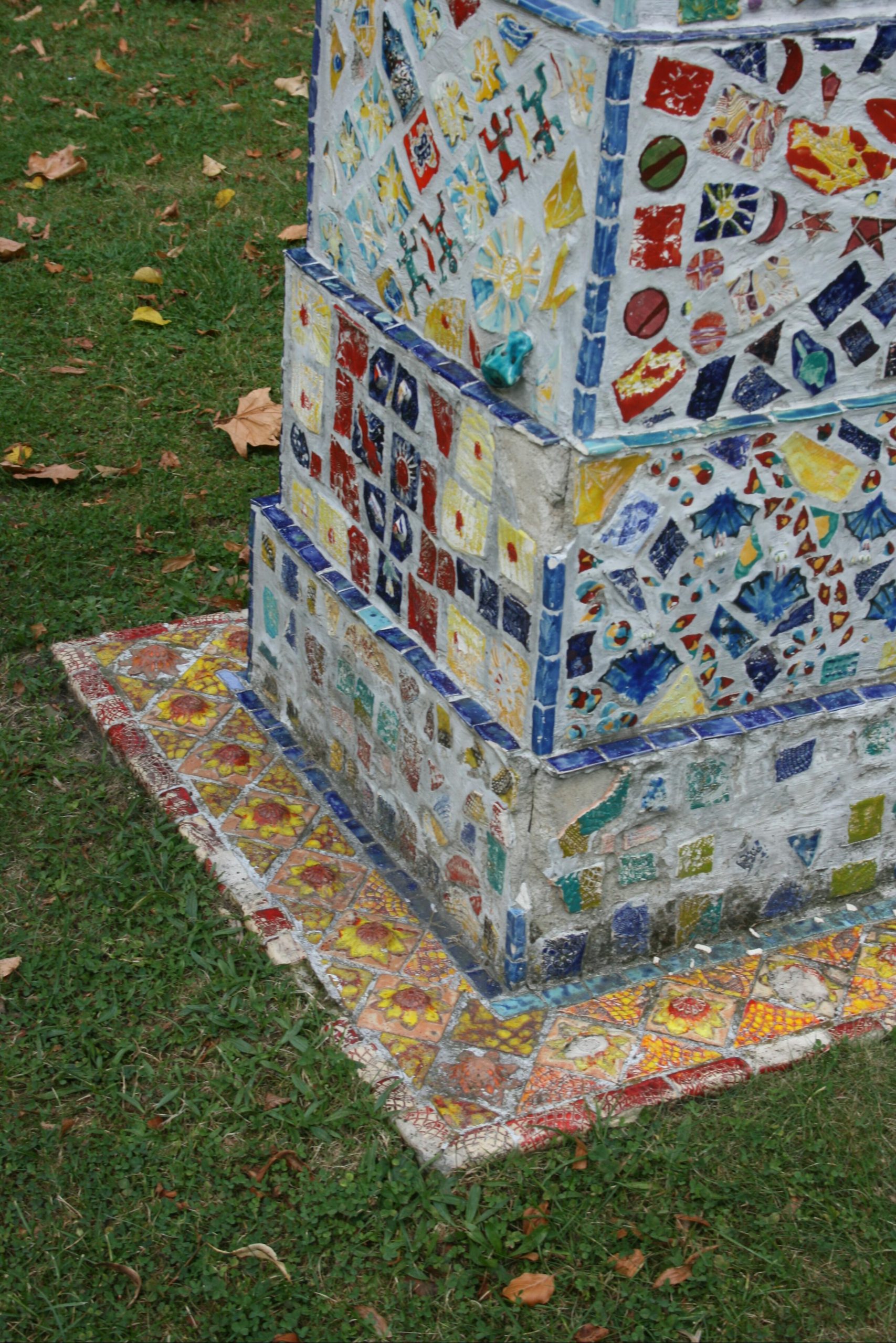 »Die Tumplastik "Aufgetürmte Platte" ist eine / Gruppenarbeit des Kunstprojektes aus dem / Tageszentrum Charlottenburg des Vereins / Platane 19. Verein zur Wiedereingliederung / psychisch Kranker e. V. Der Aufbau von 2002/ bis 2003 erfolgte in Kooperation mit der Platane / 19 GmbH Garten- und Landschaftspflege. / Berlin im Oktober 2004 / www.platane19.de«