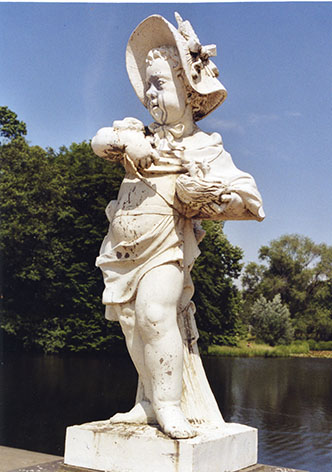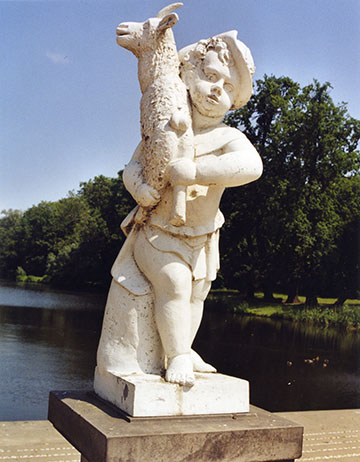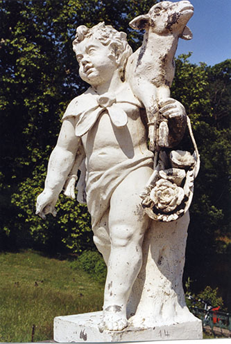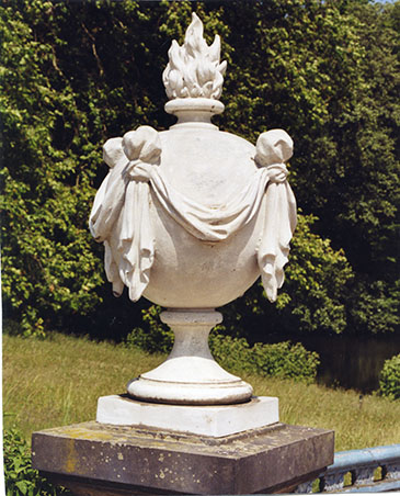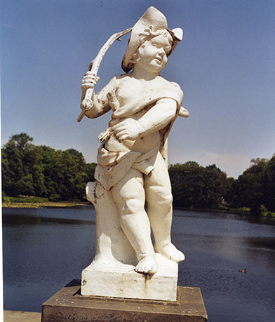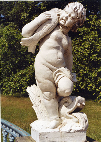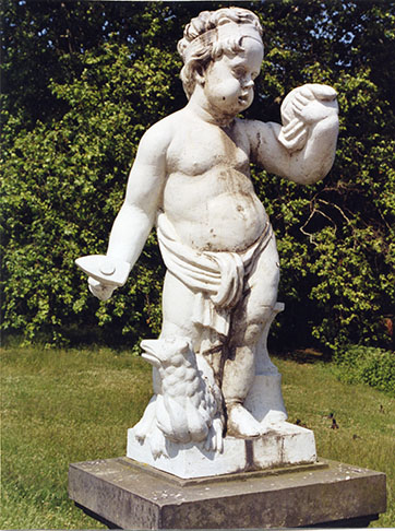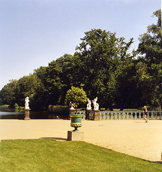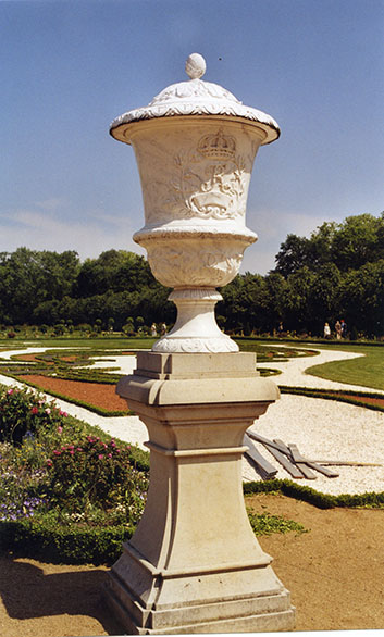Der Schlossgartenbereich des Parterre zwischen Terrasse und Karpfenteich ist mit zahlreichen Ausstattungsgegenständen, hauptsächlich Pflanzgefäßen bestückt worden (genaue Aufzählung siehe auch Wimmer 1992). Die Bestückung der Balustrade zum Karpfenteich mit aus Aluminium gegossenen Putten und Urnenvasen ist eine moderne Zutat aus dem Jahre 1984. Die bereits vielfach an Restaurierung und Wiederaufbau des Charlottenburger Schlosses beteiligten Bildhauer Günter Anlauf, Fritz Becker, Heinrich Kube, Dietrich Starcke und Harald Haake orientierten sich bei der Schöpfung dieser Figuren an Porzellanmodellen der KPM. Die acht Putten haben jeweils eine Höhe von 1,2 m. Außen steht rechts und links eine Urnenvase und zwei die Elemente verkörpernden Figuren. Die Putten am Wasser stehen für die Jahreszeiten. Die Urnenvasen (Pots-au-feu) schuf Harald Haacke nach einer Skizze im so genannten Knobelsdorff-Skizzenbuch. Im Parterre sind 12 runde Vasen aus Gusseisen mit grüner und goldener Fassung verteilt (H. 74 cm, Durchmesser 62 cm). Vasen dieses barocken Typus stammen aus dem 17. Jahrhundert, sie wurden spätestens 1812 aufgestellt und 1979 durch Kopien ersetzt. Neun viereckige Pflanzkübel mit applizierten Frauenmasken, auch aus Gusseisen und gold und grün gefasst, sind ebenfalls im Parterre verteilt. (97 x 85 x 85 cm, spätestens 1819 aufgestellt). Wimmer (1992) bezeichnet diese Kübel als „originelle, sonst nicht bekannte Schöpfung“, die Frauenmasken mit Palmetten seien eine häufige Schmuckform des französischen Barock. Weitere Ausstattungsgegenstände sind fünf gesockelte Deckelvasen aus Metall mit weiß/marmorierter Fassung, reicher Rokoko-Ornamentik und dem Emblem FR (ligiert, Fridericus Rex). Wimmer erwähnt zusätzlich zwei Henkelvasen (um 1663) aus Gusseisen (62 x 91 x 67 cm) die auf Sandsteinsockeln 1967 auf der Terrasse aufgestellt worden sind (Susanne Kähler).