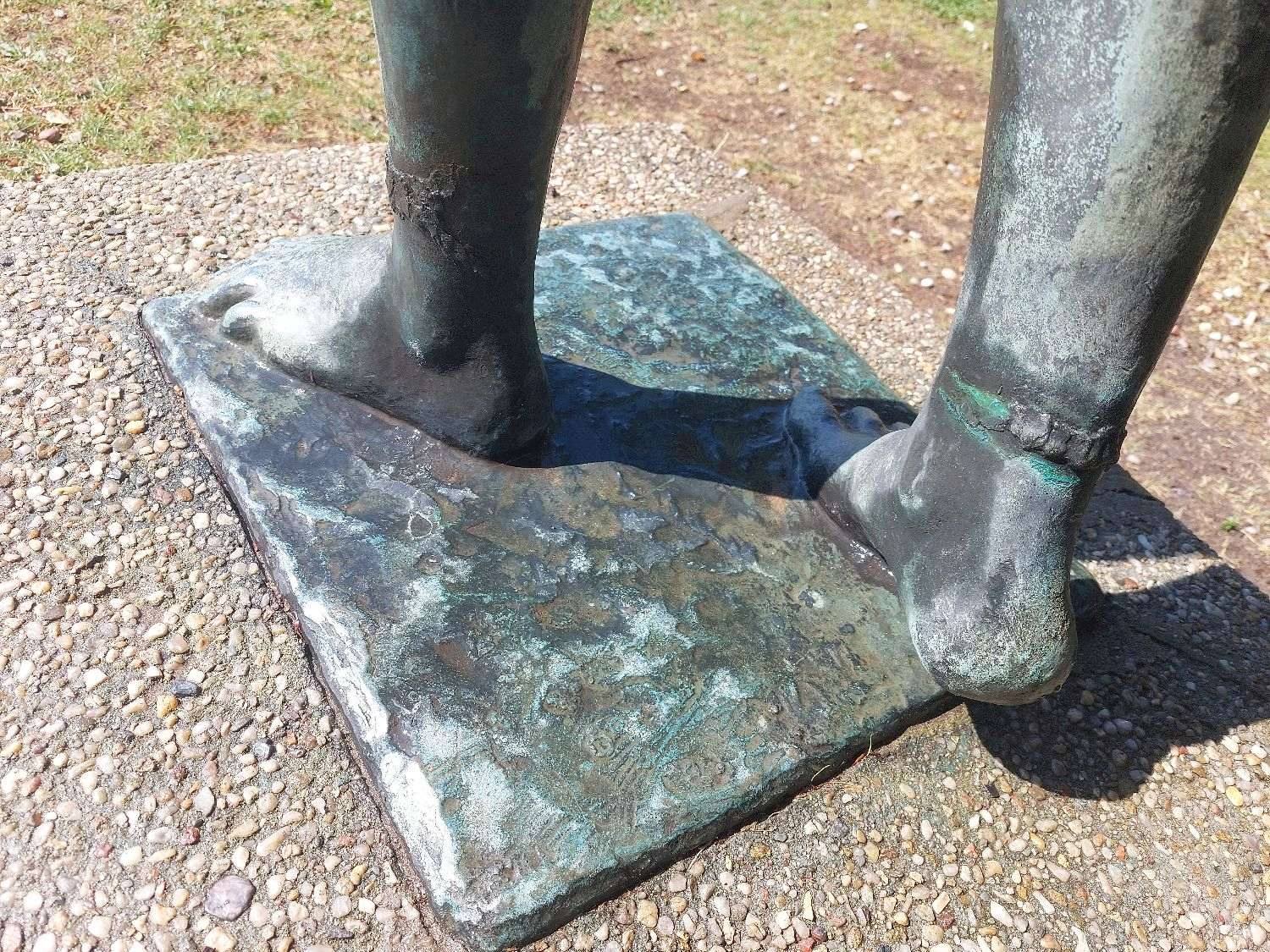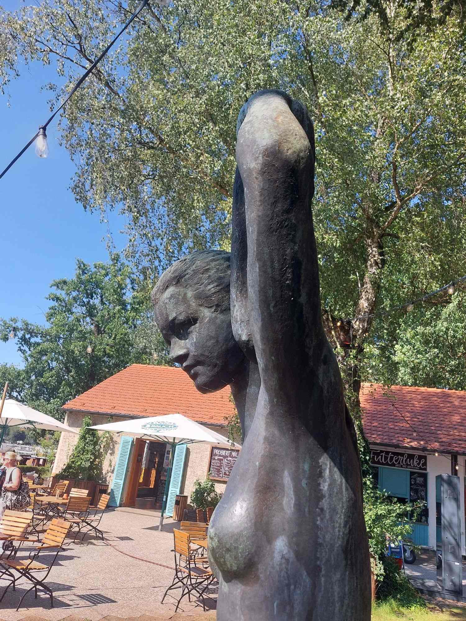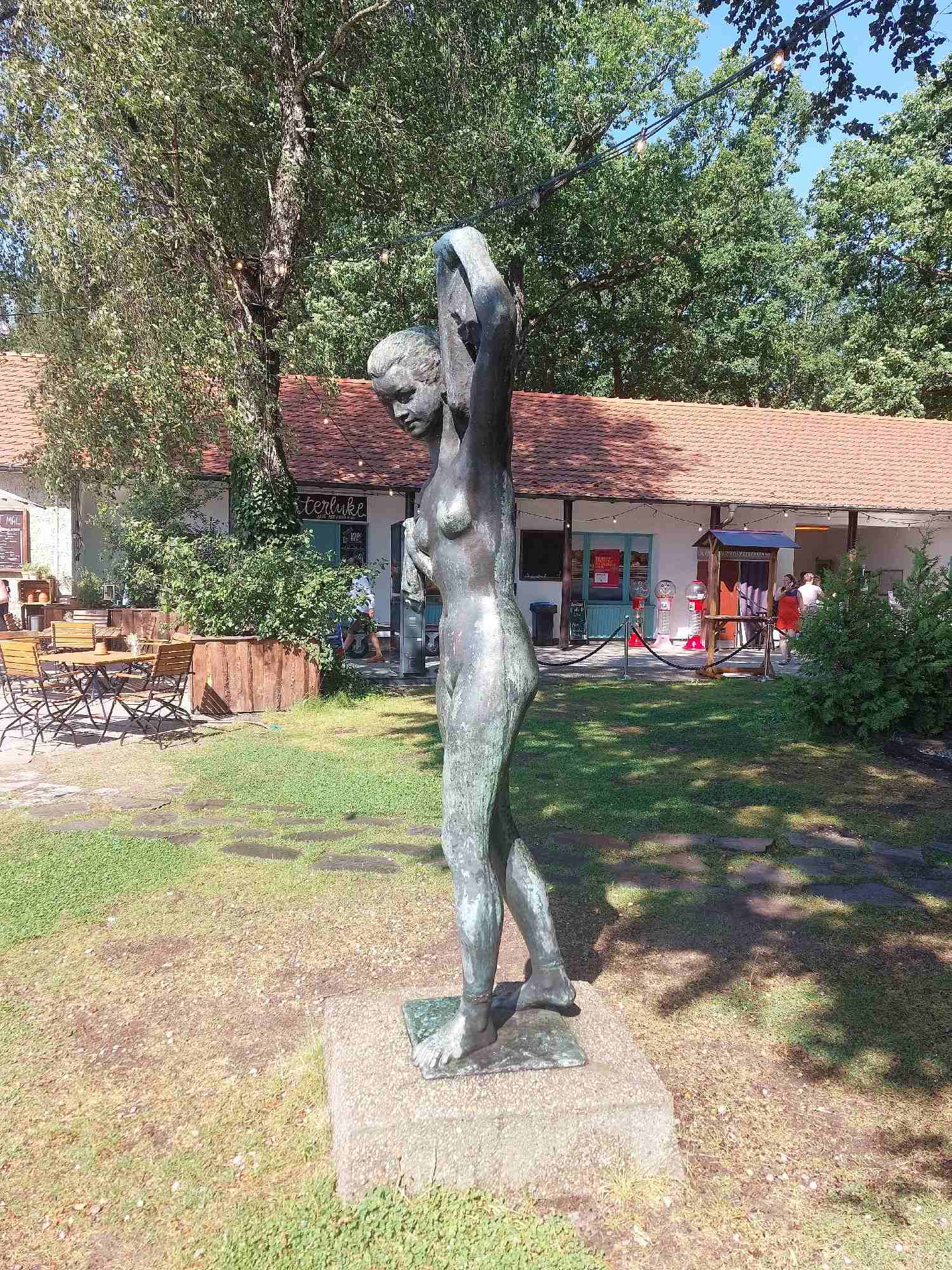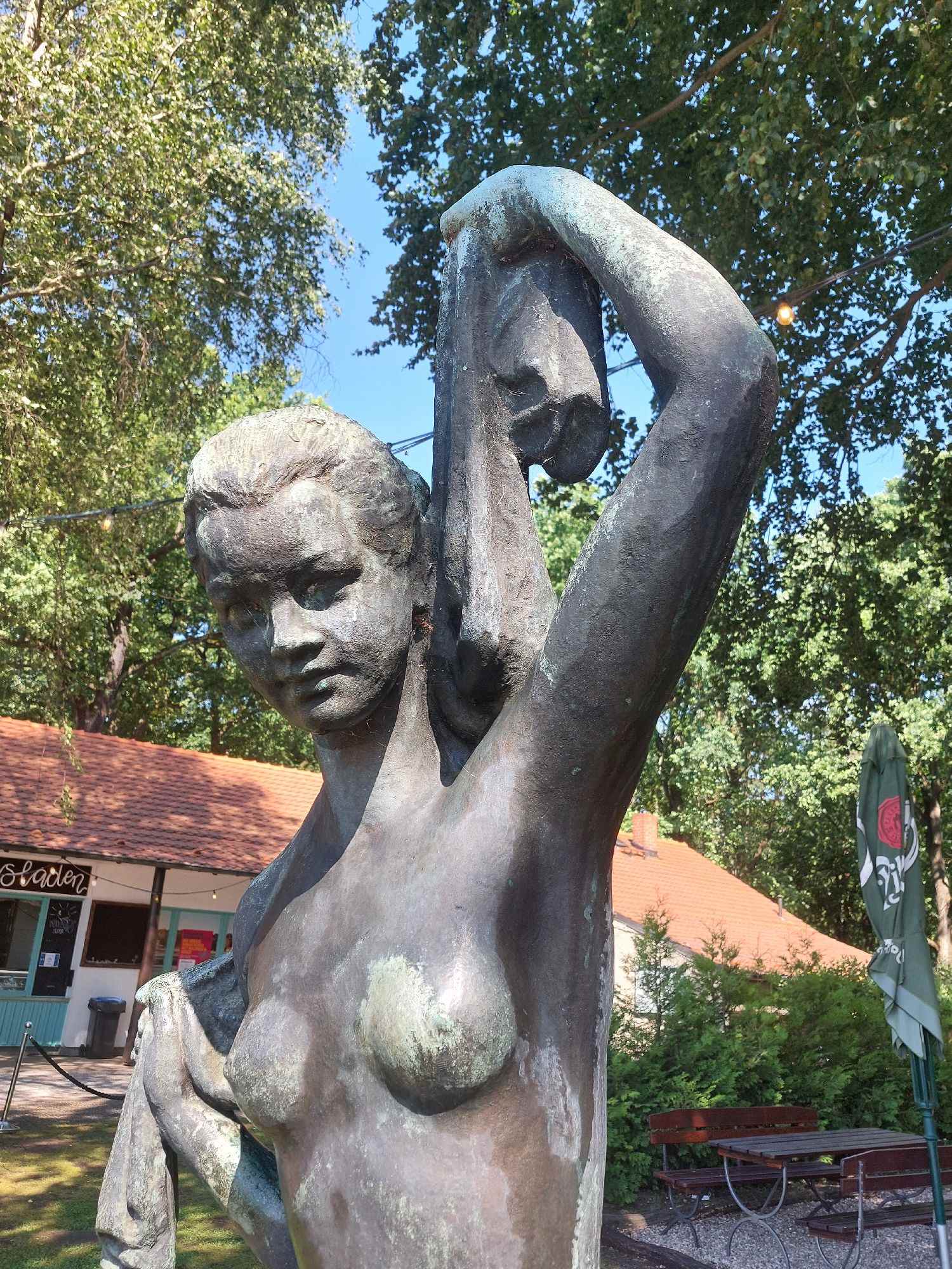 Weibliche stehende Aktfigur. Die Badende hält beide Arme erhoben und trocknet ihren Rücken mit einem Handtuch.