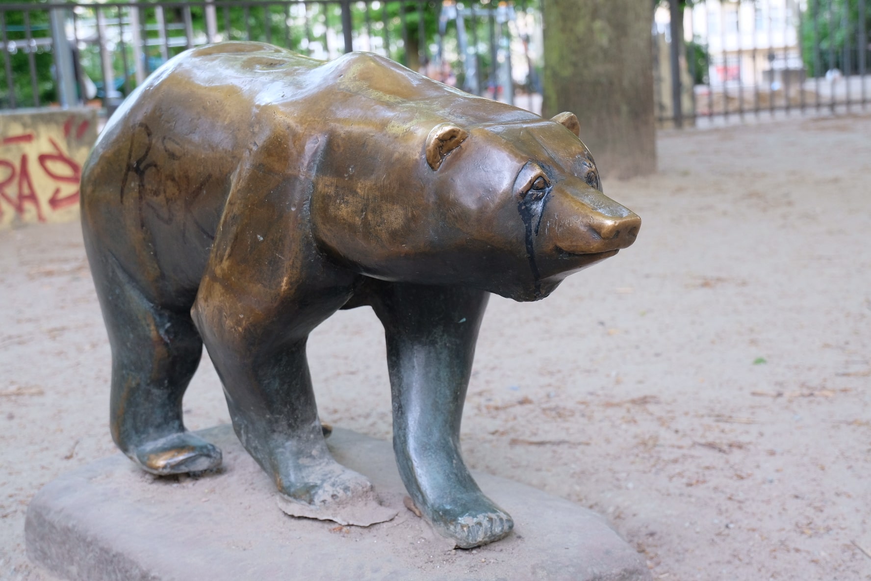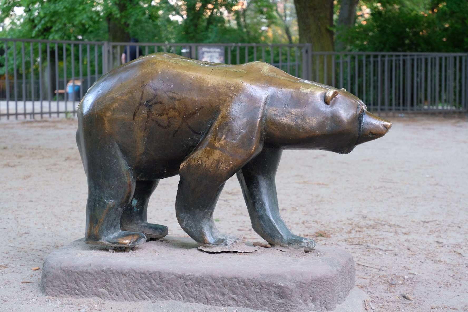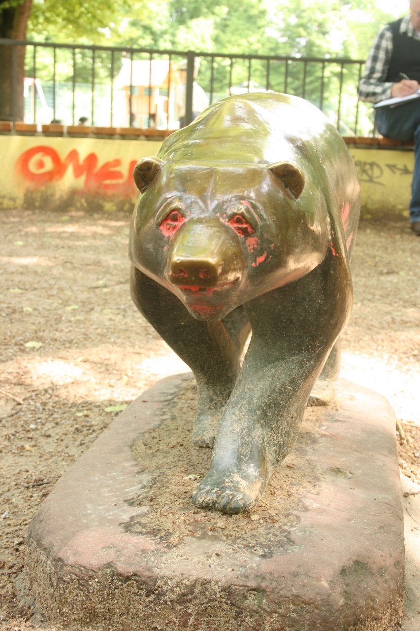 Inmitten einer Freifläche, auf annähernd rechteckiger Platte aus rötlichem Sandstein, steht auf allen Vieren ein bronzener weit unterlebensgroßer Bär, abstrahiert aber naturnah formuliert. Eine Bezeichnung ist nicht zu erkennen.