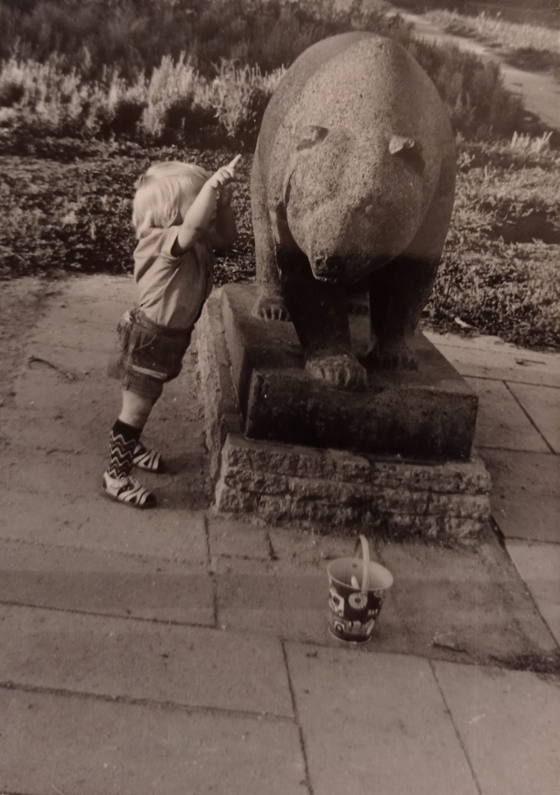Die Skulptur des „Laufenden Bären“ von Erwin Damerow war erstmals 1969 auf der Ausstellung „Plastik und Blumen“ im Treptower Park zu sehen. Wann der „Laufende Bär“ auf dem Spielplatz in der Roßmäßlerstraße aufgestellt wurde, ließ sich bislang nicht genau ermitteln. In den Bezirksamts-Listen der Plastiken im Stadtbezirk Lichtenberg von 1973 und 1978 ist er noch nicht aufgeführt, erstmals genannt ist er in der Liste von 1988 (Heimatmuseum Lichtenberg). Es sind vier weitere Ausführungen des Damerow´schen Bären in Berlin bekannt, von denen drei erhalten sind: Der bekannteste der Bären steht seit 1970 im Volkspark Prenzlauer Berg (Berlinische Galerie, Architektursammlung, Bestand Magistrat Ost-Berlin). Er gehört hier zur frühen Skulpturenausstattung des Volksparkes und ist heute Teil des vom Amt für Umwelt und Natur initiierten Kulturpfades im Volkspark unter dem Titel „Kulturwege“. Weitere Abgüsse befinden sich seit ca. 1967 (?) in Friedrichshagen in der Peter-Hille-Straße 26, vor einem Kindergarten und seit ca. 1969 in Alt Hohenschönhausen, Neustrelitzer Straße 57, in einer Grünanlage vor dem Kinderhaus. Ebenfalls 1969 wurde der „Laufende Bär“auf dem Forckenbeckplatz in Berlin-Friedrichshain aufgestellt (verloren) (Berlinische Galerie, Architektursammlung, Bestand Magistrat Ost-Berlin). (Nicola Vösgen).