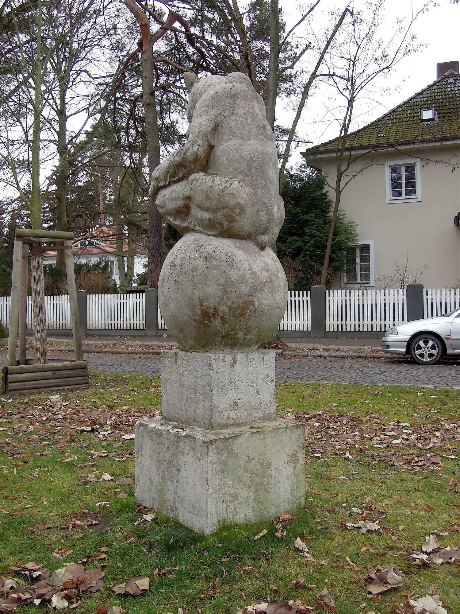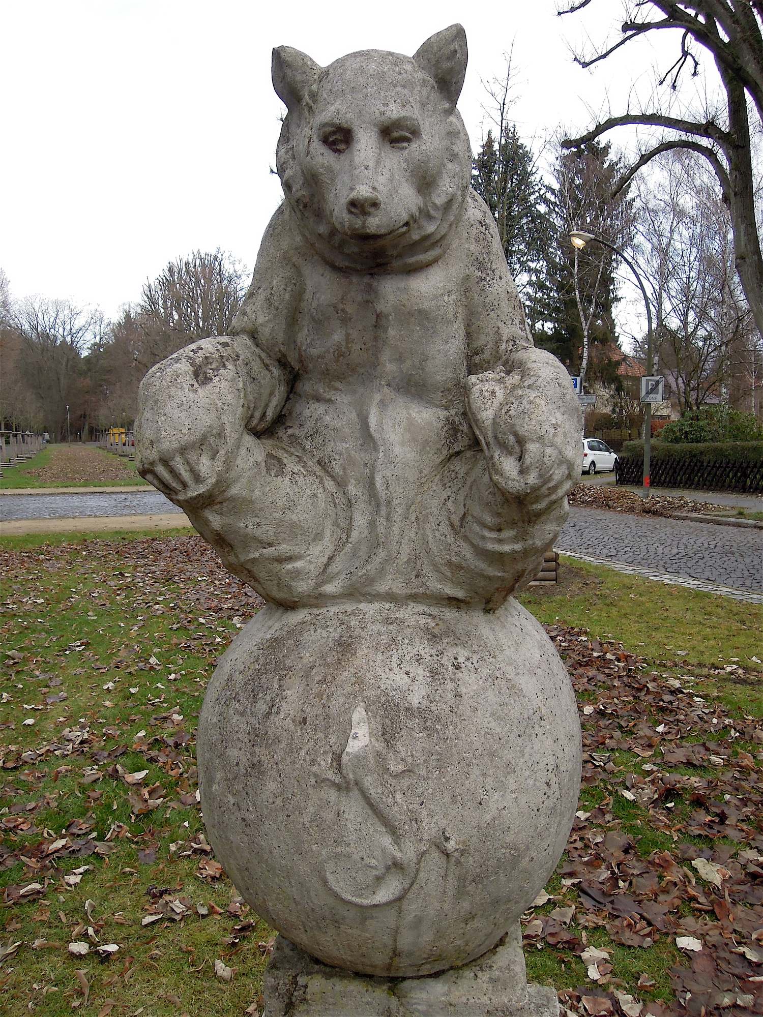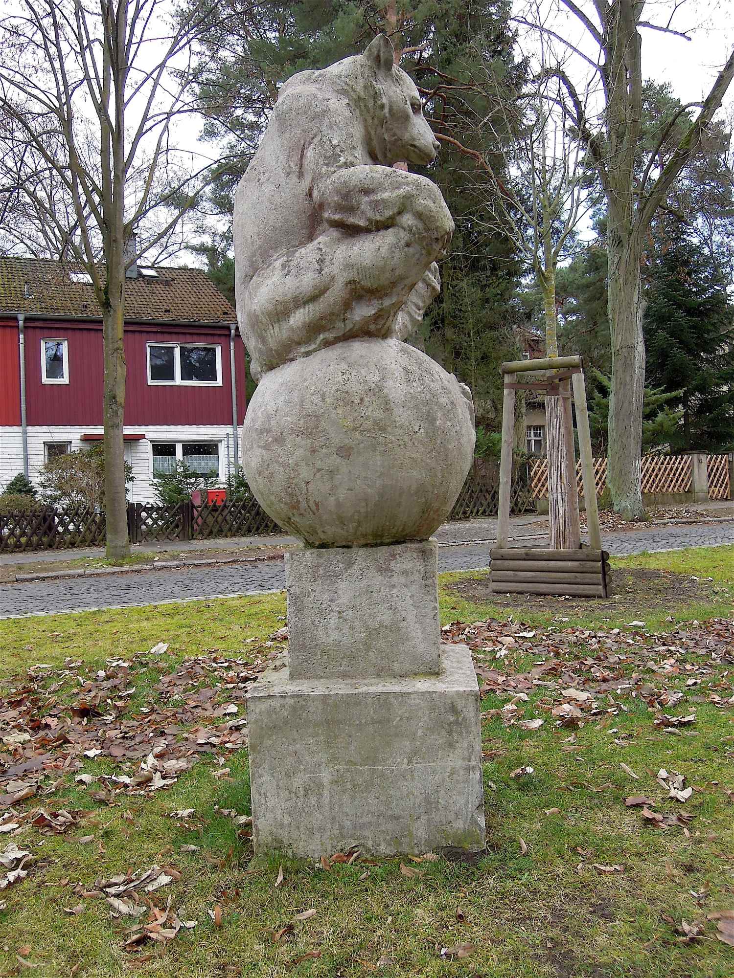 Die Kunststein-Figur – ein Bär sitzt auf einer Kugel – ist auf einem doppelten, quadratischen Betonsockel gelagert. Dargestellt ist ein gebändigter, annähernd lebensgroßer Bär mit Halskrause und Leine vor der Brust, der breitbeinig die Hinterpranken mit den vorderen Tatzen hält. Der Bär hockt wie ein Zirkusbär in vermenschlichter Haltung auf der Kugel. Körper und Gesichtszüge sind naturnah modelliert. Auf der Kugel
