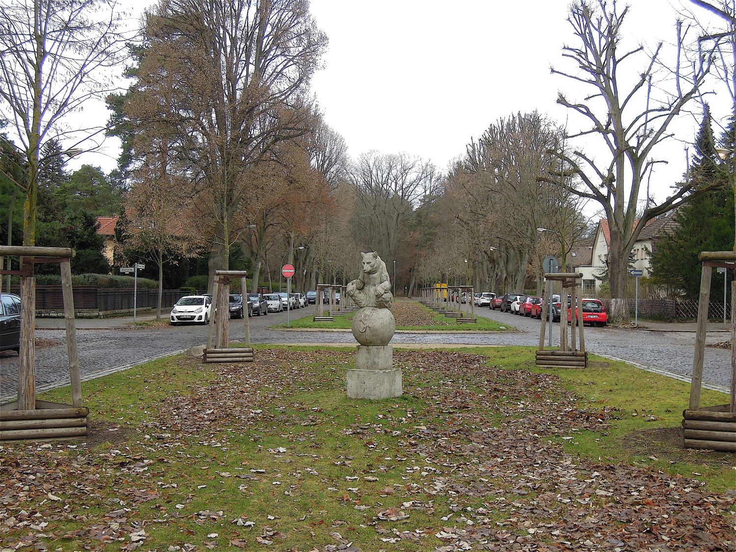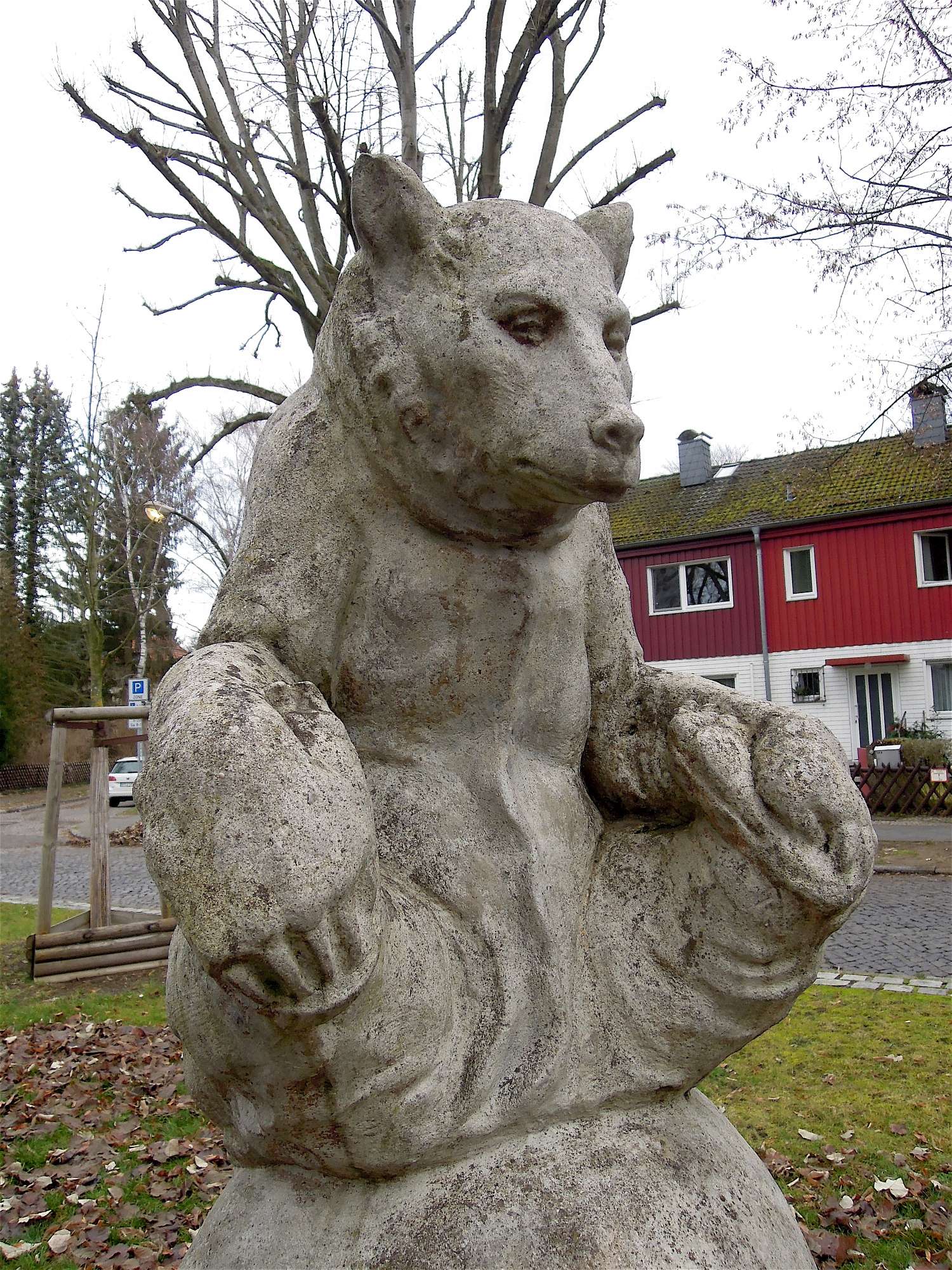 Die vom Berliner Bildhauer und Maler Richard Hegemann vermutlich um 1910-12 geschaffene Bärenskulptur kam zwischen 1945 und 1953 an die Stelle der Plastik „Kugelläuferin“, die auf dem Zeltinger Platz seit 1932 den Brunnen schmückte. Die Bronzestatue von Otto Maerker war 1942 als Metallspende für die NS-Rüstungsindustrie abgegeben worden. Richard Hegemann, der nach 1945 in Hermsdorf wohnte und dort ein Atelier hatte, überließ dem Bezirk seine Bärenskulptur. Er hatte sie wohl bereits um 1910 geschaffen. Für welchen Zweck ist bisher nicht überliefert und konnte im Rahmen dieser kurzen Erfassung nicht ermittelt werden. Die Datierung ohne Verfasserangabe geht auf Angaben in der Denkmalkartei (Berlin-West) des Landesdenkmalamtes Berlin zurück, die Hartmut Solmsdorf Mitte der 1970er Jahre verfasste (Quelle: Archiv Gartendenkmalpflege) Der Bär blieb auf dem Zeltinger Platz bis 1980, als die Kugelläuferin als Kopie an ihren ursprünglichen Standort zurückkehrte. Man versetzte ihn zur Wiltinger Straße, wo er sich noch heute auf der Mittelpromenade befindet. Um 1999 wurde die stark verdreckte Bärenfigur gereinigt, Risse geschlossen und mit einem hellen weißen Graffiti-Schutzanstrich versehen. 2007 wurde die Skulptur von einem Auto umgefahren und wohl anschließend instandgesetzt. Das Kunstwerk befindet sich im Bereich des Gartendenkmals „Straßen- und Grünflächensystem Frohnau“, zu dem die Wiltinger Straße mit der begrünten Mittelpromenade gehört (Jürgen Tomisch, Barbara Anna Lutz).