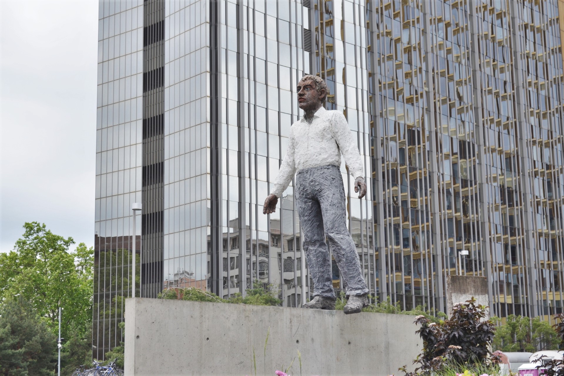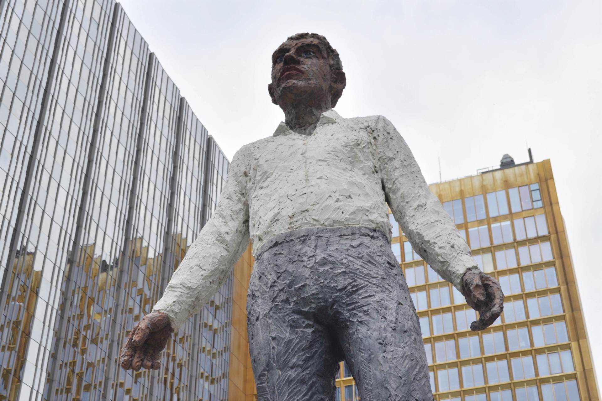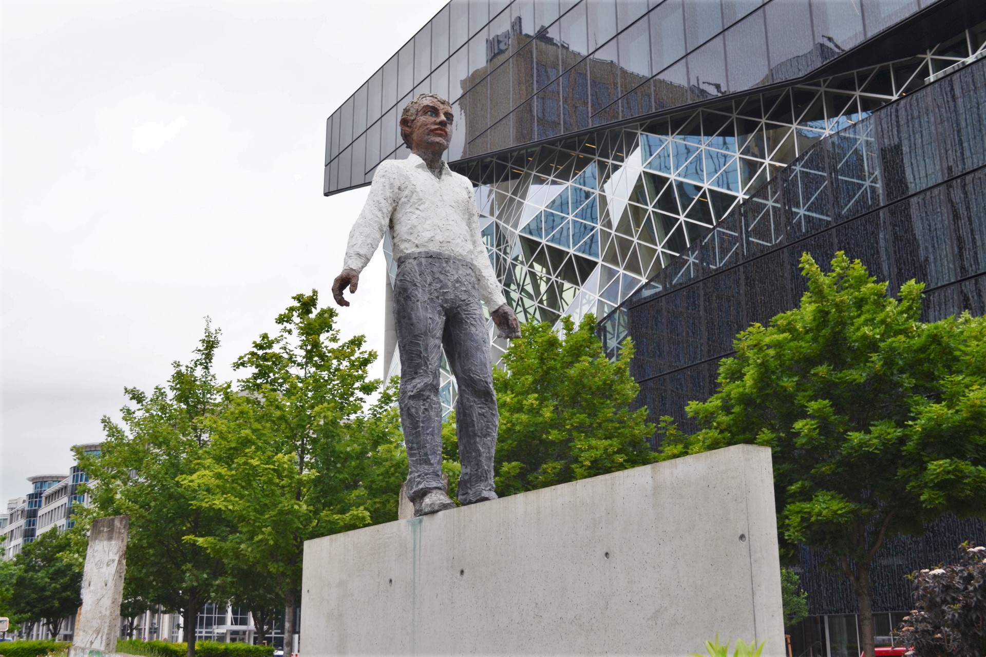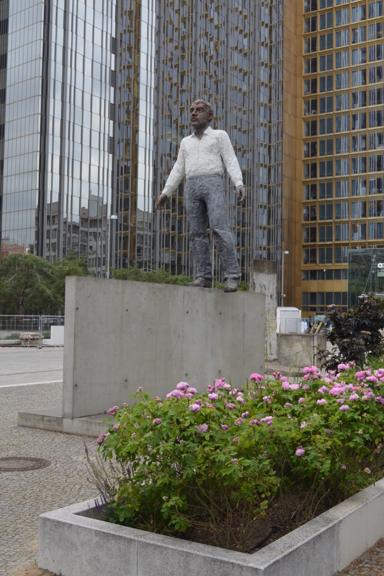 »"Balanceakt" von Stephan Balkenhol / Die Skulptur "Balanceakt" von Stephan Balkenhol / erinnert an den 50. jahrestag der Grundsteinlegung des Axel- / Springer-Hauses. Der Verleger Axel Springer errichtete es / 1959 unmittelbar an der Grenze zum sowjetisch besetzten / Sektor Berlins, dem späteren Verlauf der Berliner Mauer. / Sein Haus wurde ein Leuchtturm des freien Westens. / An seinem Traum von der Einheit Deutschlands hielt / Axel Springer gegen alle Widerstände fest. Sein unwandel- / bares Bekenntnis zu Freiheit und Selbstbestimmung der / gesamten Nation hat dazu beigetragen, die Mauer zu / überwinden. / Stephan Balkenhol schuf das Werk 2009,20 Jahre nach / dem Fall der Mauer, auf Anregung der BILD-Zeitung. Die / 5,80 Meter hohe Arbeit besteht aus bemalter Bronze, Beton / und Teilen der Berliner Mauer. / Berlin, 25.Mai 2009 / www.axelspringer.de/balanceakt«