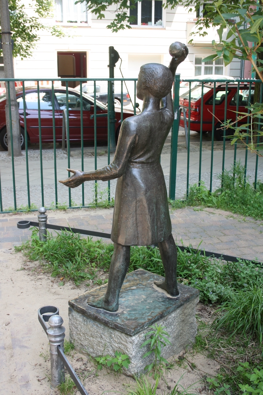 Stefanie Endlich und Bernd Wurlitzer erwähnen die Plastik in ihrem 1990 erschienenen Werk zu den Skulpturen und Denkmälern in Berlin nicht. Auch Malwine Hörisch und Wolfgang Krause weisen in ihren „Kunstspaziergänge(n)“ 2004 explizit nicht auf die Plastik. Die Plastik stand 2009 sockellos weiter in den inneren Spielplatzbereich gerückt im Sand, wie eine Aufnahme von Werner Rommel für http://www.bildhauerei-in-berlin.de belegt. Die Aufsockelung ist also zwischen 2009 und 2013 vorgenommen worden. Der nach 1990 gestohlene Kopf musste von der Künstlerin nachgebildet werden und wurde in der Gießerei Seiler neu gegossen und angepasst. Die Einfassung des Pflanzbeetes besteht aus dem eisernen „Tiergartengitter“ und ist zum Eingang hin geöffnet. "Im Zuge der in den kommenden Jahren durchgeführten Baumaßnahmen am S-Bahnhof wird der Spielplatz reduziert und die Plastik wird erneut umgesetzt werden (Freundl. Mitteilung von Frau L. Benjamin, Bezirksamt Pankow, Tiefbau- und Landschaftsplanungsamt)" (Stand 2013). Typisches Beispiel einer, bei einer gewissen Steifheit sicher formulierten, aber spannungslosen Genredarstellung der Plastik in der DDR der 1950er Jahre. (Jörg Kuhn).
