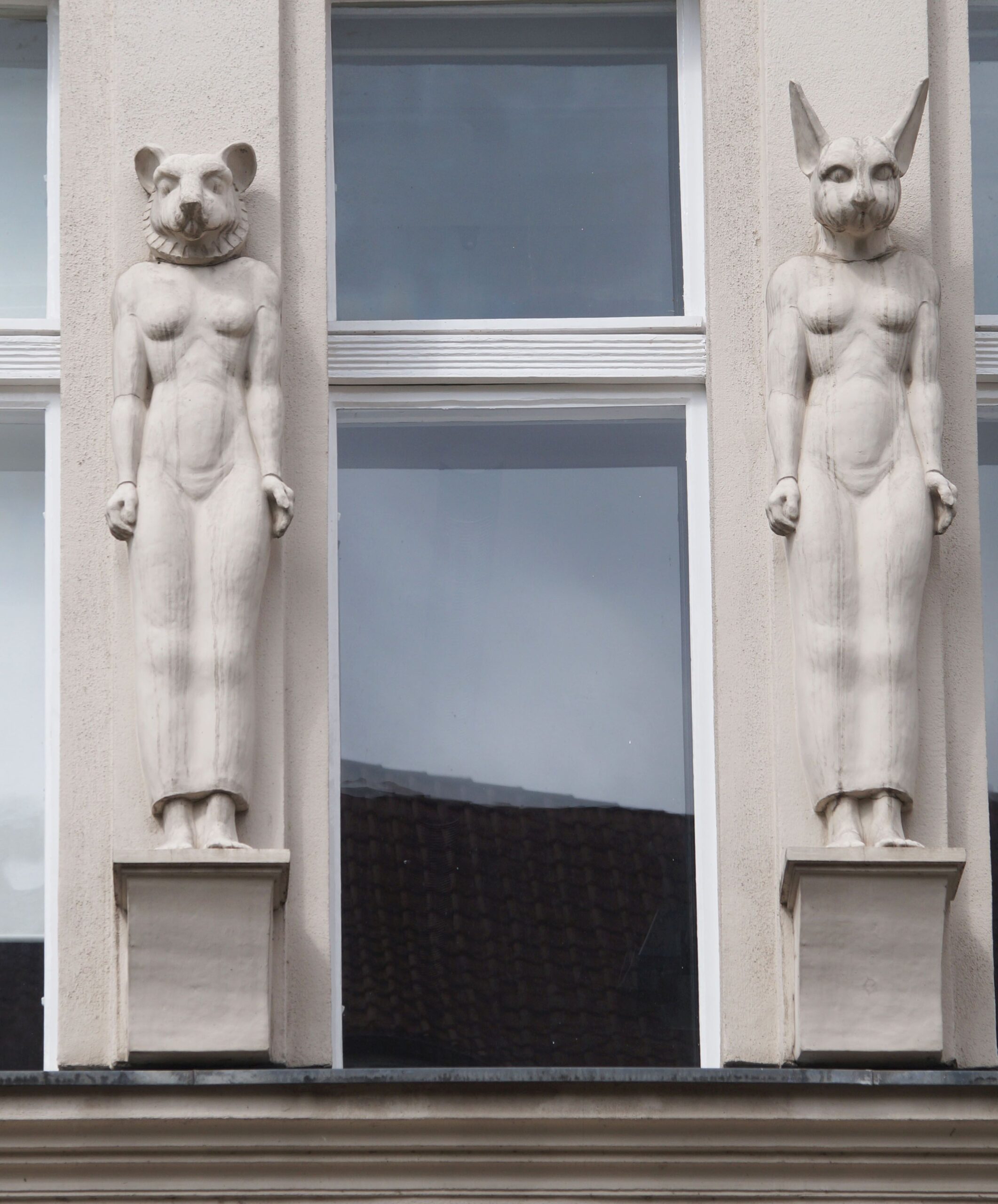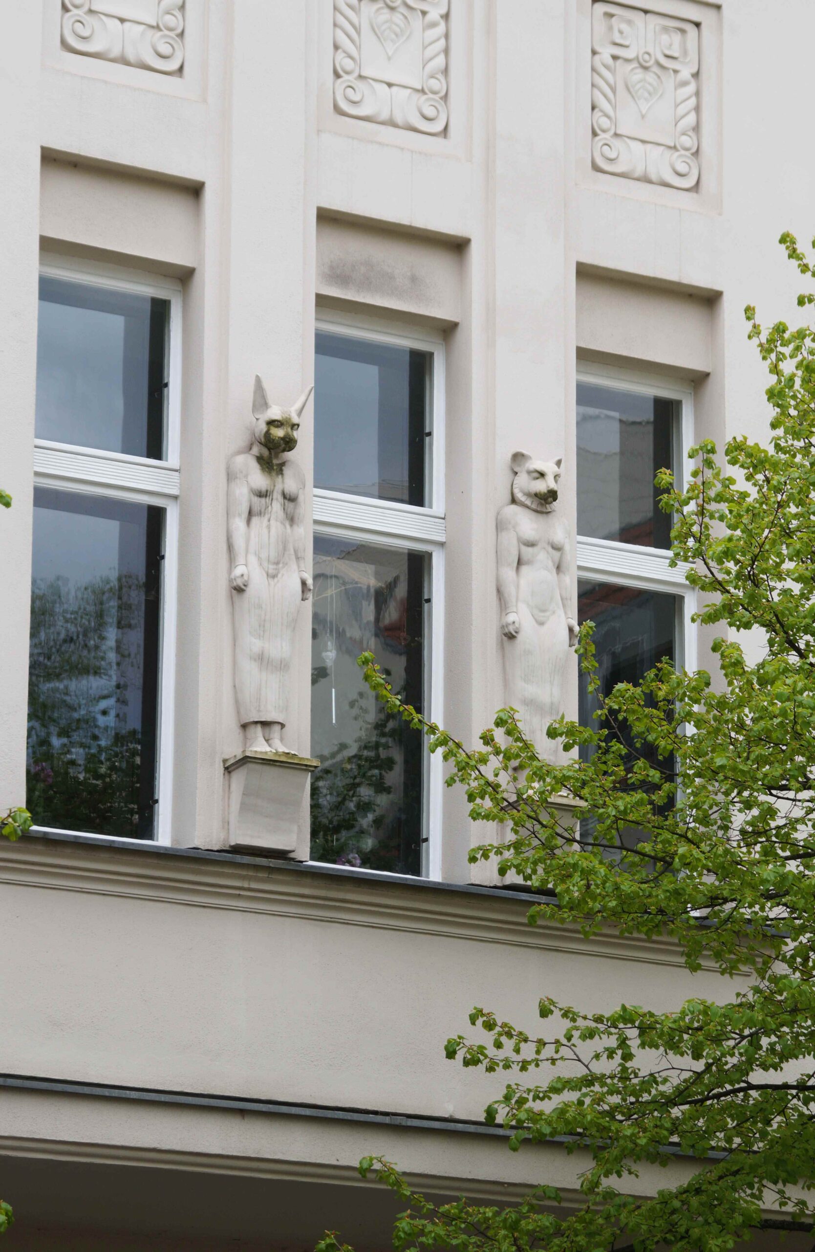 In Höhe des ersten Obergeschosses des Wohn- und Geschäftshauses in der Bölsche- / Aßmannstraße befinden sich vor den mittleren Bereichen der Erker je zwei ca. lebensgroße weibliche, aufrecht stehende Figuren. Sie sind bekleidet mit knöchellangen Gewändern, die die weiblichen Körperformen kaum verbergen. Die Köpfe sind als zwei altägyptische Gottheiten gestaltet: der Katzenkopf verweist auf Bastet, die Göttin der Fruchtbarkeit und Mutterschaft, der Löwenkopf auf Sachmet, die Göttin des Krieges (Nicola Vösgen).