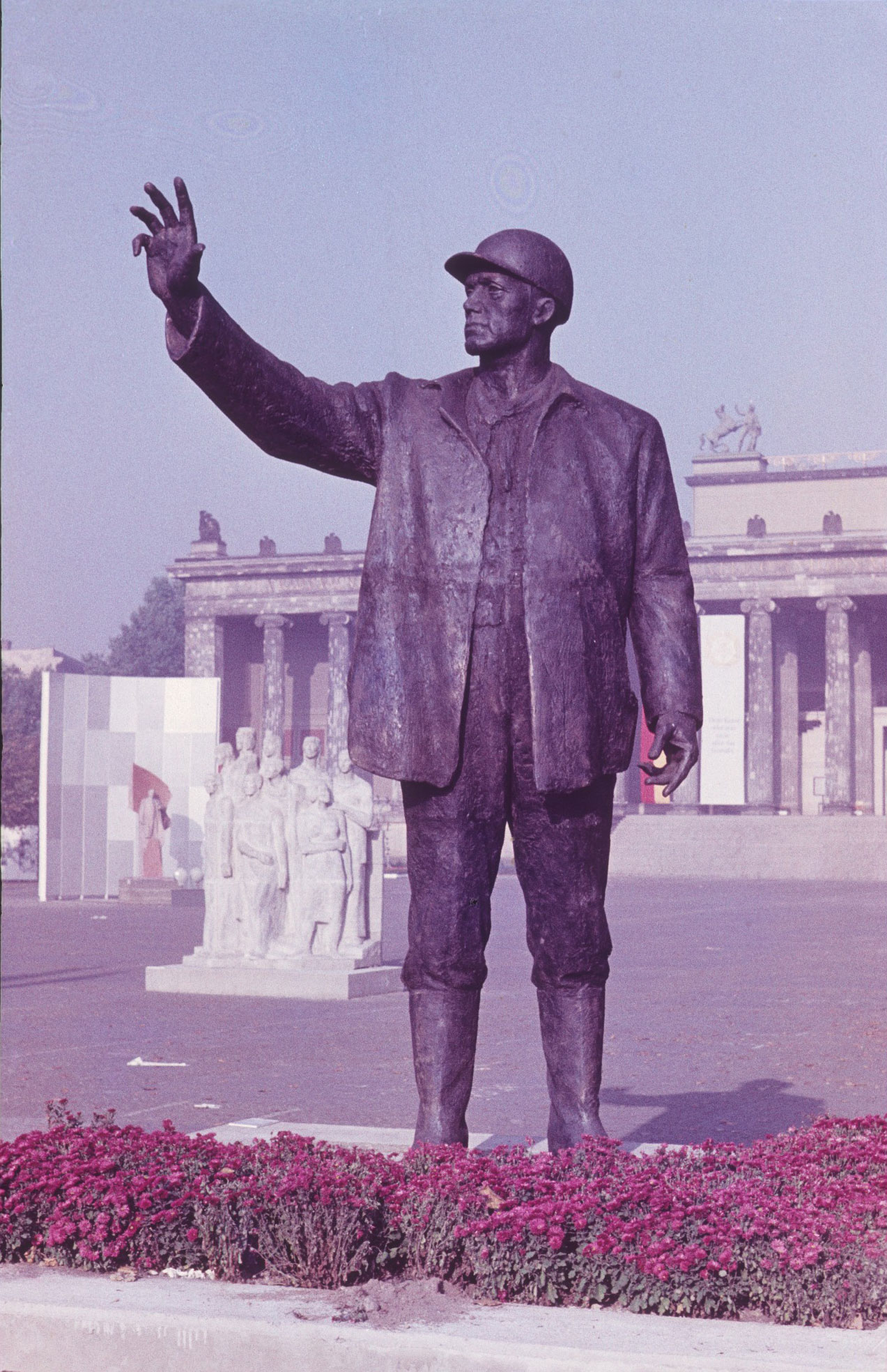 1968 war Gerhard Thieme vom FDGB-Bundesvorstand und der Industriegewerkschaft Bau/Holz mit der Schaffung einer „Bauarbeiterplastik in Bronze“ beauftragt worden (Neue Zeit, 24. Jg., 4.12.1968, S. 2). Bereits ein Jahr später, 1969, war in der Ausstellung „Architektur und bildende Kunst. Ausstellung zum 20. Jahrestag der DDR“ im Alten Museum in Berlin der Bauarbeiter sowohl als Entwurf in Gips (60cm) wie auch als überlebensgroßes Bronzebildwerk (350cm) zu sehen. Die Bronzeausführung war im Spätsommer 1969 in der Gießerei Seiler & Siebert in Schöneiche entstanden (Archiv der ADK, VBK-Zentralvorstand 415, Schriftwechsel Thieme). Noch im selben Jahr wurde Thieme für den Bauarbeiter mit dem „Kunstpreis des FDGB für bildende und angewandte Kunst“ ausgezeichnet (Berliner Zeitung, 25. Jg., 21.12.1969, S. 6). Im Frühjahr 1970 ist die Skulptur in der Karl-Liebknecht-Straße vor dem Haus des Ingenieur-Hochbaus (IHB) aufgestellt worden (Neue Zeit, 26. Jg., 29.04.1970, S. 6). Von Juli bis Oktober 1971 war der Bauarbeiter in einer Ausstellung im Geraer Park zu sehen und kehrte anschließend an seinen vorherigen Standort in Berlin zurück. Im Herbst 2006 musste die Skulptur demontiert werden, da die Standfestigkeit aufgrund von durchgerosteten Schrauben nicht mehr gewährleistet war. In der Kunstgießerei Seiler in Schöneiche wurde sie gereinigt und es wurden neue Edelstahlschrauben eingesetzt (Kammer, Bernd: Bauarbeiter-Denkmal frisch saniert und wieder bereit, »Hände zu schütteln«, in: Neues Deutschland, 16.10.2006). Im Oktober 2006 kehrte der Bauarbeiter an seinen Standort in der Karl-Liebknecht-Straße zurück (Nicola Vösgen).