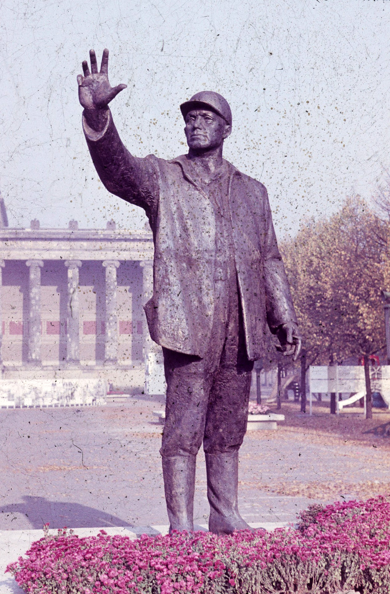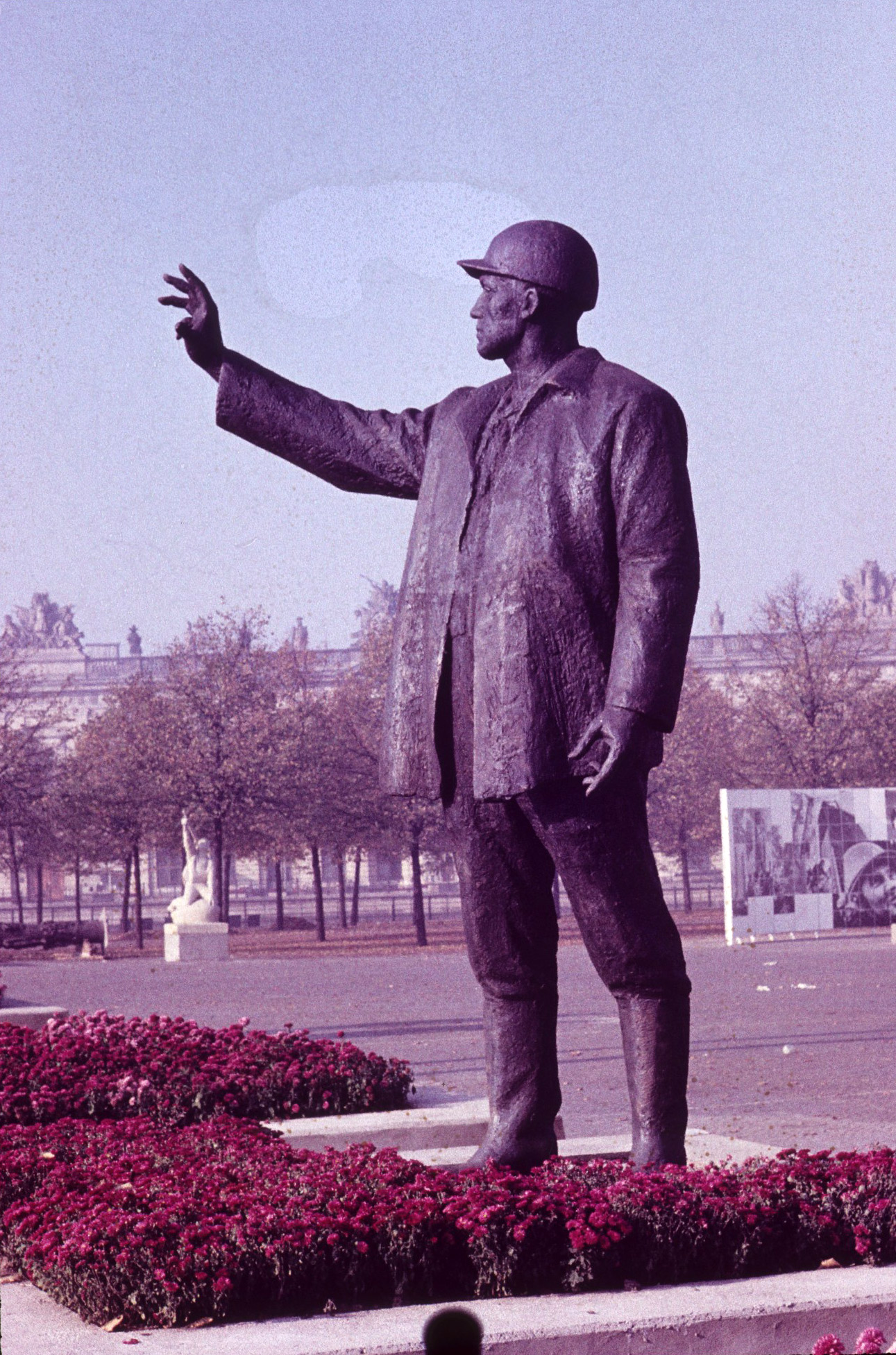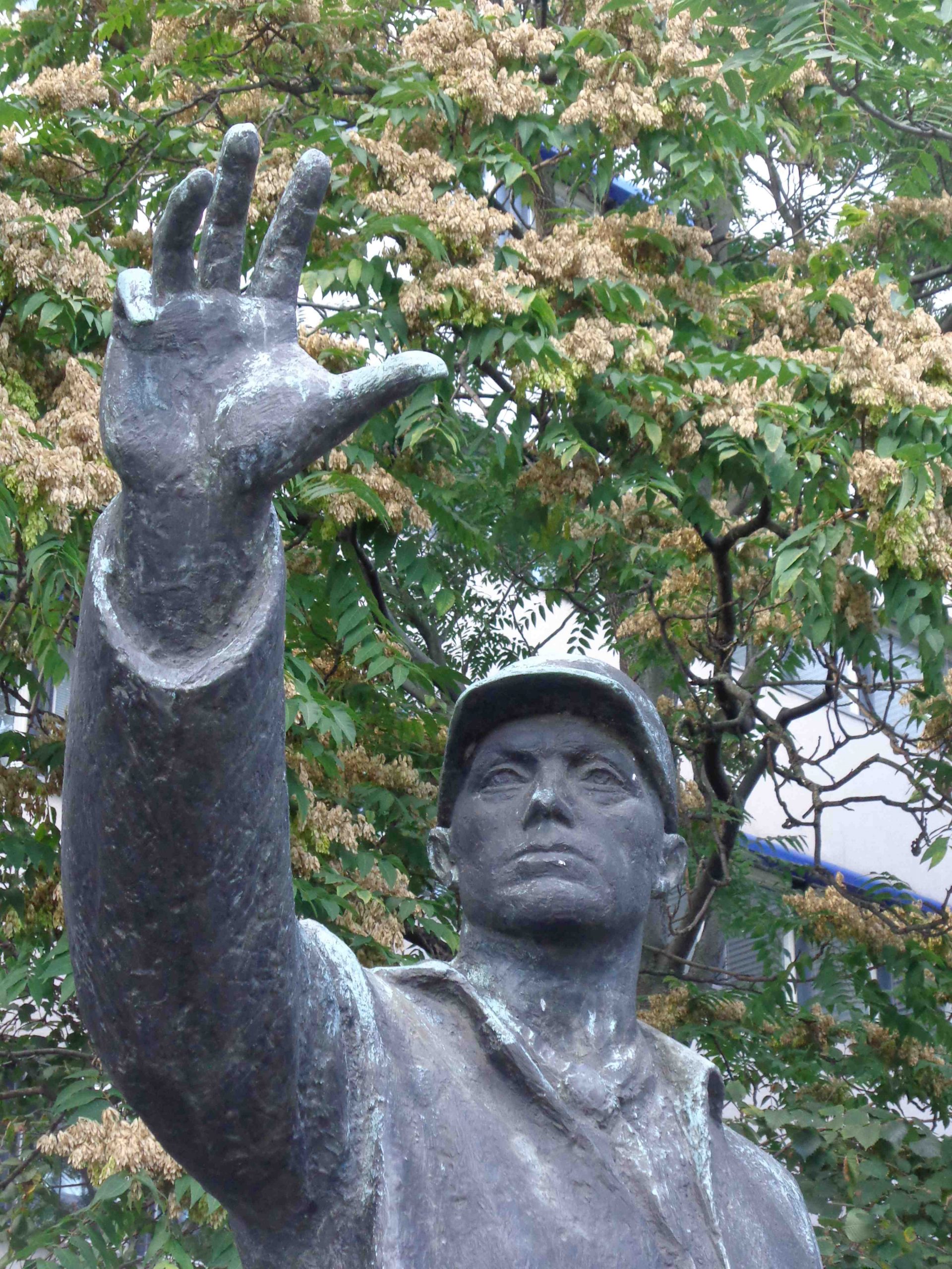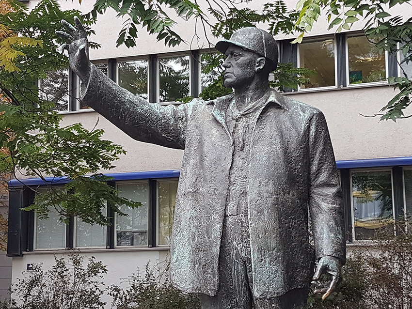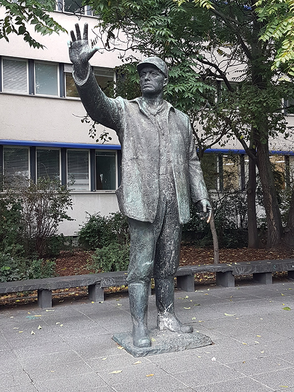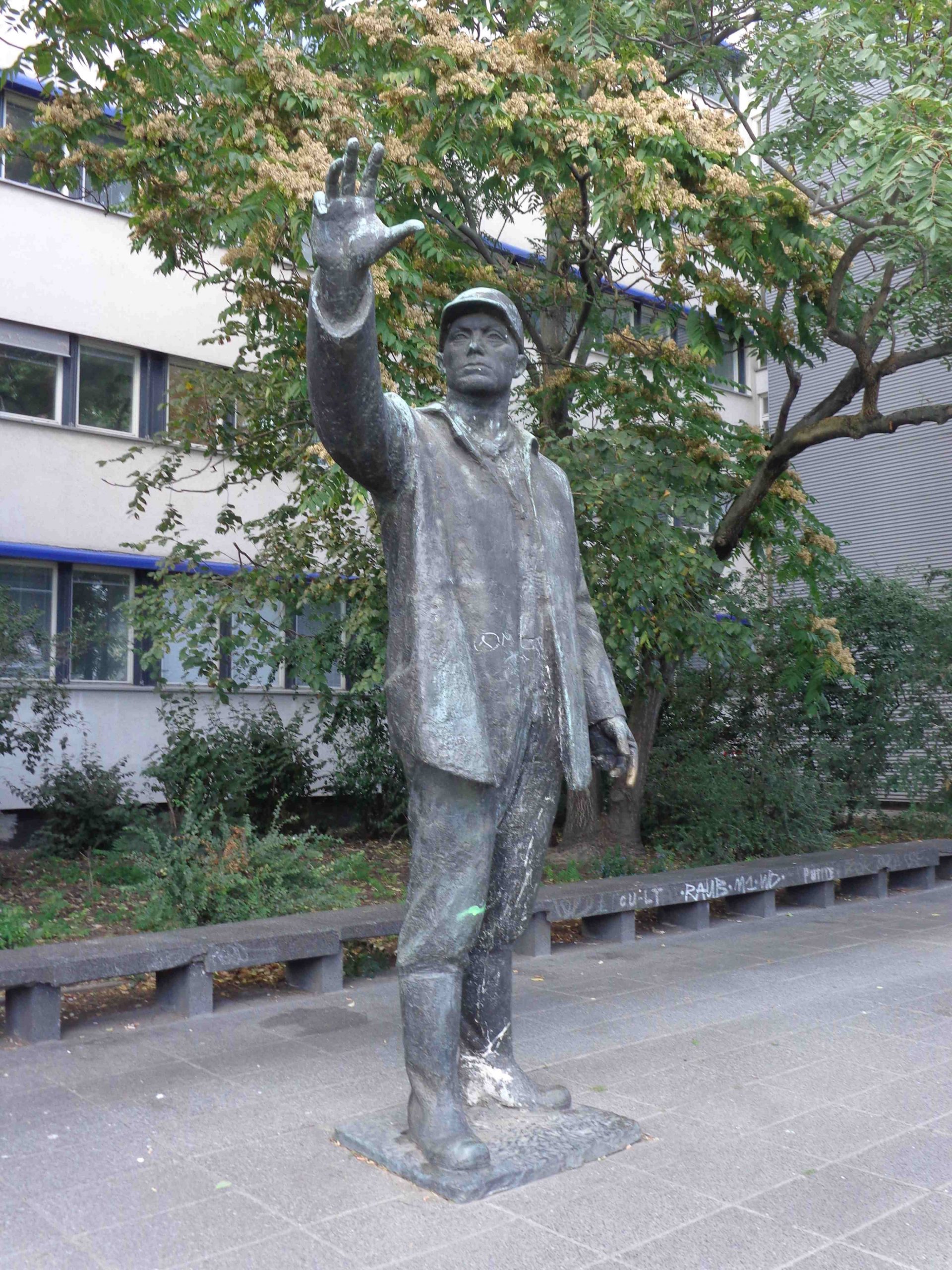 Auf rechteckiger Plinthe steht die durch Bekleidung und Schutzhelm als Bauarbeiter gekennzeichnete Figur eines kräftigen Mannes, der den Kopf seiner erhobenen rechten Hand, mit der er offenbar eine Stärke oder Größe andeutet, zugewendet hält.