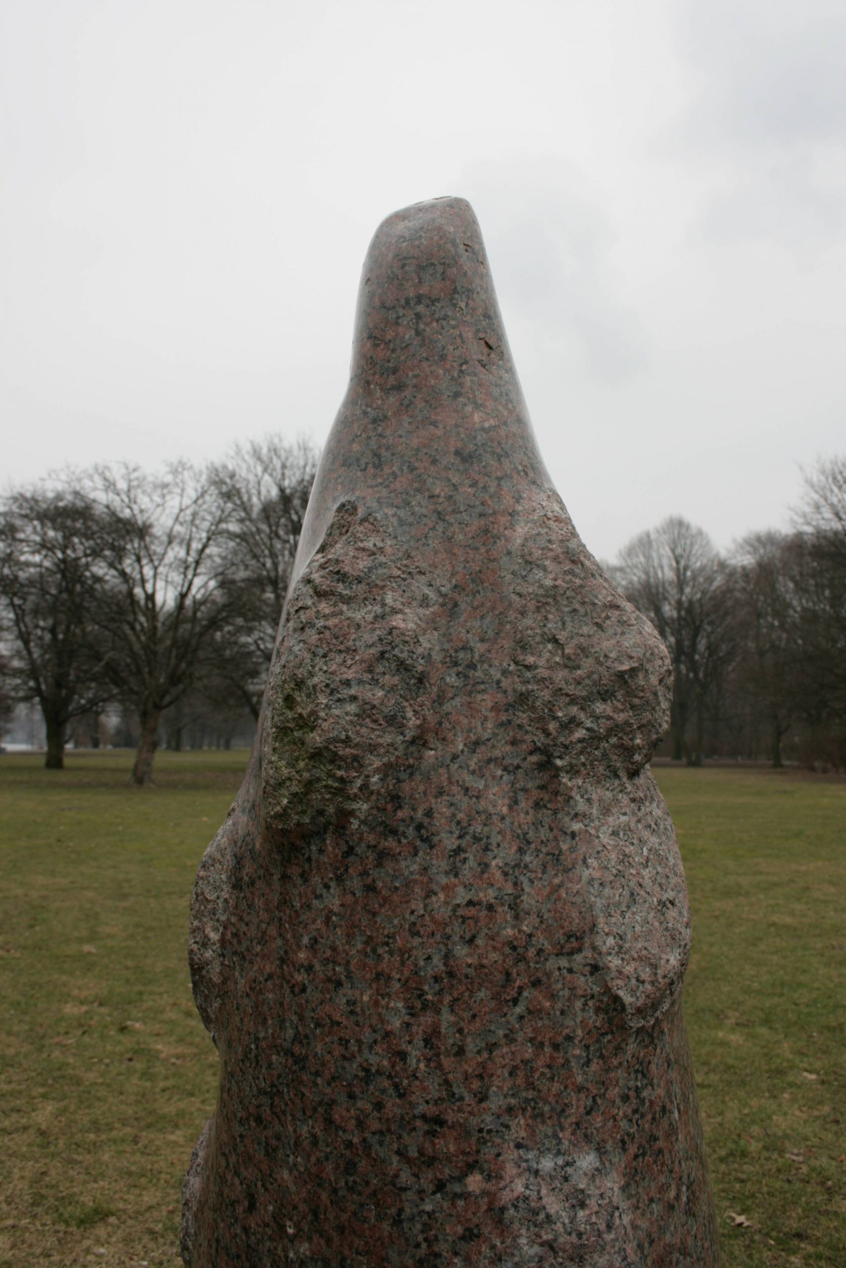 Auf einem polygonalen Sockel aus rot gefärbtem Beton steht die Skulptur in Gestalt eines knorrigen, sich nach oben verjüngenden Baumes, gearbeitet aus einem sehr schönen rotgraugefleckten Granit. Die Flächen sind fein poliert. Nur dort, wo Astansätze angedeutet werden sollen, ist das Material grob geglättet und unpoliert (Jörg Kuhn).