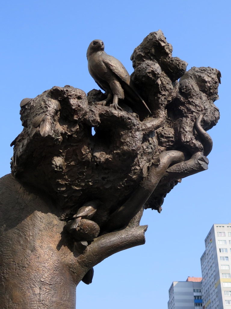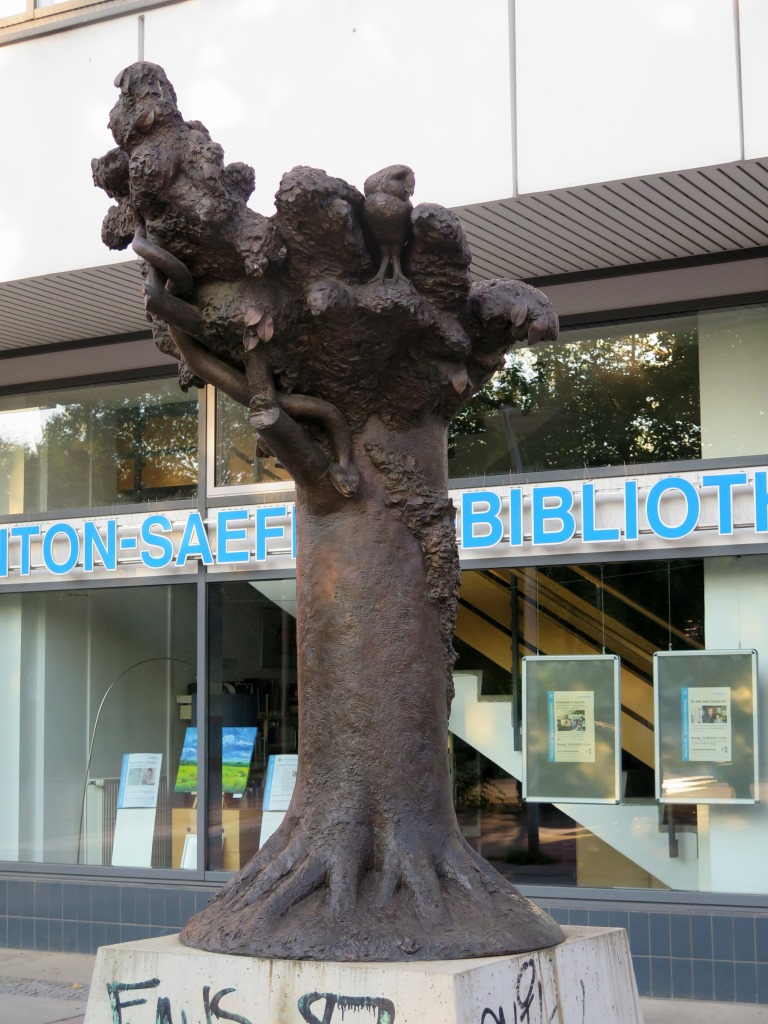 Auf dem Boulevard des Anton-Saefkow-Platzes, genau vor der Anton-Saefkow-Bibliothek, steht eine bronzene Baumskulptur mit vom Wind zerzaustem Geäst. In der Baumkrone, die den Garten Eden symbolisiert, sitzen eine Eule als Metapher der Weisheit, eine Amsel und ein Bussard, eine Schlange windet sich den Stamm herab. Die starken Wurzeln des mächtigen Stammes sind fest im Boden verankert. Die Skulptur steht auf einem hohen Kunststeinsockel, auf dessen Rückseite eine trapezförmige Bronzetafel ein Zitat, den Titel des Denkmals und eine Würdigung der Förderer befindet (Nicola Vösgen).