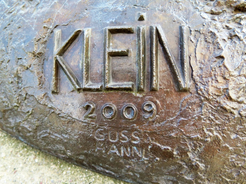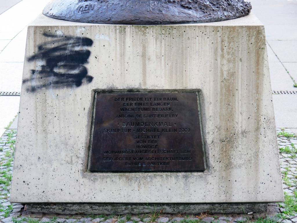 »DER FRIEDE IST EIN BAUM, / DER EINES LANGEN / WACHSTUMS BEDARF. / ANTOINE DE SAINT-EXUPÉRY / . BAUMDENKMAL . / SKULPTUR . MICHAEL KLEIN 2009 / GESTIFTET / VON DER / HOWOGE / WOHNUNGSBAUGESELLSCHAFT mbH / GEFÖRDERT VOM ARCHITEKTURBÜRO / RÜHLE & PARTNER«