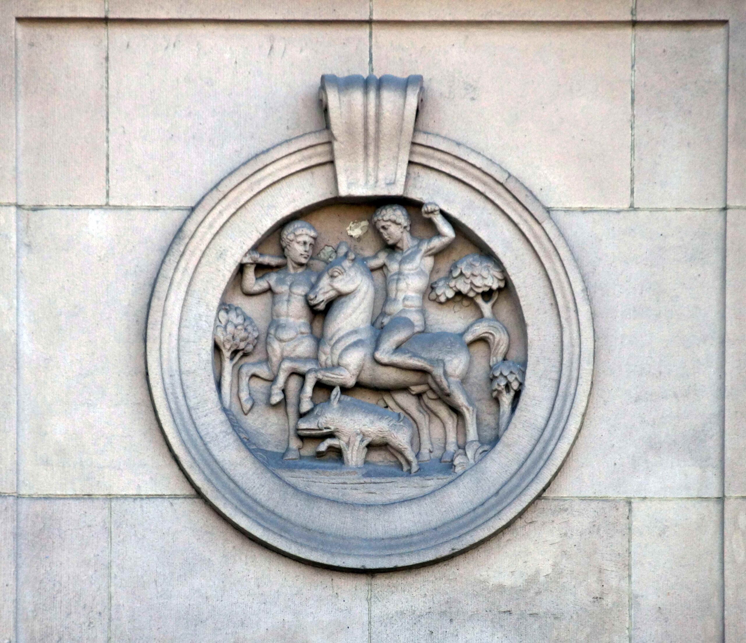 Über den beiden äußeren Türen des Portals der Schule am Schillerpark befinden sich zwei große Medaillons. Das Linke zeigt zwei nach rechts schreitende Ponys, die zwei nackte Mädchen auf dem Rücken tragen. Auf dem Rechten ist ein nach links galoppierendes Pony mit einem Knaben auf seinem Rücken zu sehen. Dahinter schreitet ein sehr jugendlicher Kentaur (lt. der griechischen Mythologie: ein Mischwesen aus Pferd und Mensch) mit einer Keule in der rechten Hand. Im Vordergrund ein nach links eilendes Wildschwein (Nicola Vösgen).