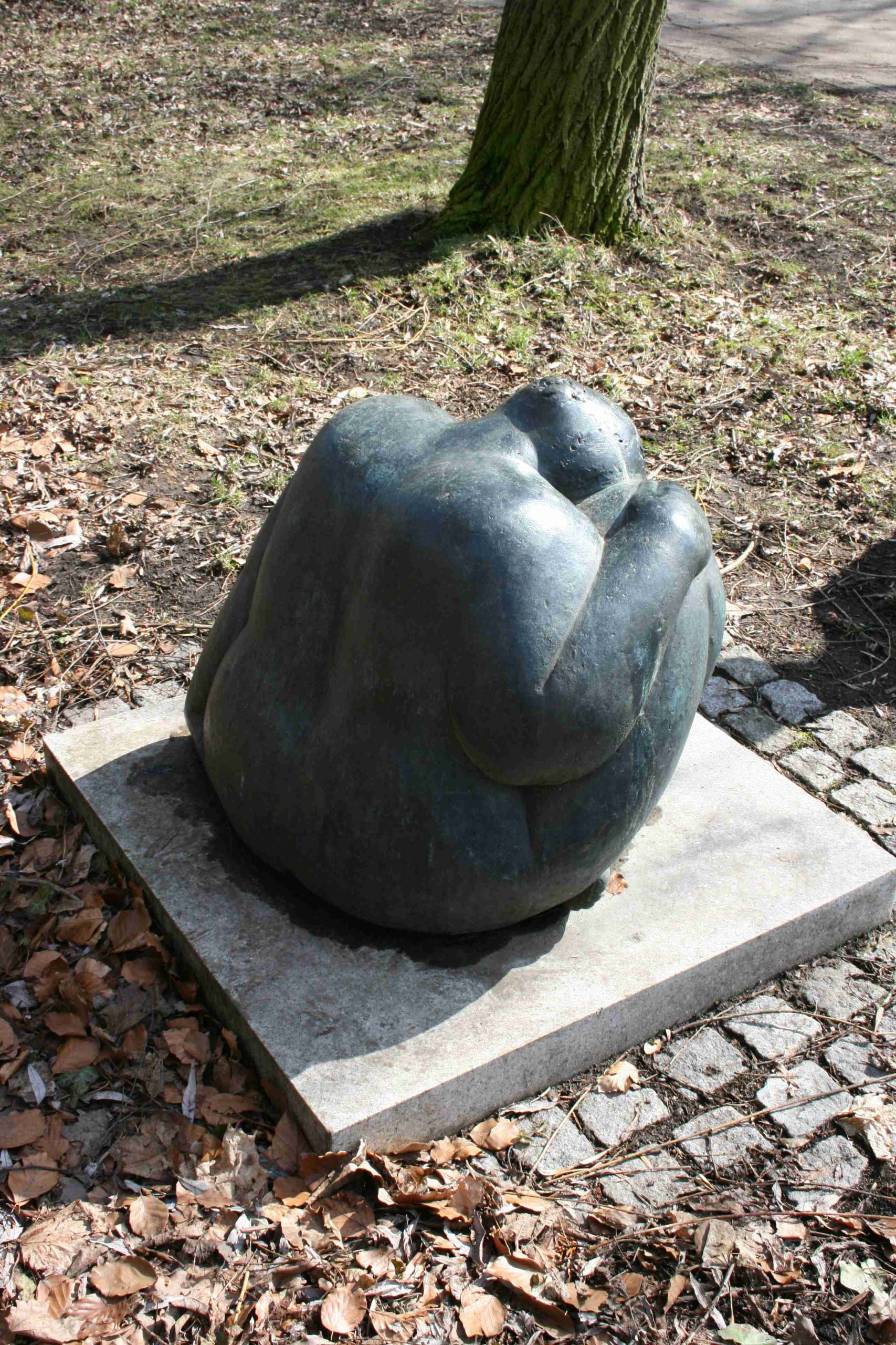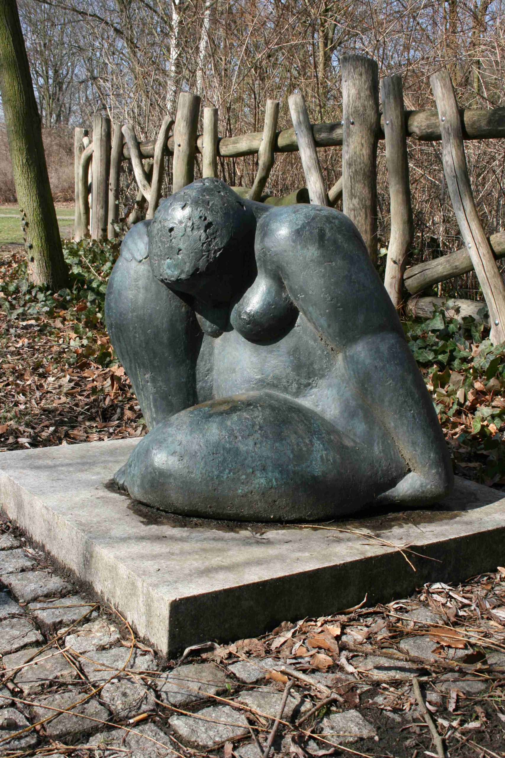 Die dunkel patinierte Bronzeplastik hat einen niedrigen rechteckigen Sockel aus poliertem Granit, es ist die Darstellung einer korpulenten nackten Frau, die auf dem Boden hockt. Beide Beine sind angewinkelt, der rechte Fuß ist direkt am Körper aufgestellt, der linke Fuß ist untergeschlagen. Die Frau hat den Kopf tief nach vorne gebeugt, und auf den kleinen Brüsten aufgelegt. Die rechte Hand liegt auf dem Knie des aufgestellten rechten Beins, die linke Hand ist unter das Gesäß geschoben. Die Figur ist insgesamt kompakt gestaltet und hat annähernd die Form einer Kugel (Susanne Kähler).