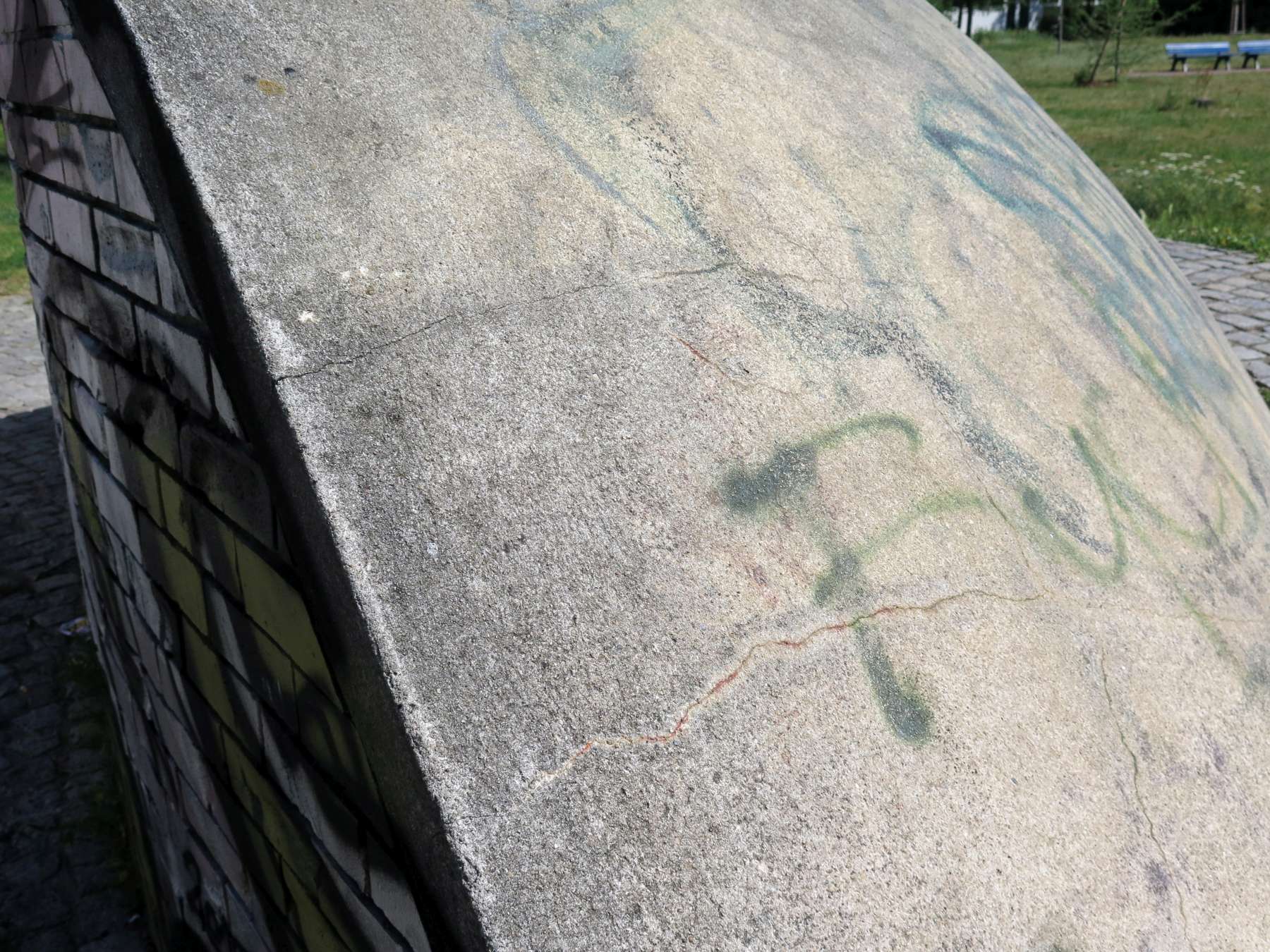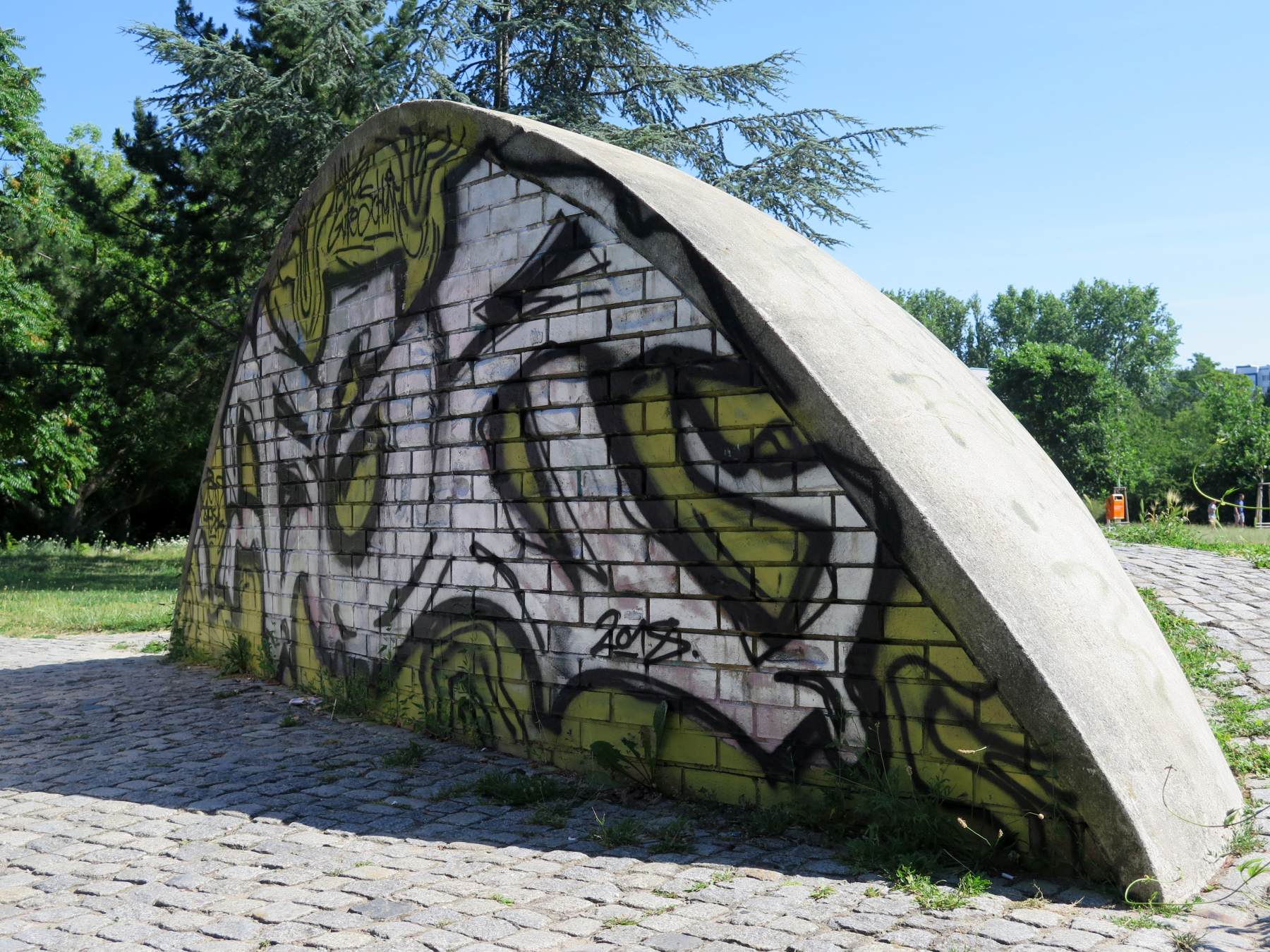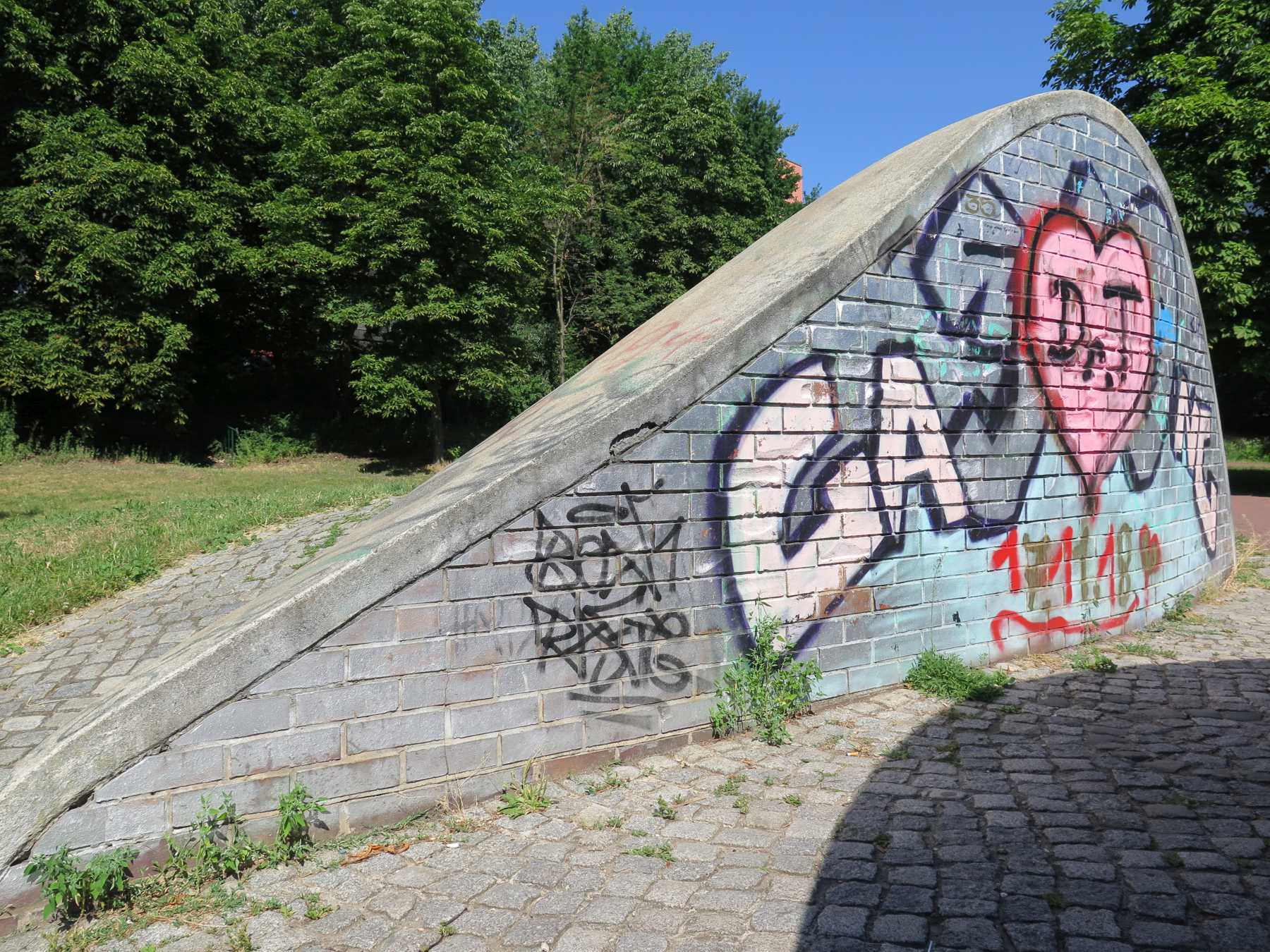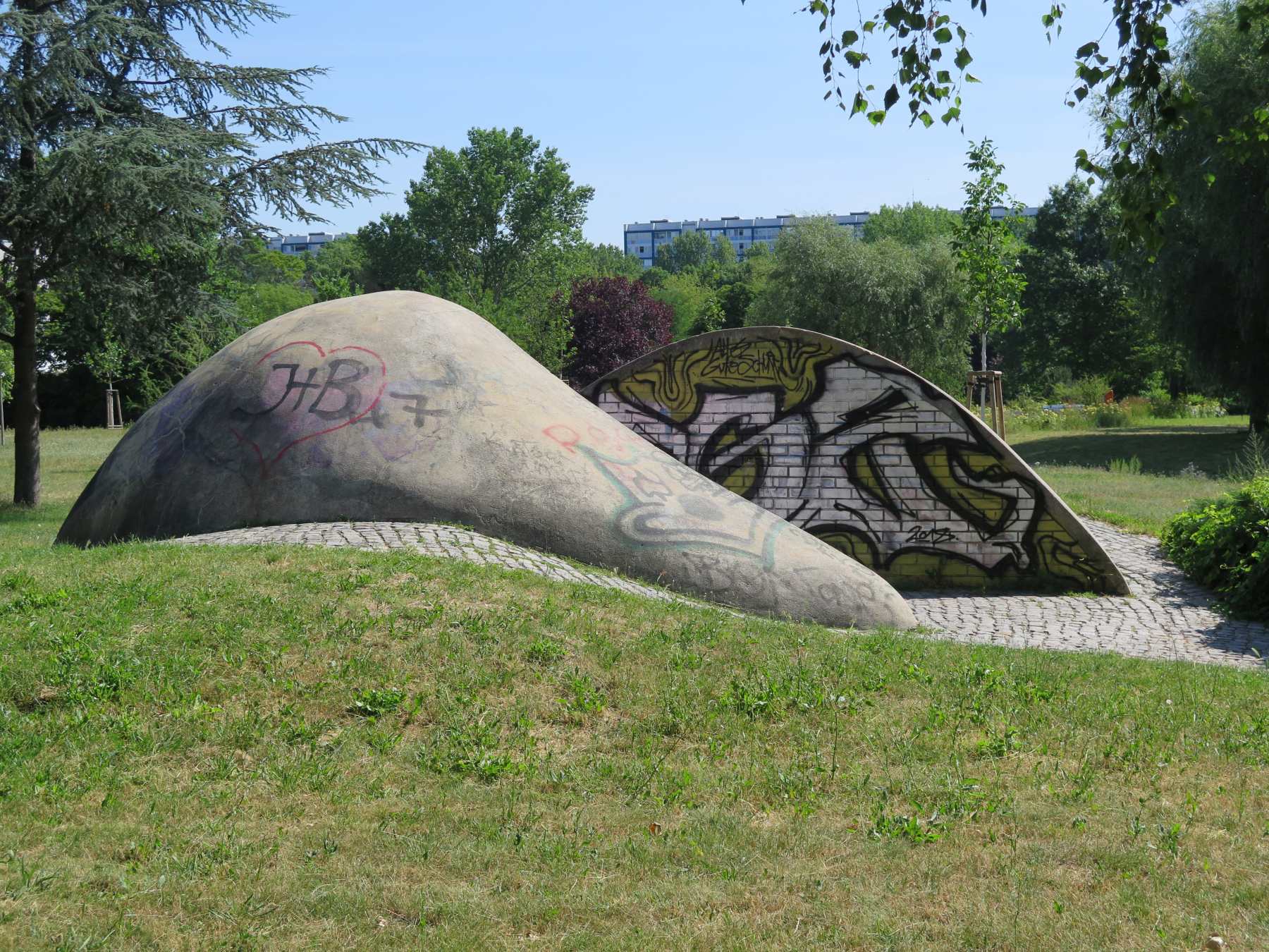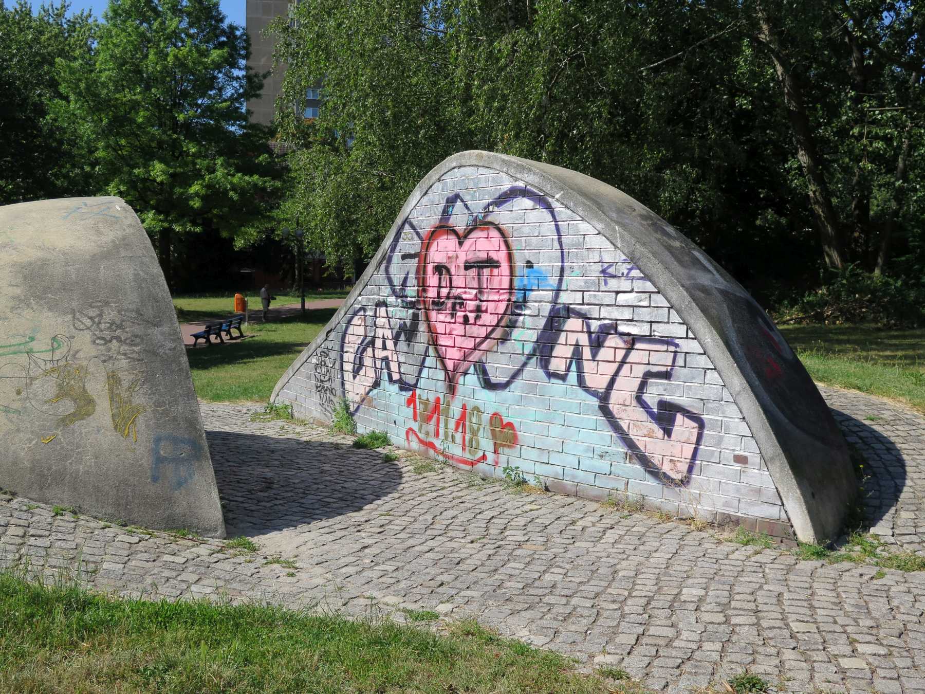 Wegmarkierende geometrische Körper, auch als „plastisches Gebilde“ beschrieben. Wenn man vom Anton-Saefkow-Platz den Fennpfuhlpark betritt, blickt man unmittelbar auf eine aus einer geteilten Halbkugel gebildete großflächige Landschaftsplastik. Sie wird von einem mit Granitsteinen ausgelegten Weg durchschnitten und von zwei außen herumführenden Wegen umschlossen. Die Außenflächen sind mit Zement verputzt, die Innenseiten bestehen aus Klinkersteinen, auf denen sich zahlreiche kleine Reliefdarstellungen einzelner und sich begegnender Menschen befinden. Die Szenen gewähren dem Betrachter viel Spielraum für Interpretationen. Die weichen organischen Formen der Plastik bilden einen interessanten Kontrast zu der strengen hochaufragenden Architektur am Anton-Saefkow-Platz. An der östlichen Innenseite des Durchgangs befindet sich unten rechts ein Klinkerstein mit der Bezeichnung „DOESE 1983/86 / Großräschen“. Davor ist eine stilisierte Hand erkennbar (Nicola Vösgen).
