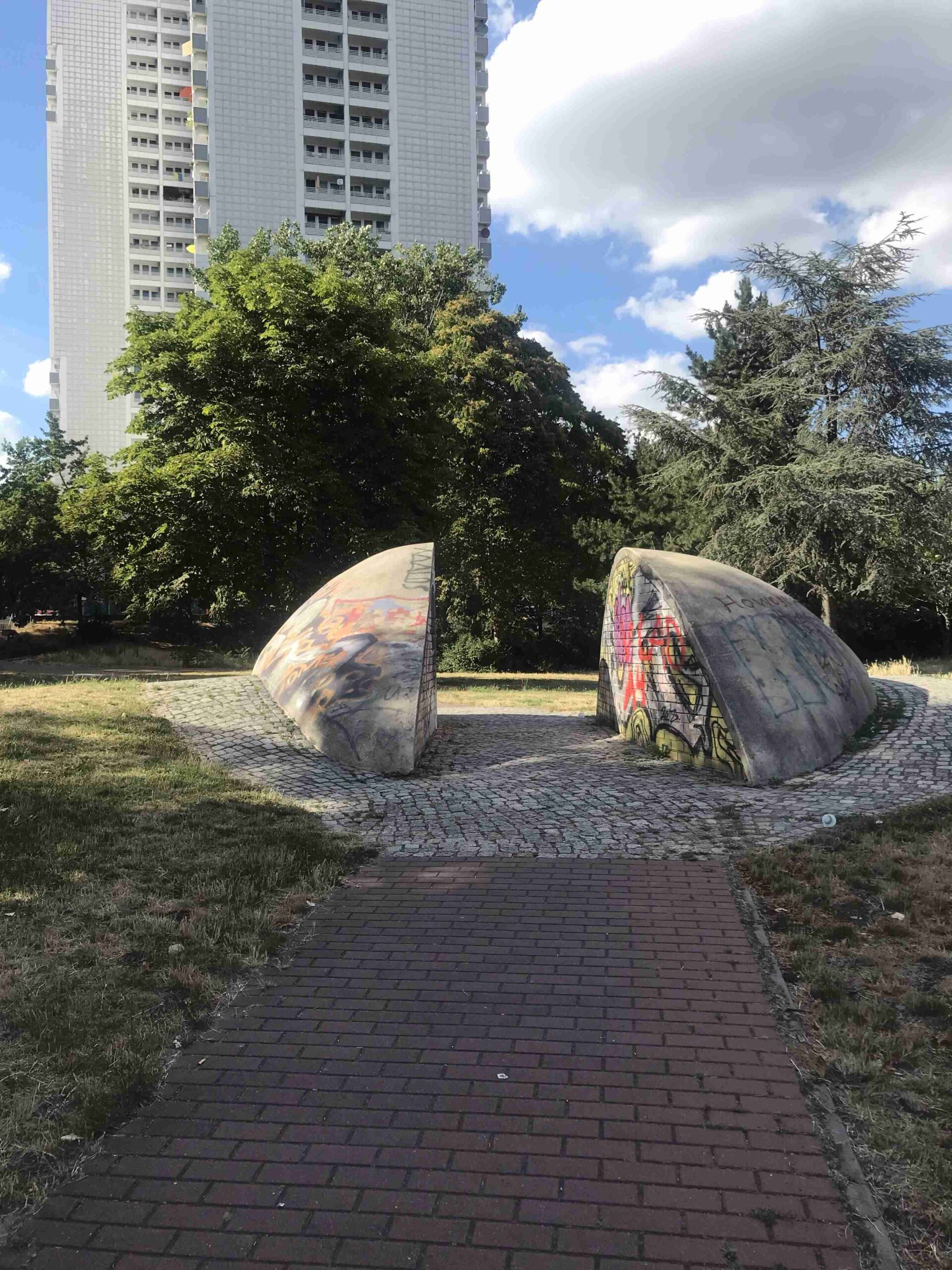 Wegmarkierende geometrische Körper, auch als „plastisches Gebilde“ beschrieben. Wenn man vom Anton-Saefkow-Platz den Fennpfuhlpark betritt, blickt man unmittelbar auf eine aus einer geteilten Halbkugel gebildete großflächige Landschaftsplastik. Sie wird von einem mit Granitsteinen ausgelegten Weg durchschnitten und von zwei außen herumführenden Wegen umschlossen. Die Außenflächen sind mit Zement verputzt, die Innenseiten bestehen aus Klinkersteinen, auf denen sich zahlreiche kleine Reliefdarstellungen einzelner und sich begegnender Menschen befinden. Die Szenen gewähren dem Betrachter viel Spielraum für Interpretationen. Die weichen organischen Formen der Plastik bilden einen interessanten Kontrast zu der strengen hochaufragenden Architektur am Anton-Saefkow-Platz. An der östlichen Innenseite des Durchgangs befindet sich unten rechts ein Klinkerstein mit der Bezeichnung „DOESE 1983/86 / Großräschen“. Davor ist eine stilisierte Hand erkennbar (Nicola Vösgen).