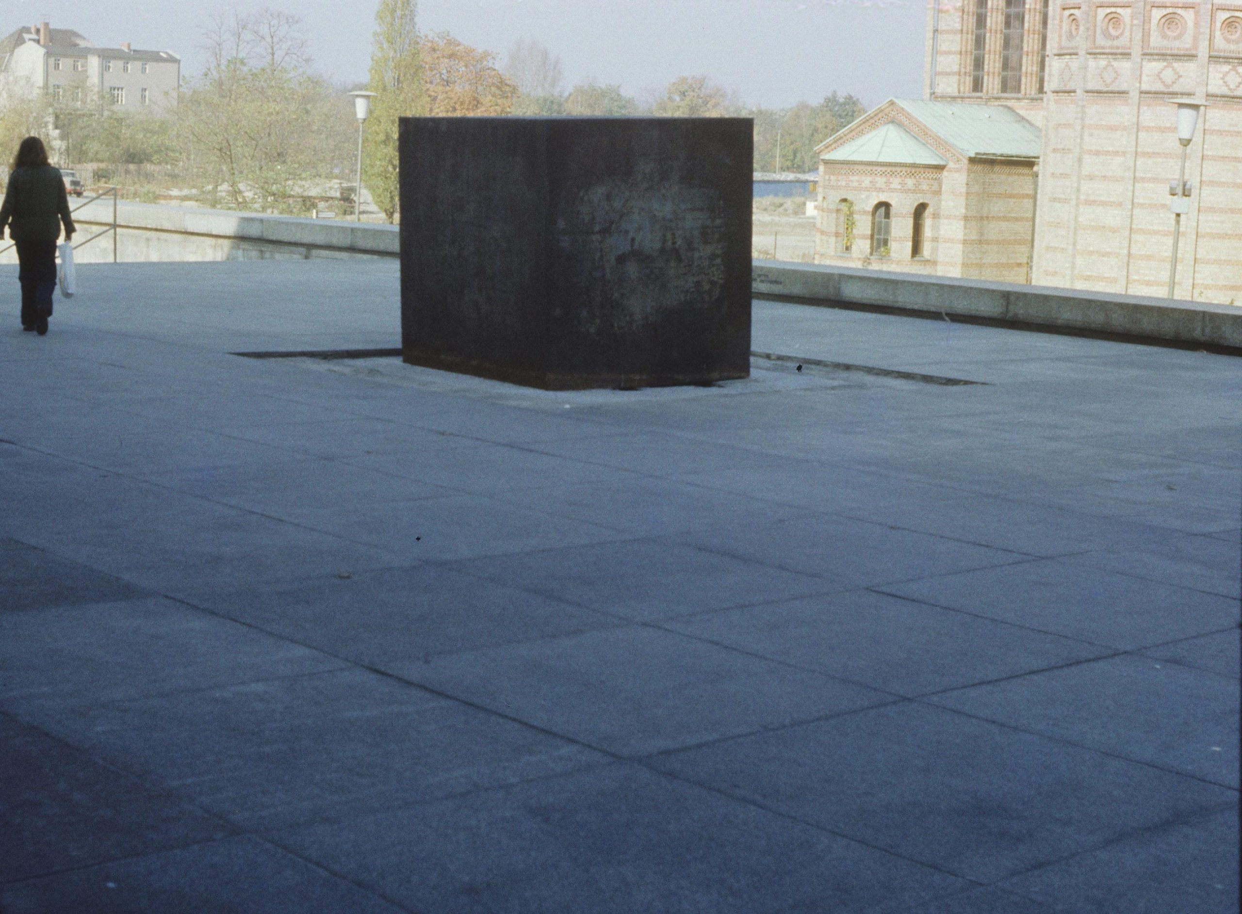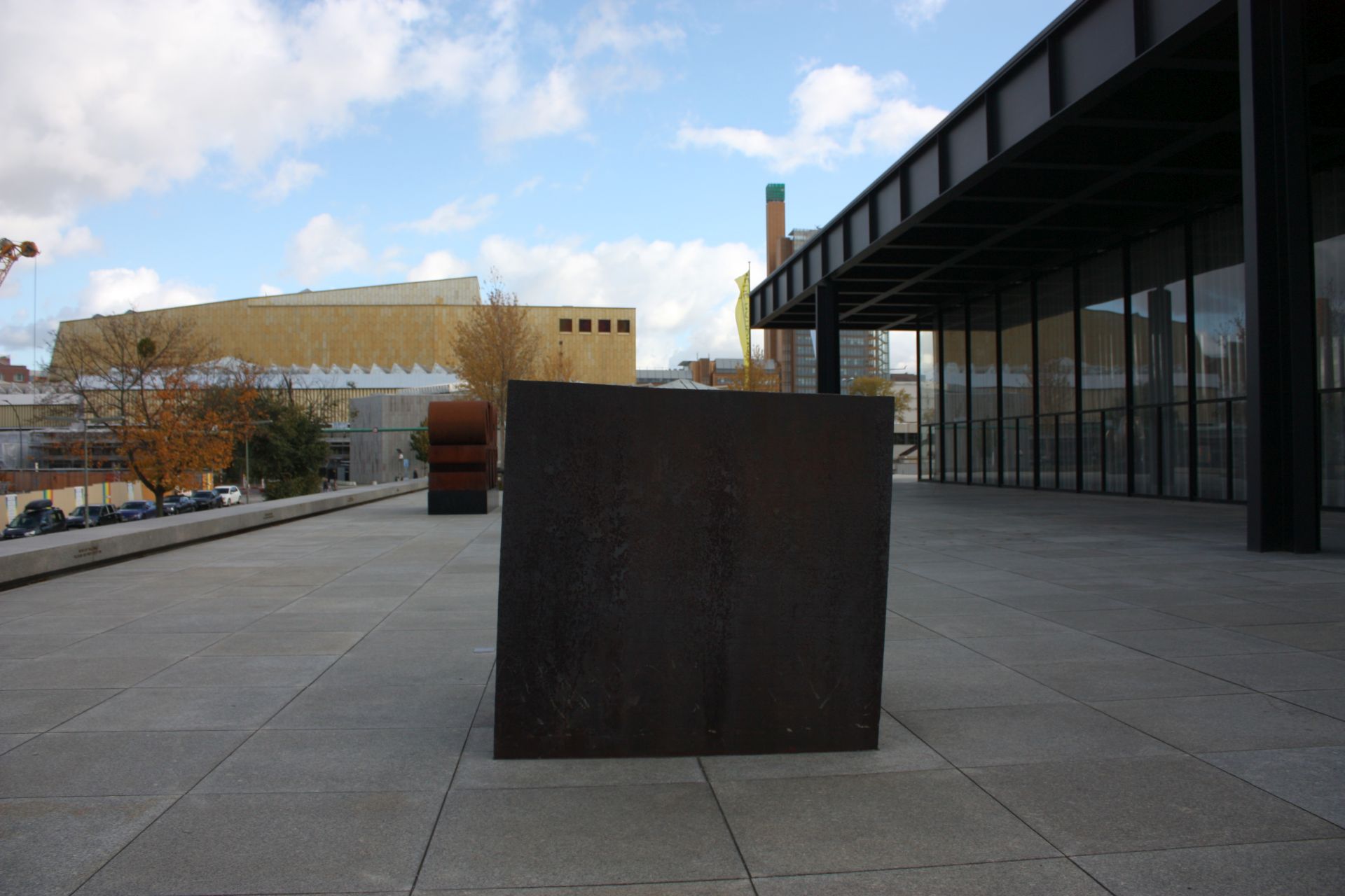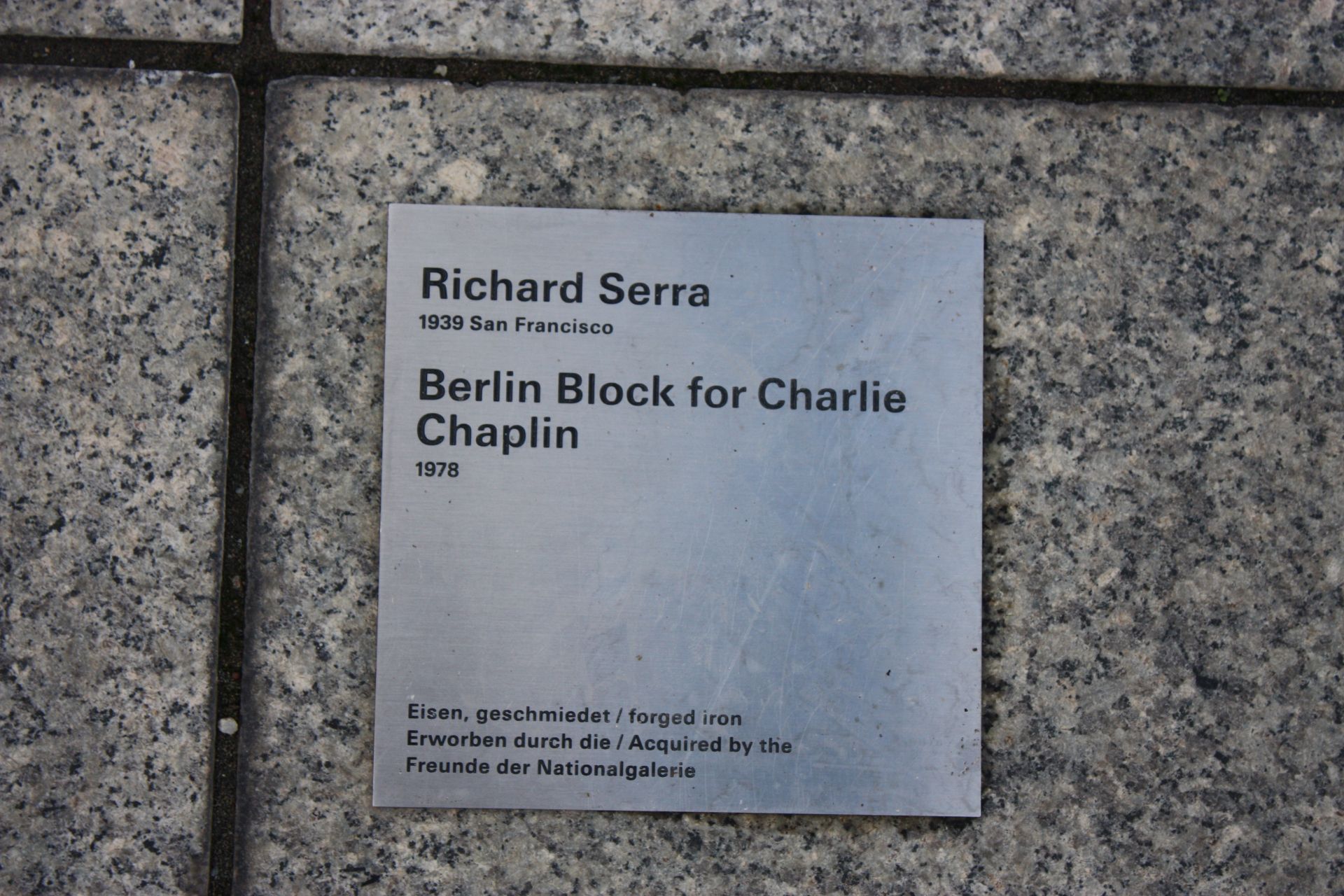 Bei der Plastik „Berlin Block vor Charlie Chaplin“ handelt es sich um einen massiven Stahlwürfel mit einem Gewicht von 70 Tonnen. Die künstlich korrodierte Oberfläche hat einen dunklen rotbraunen Farbton. Einziges Gestaltungselement, das die provozierende Einfachheit des Kunstwerkes durchbricht, ist ihre Neigung um wenige Grade hin zur Neuen Nationalgalerie. Der schwere Block scheint in die Terrasse einzusinken. Mit dem Gegensatz „schwerer kompakter Block“ versus „instabiler Stand“ wurde ein gewisser Slap-Stick-Charakter gemeint und in diesem Sinne ist der Hinweis im Titel auf den Schauspieler und Regisseur Charlie Chaplin gemeint (Vgl. Museumsführer Nationalgalerie). (Susanne Kähler/Jörg Kuhn)