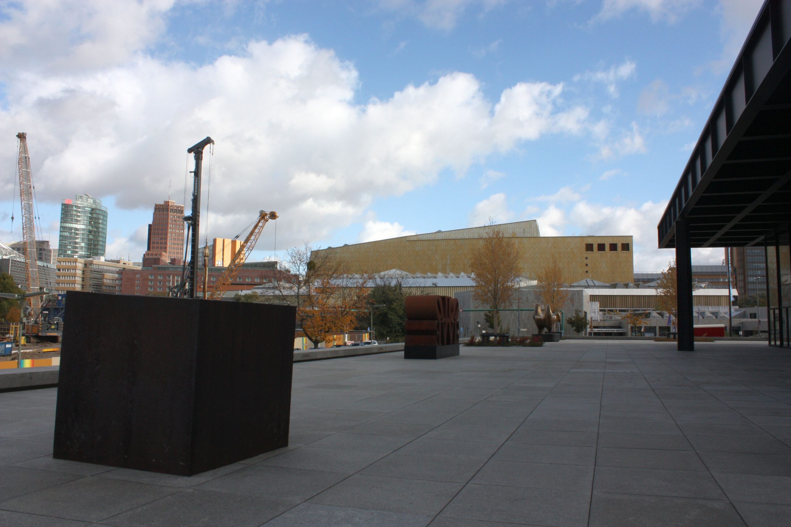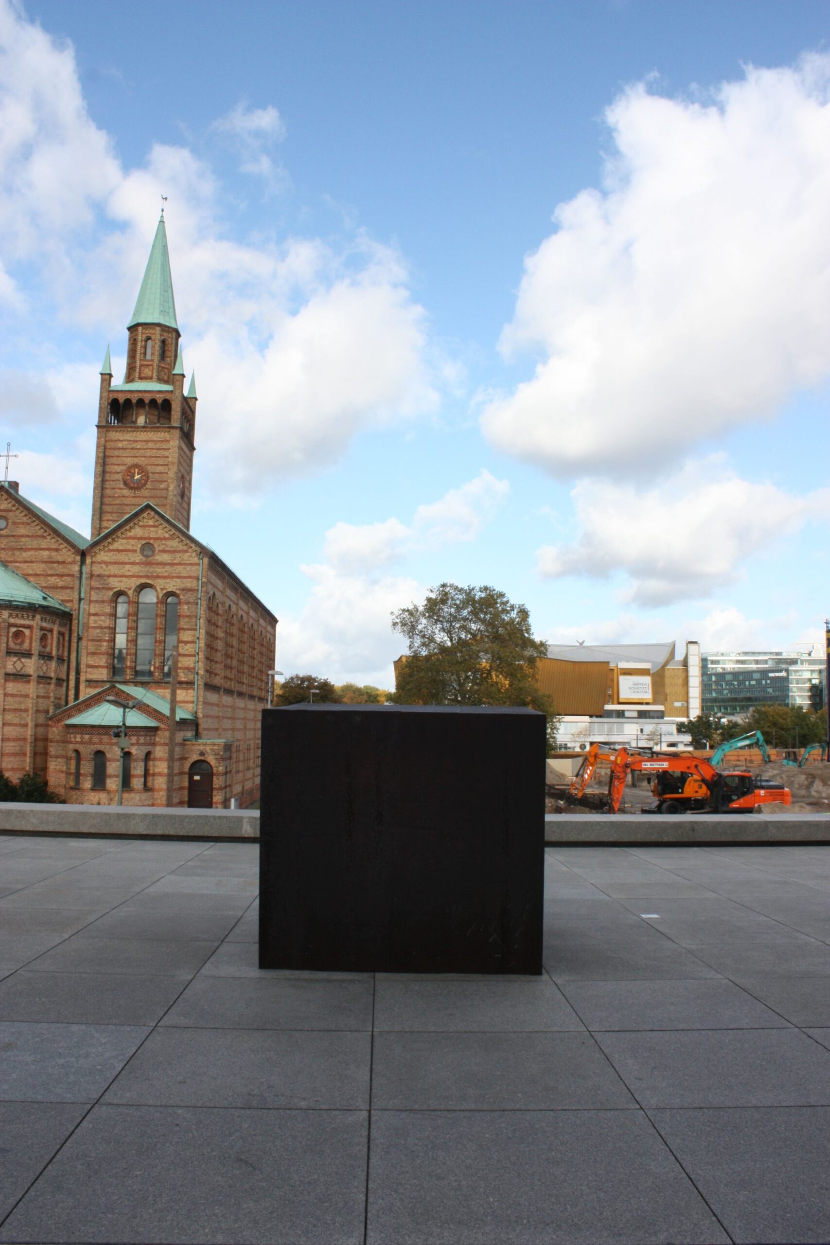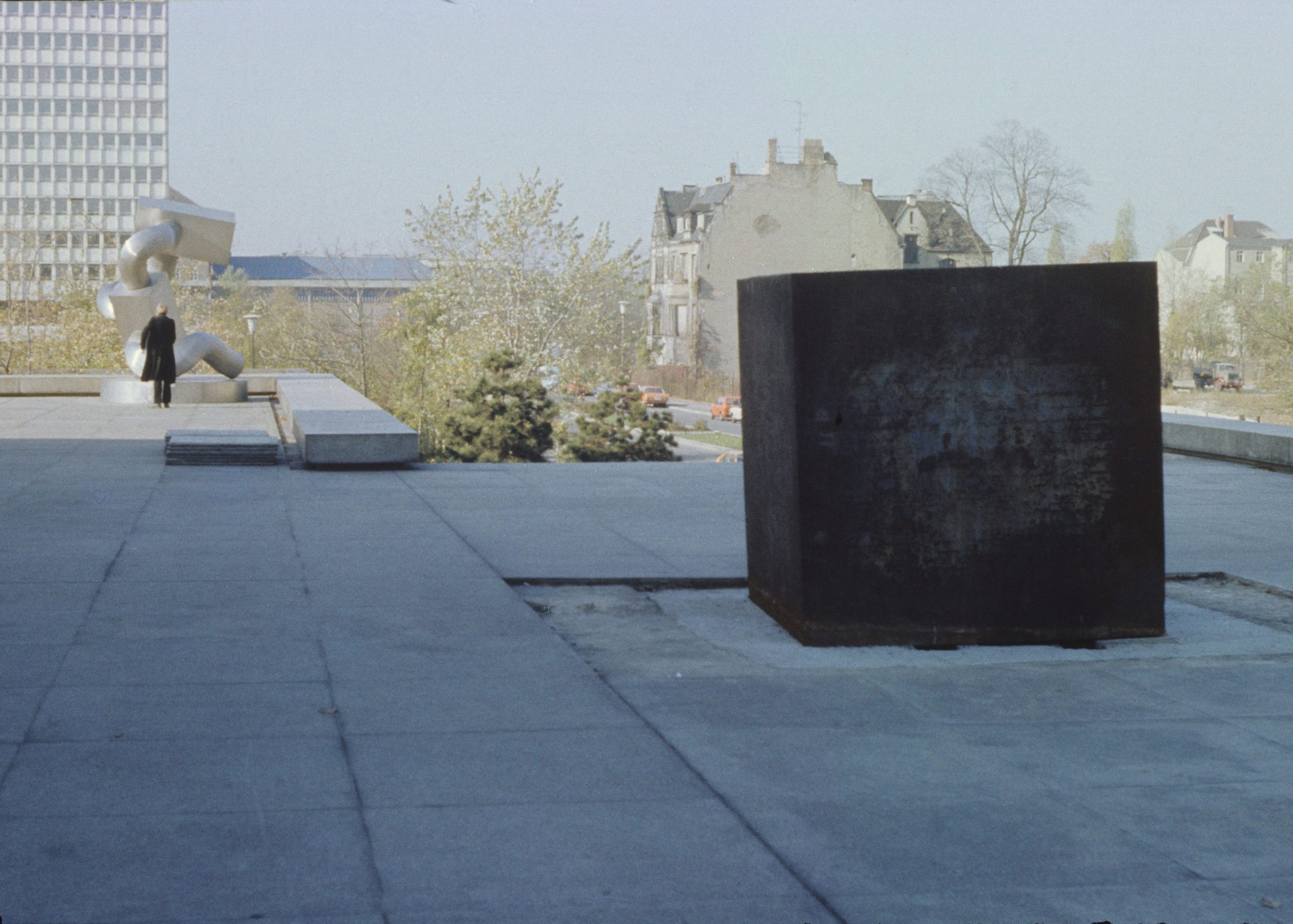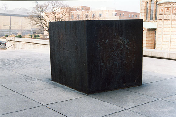 Bei der Plastik „Berlin Block vor Charlie Chaplin“ handelt es sich um einen massiven Stahlwürfel mit einem Gewicht von 70 Tonnen. Die künstlich korrodierte Oberfläche hat einen dunklen rotbraunen Farbton. Einziges Gestaltungselement, das die provozierende Einfachheit des Kunstwerkes durchbricht, ist ihre Neigung um wenige Grade hin zur Neuen Nationalgalerie. Der schwere Block scheint in die Terrasse einzusinken. Mit dem Gegensatz „schwerer kompakter Block“ versus „instabiler Stand“ wurde ein gewisser Slap-Stick-Charakter gemeint und in diesem Sinne ist der Hinweis im Titel auf den Schauspieler und Regisseur Charlie Chaplin gemeint (Vgl. Museumsführer Nationalgalerie). (Susanne Kähler/Jörg Kuhn)