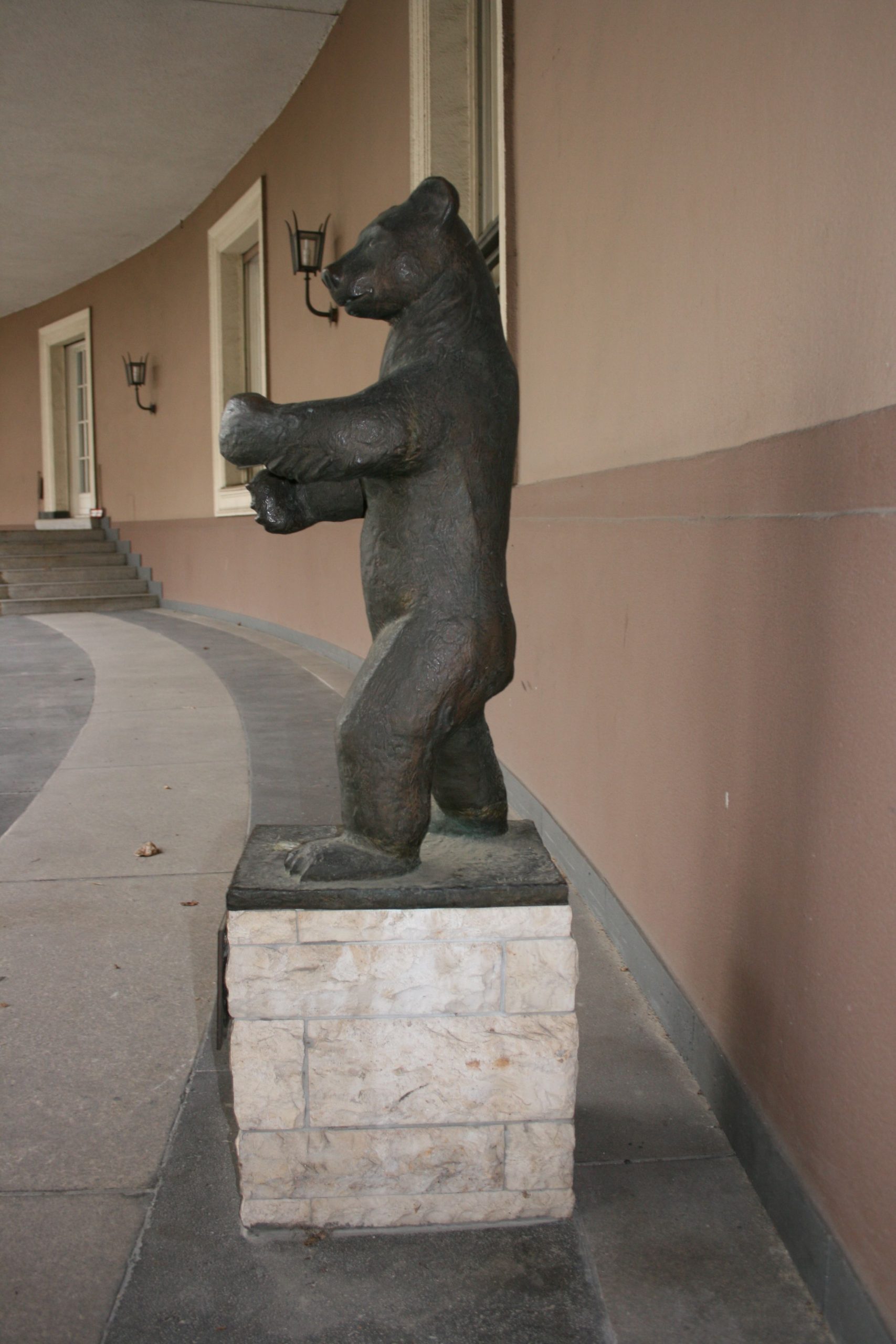 Auf rechteckiger Plinthe steht in aufrechter, leicht in der Achse gedrehter Haltung ein Bär in Schrittstellung, den Kopf leicht zur Seite gedreht. Am Sockel eine rechteckige Inschriftentafel (Susanne Kähler, Jörg Kuhn).